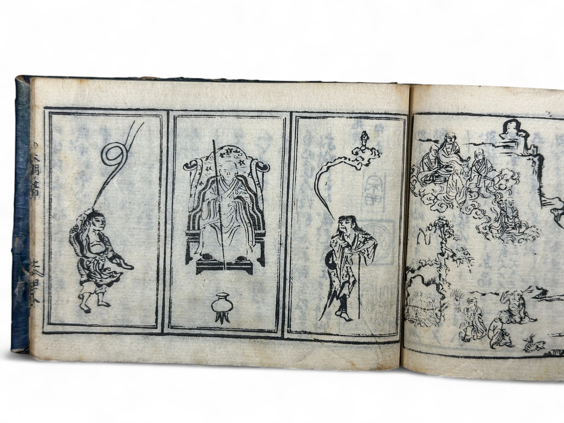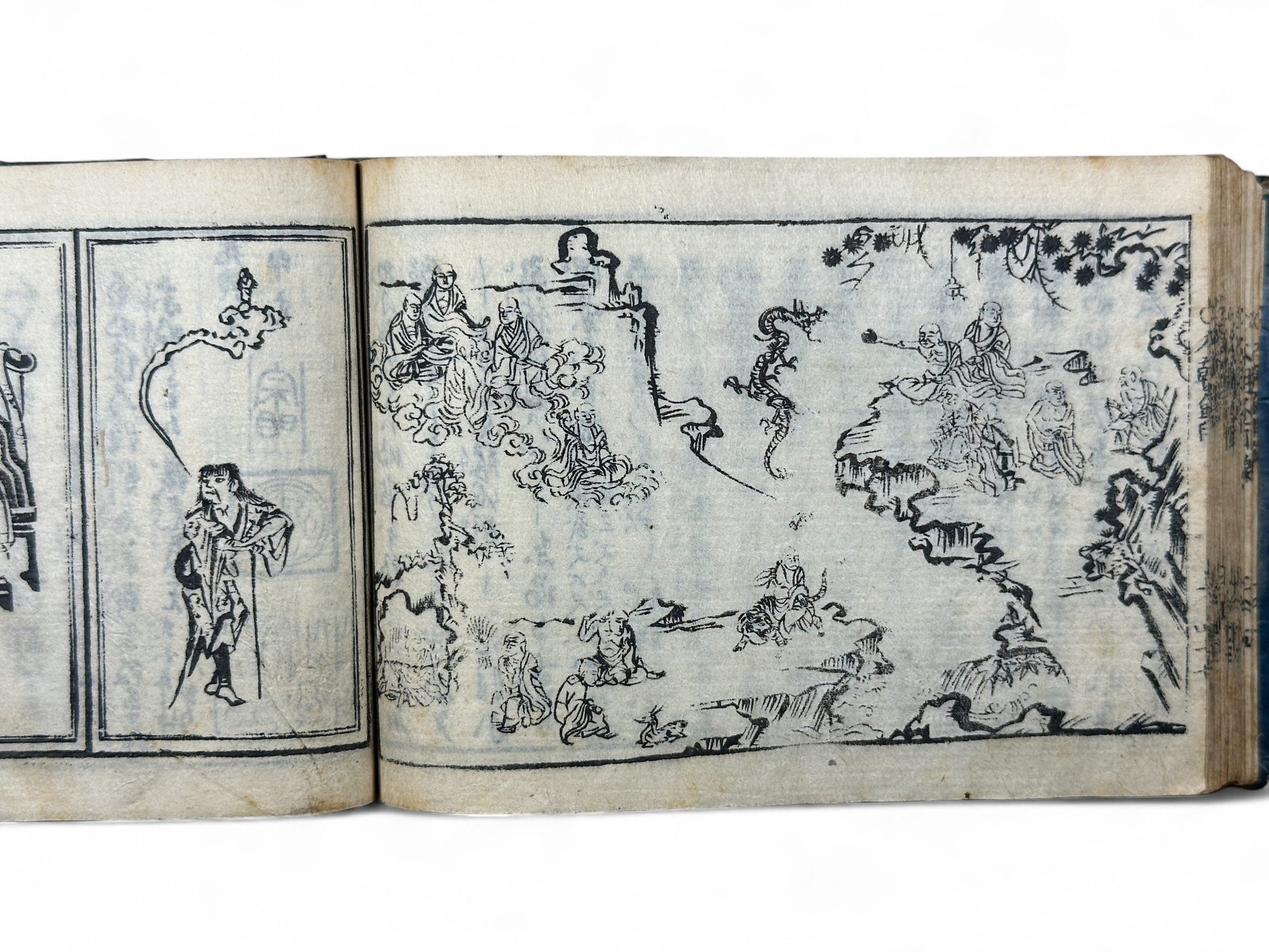 Scenes portray philosophical dialogues, moments of devotion, and mythic encounters between humans and celestial beings — a synthesis of Confucian, Buddhist, and Shinto imagery that shaped Edo intellectual life.
