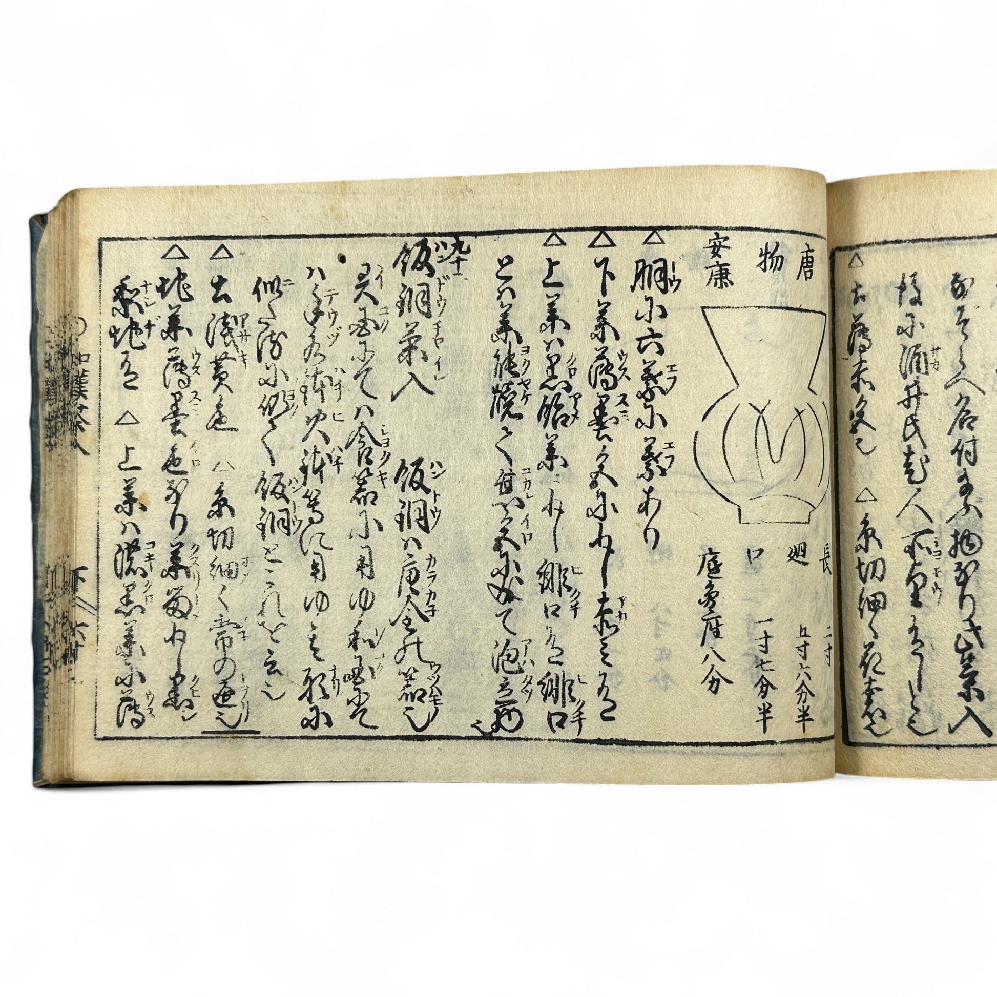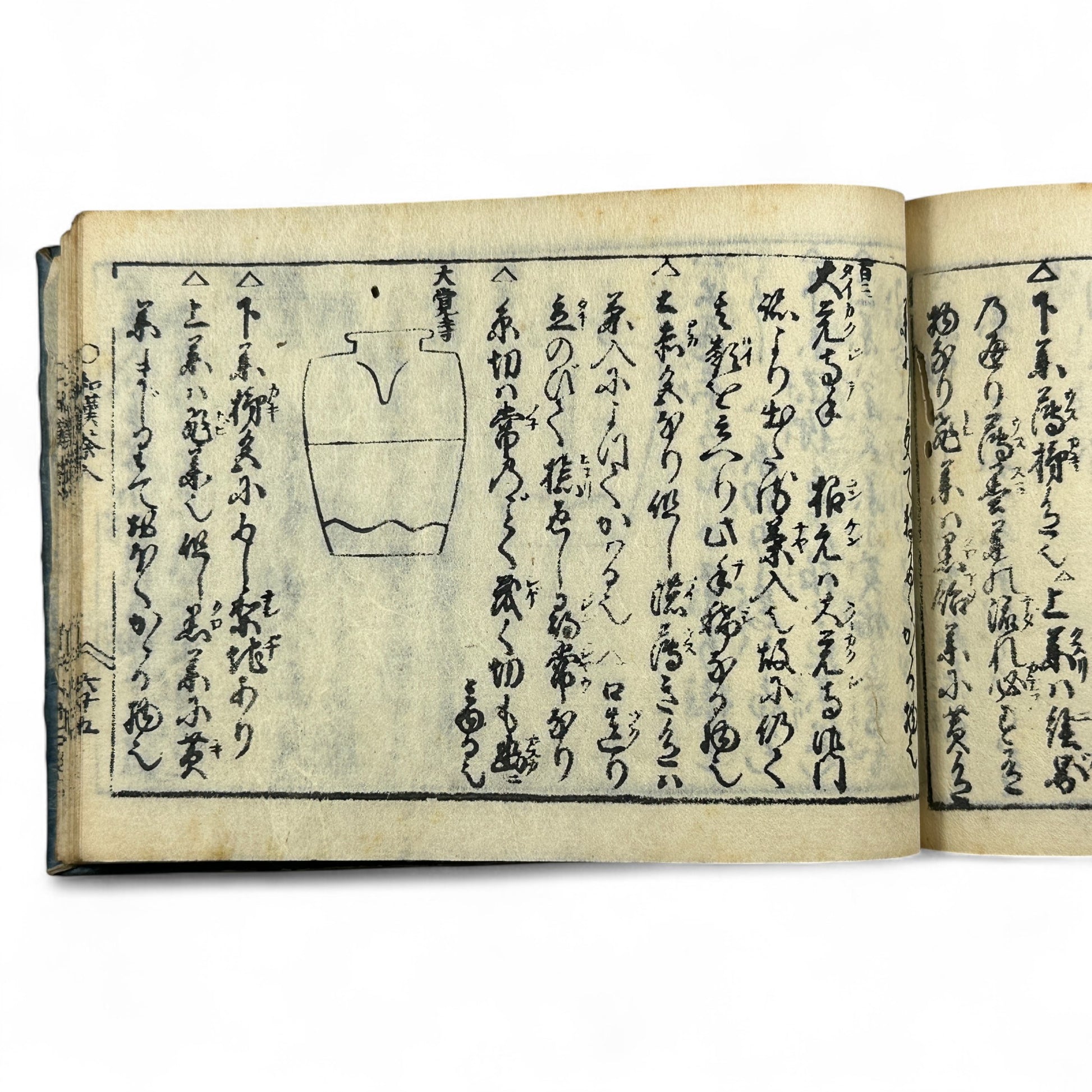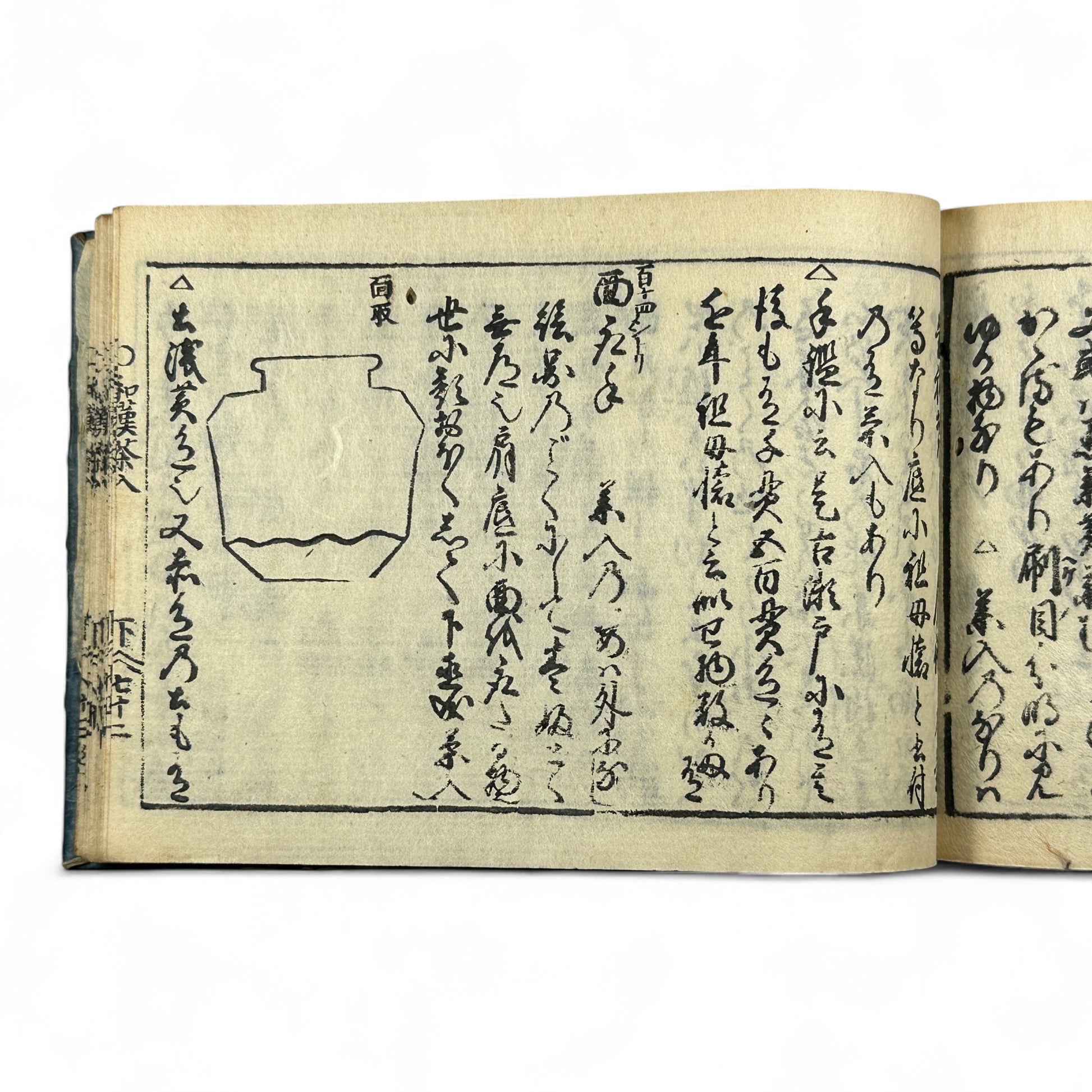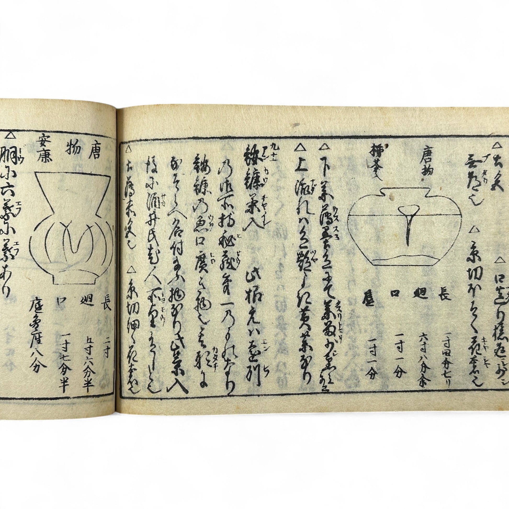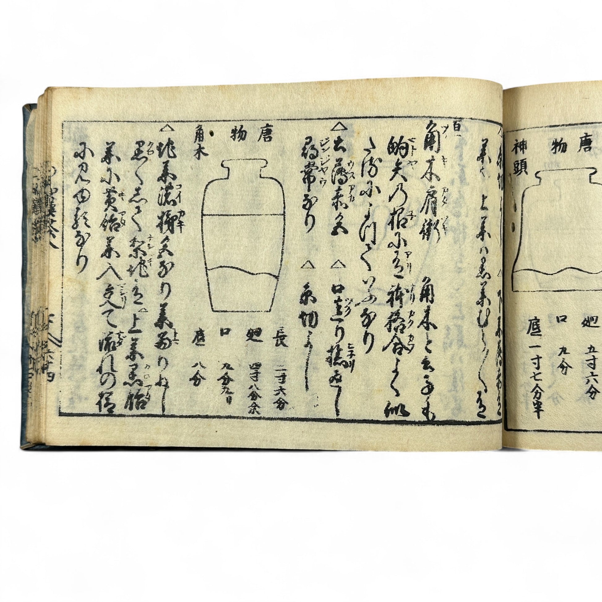 This beautifully bound fukurotoji (thread-bound) volume serves as a visual and textual encyclopedia of tea ceremony utensils, ceramics, scholar’s tools, and refined cultural arts. Its pages combine calligraphic annotations with precise woodblock illustrations, documenting the forms, proportions, and symbolism of traditional objects used in daily and ceremonial life — from tea jars and bowls to inkstones, scroll boxes, and incense burners.