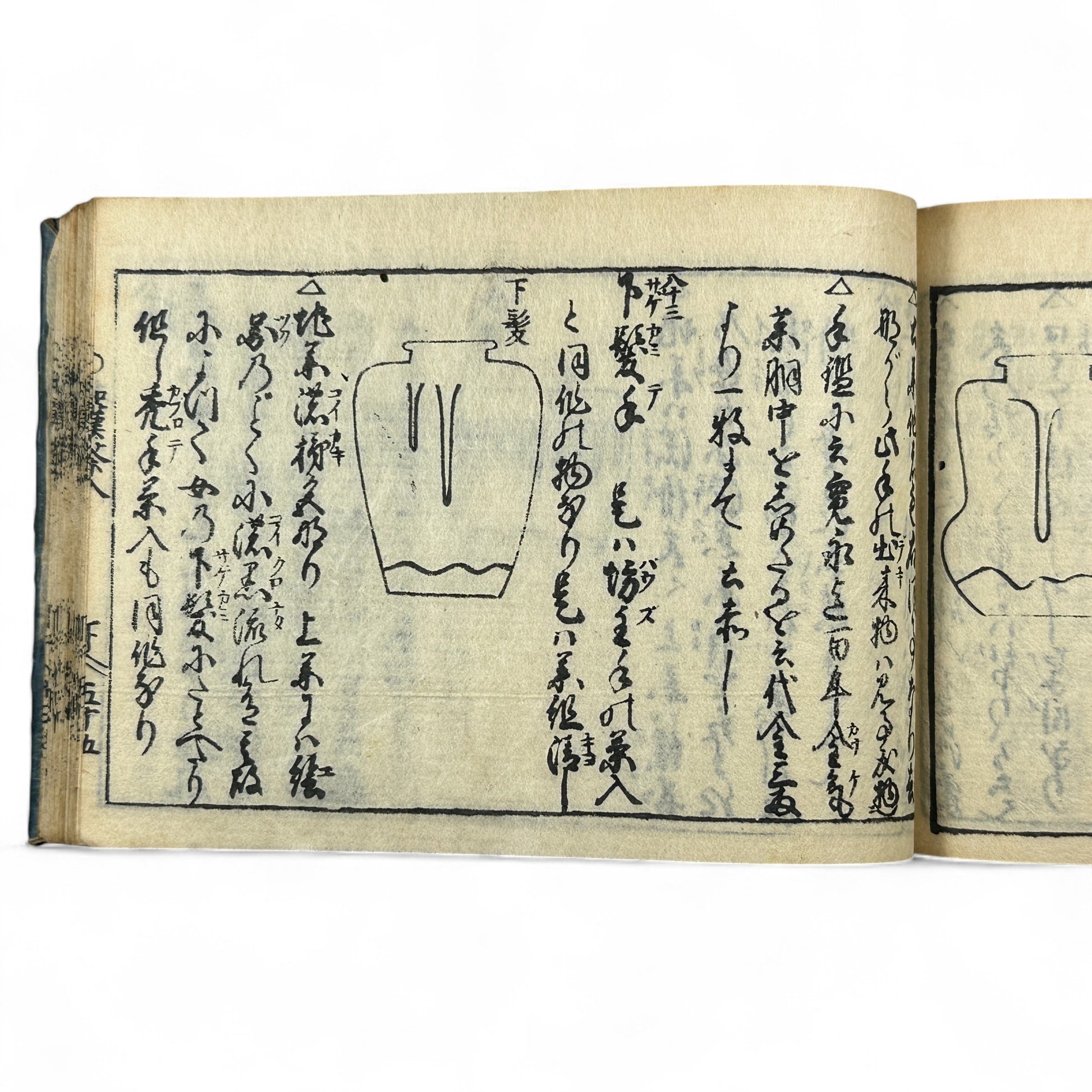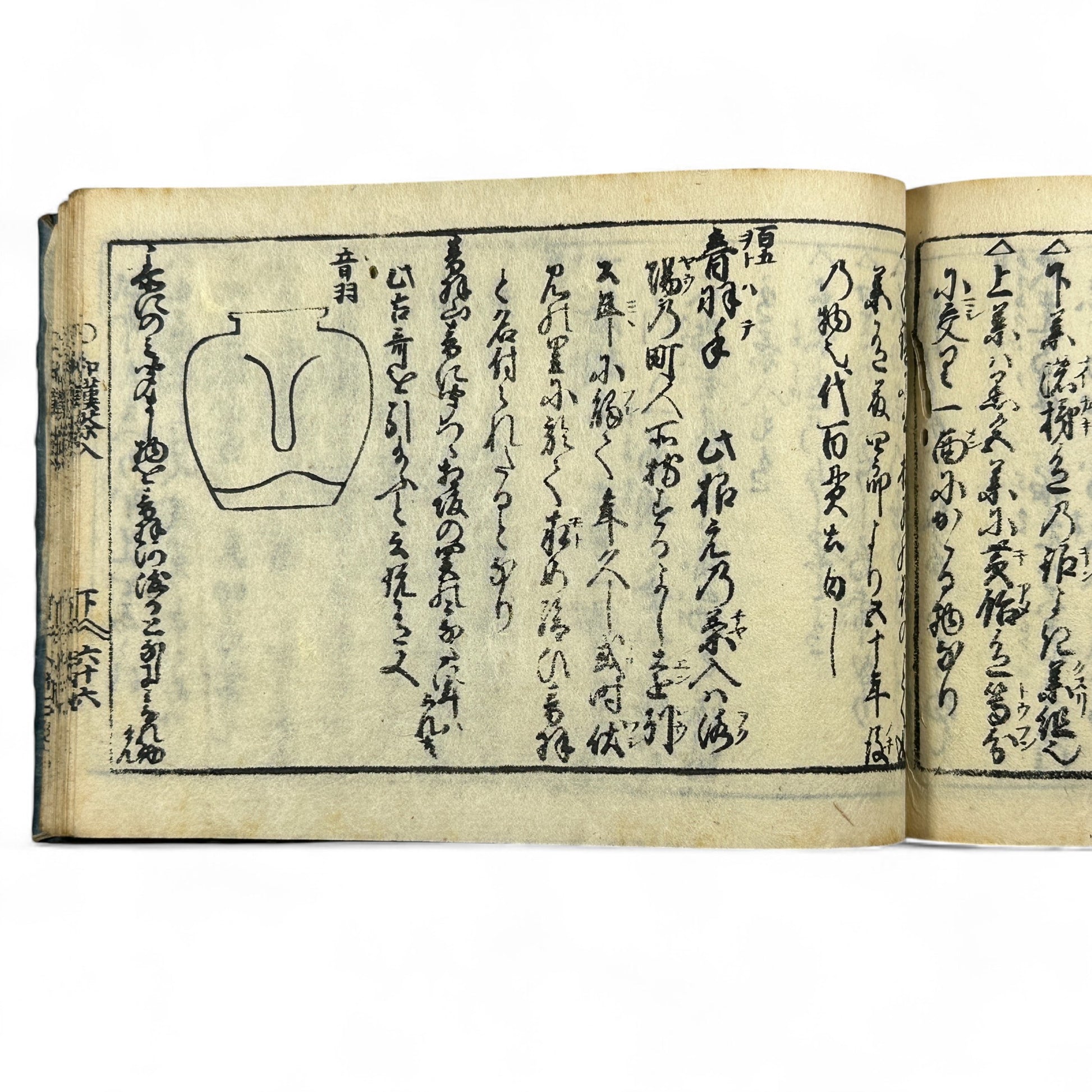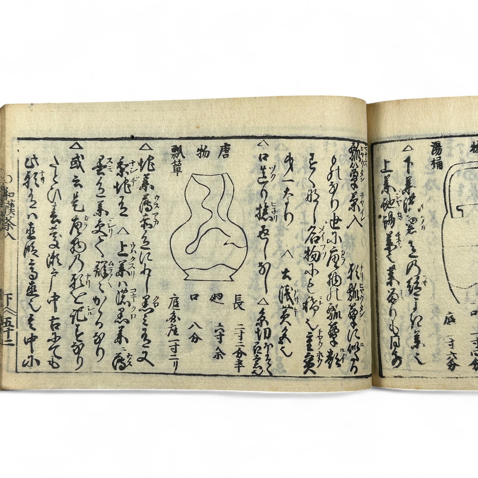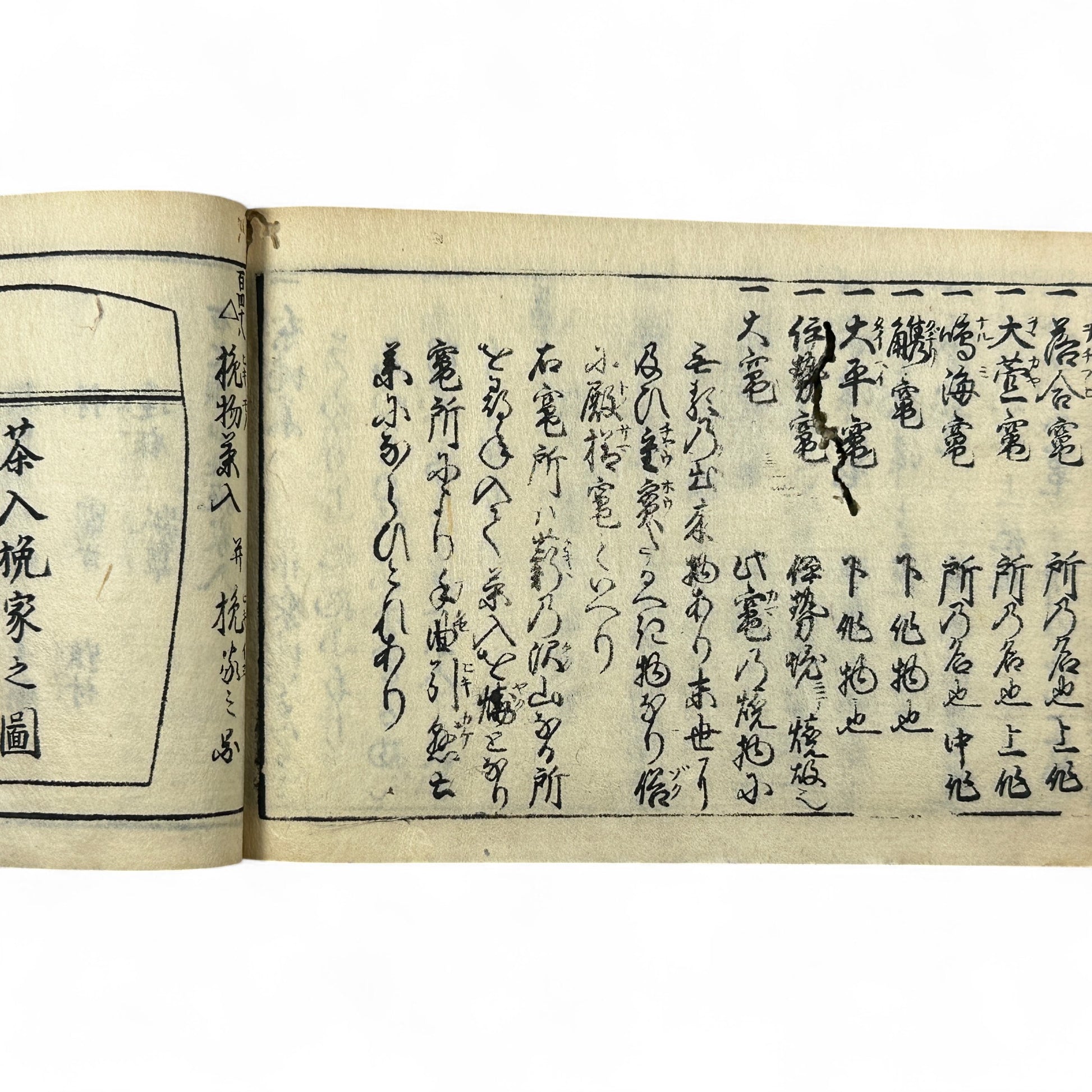 This beautifully bound fukurotoji (thread-bound) volume serves as a visual and textual encyclopedia of tea ceremony utensils, ceramics, scholar’s tools, and refined cultural arts. Its pages combine calligraphic annotations with precise woodblock illustrations, documenting the forms, proportions, and symbolism of traditional objects used in daily and ceremonial life — from tea jars and bowls to inkstones, scroll boxes, and incense burners.