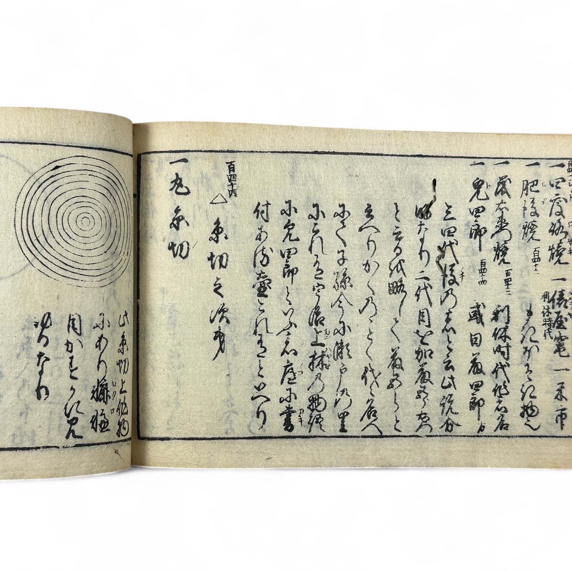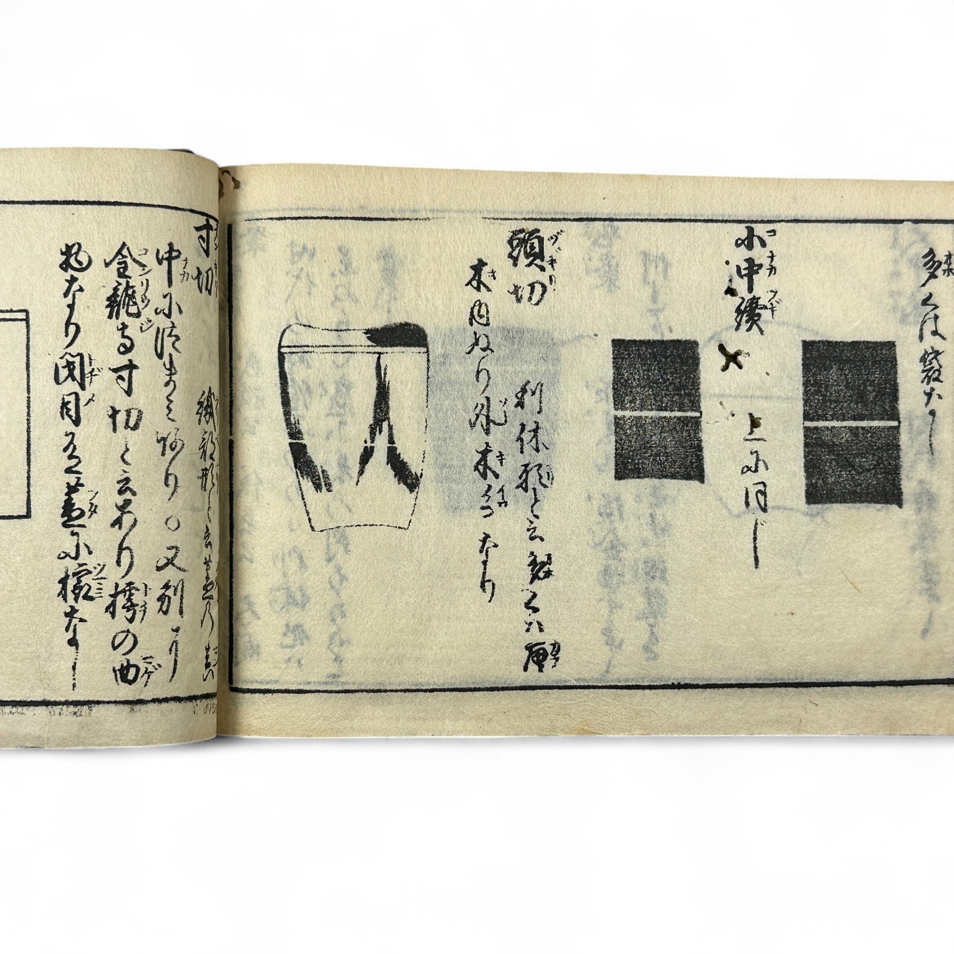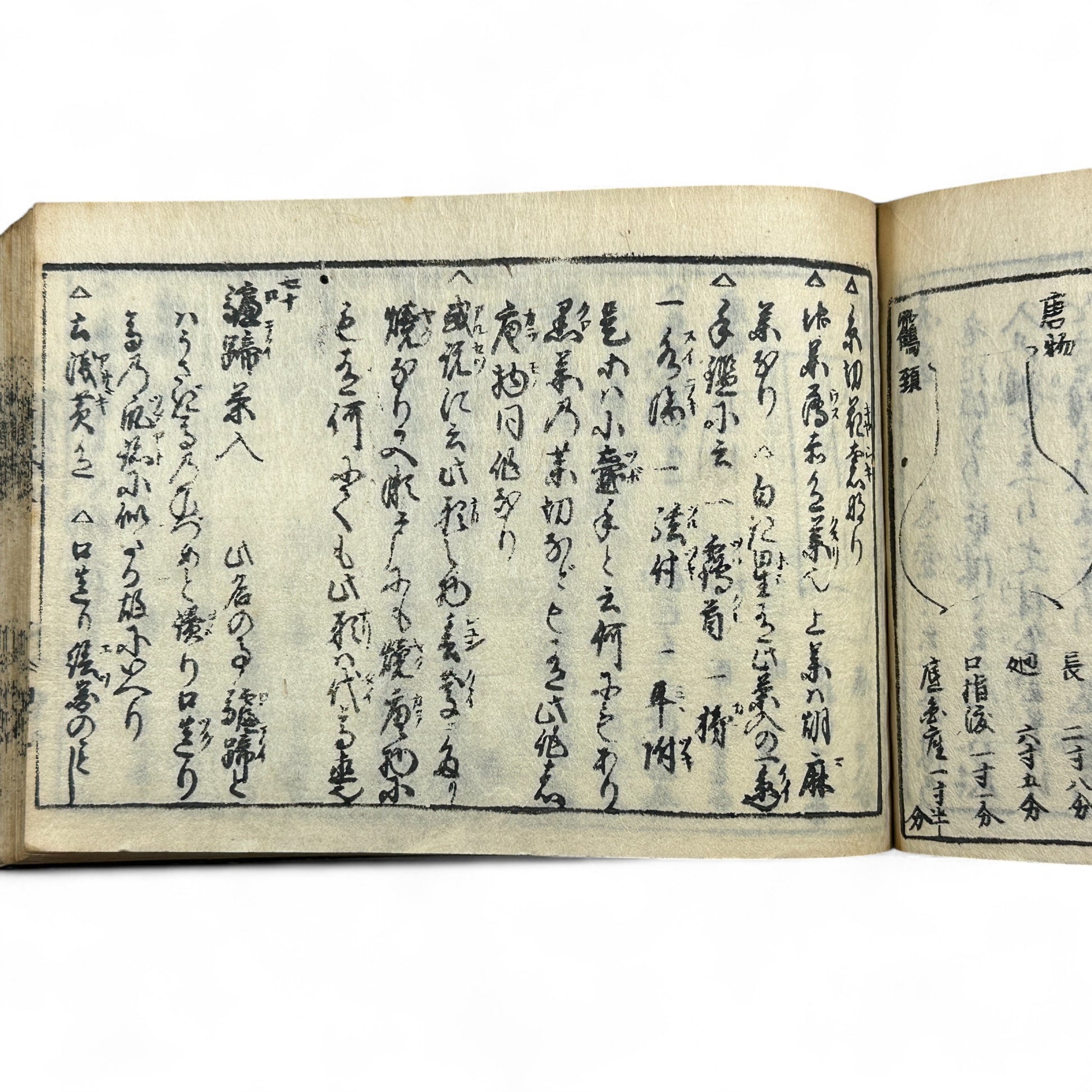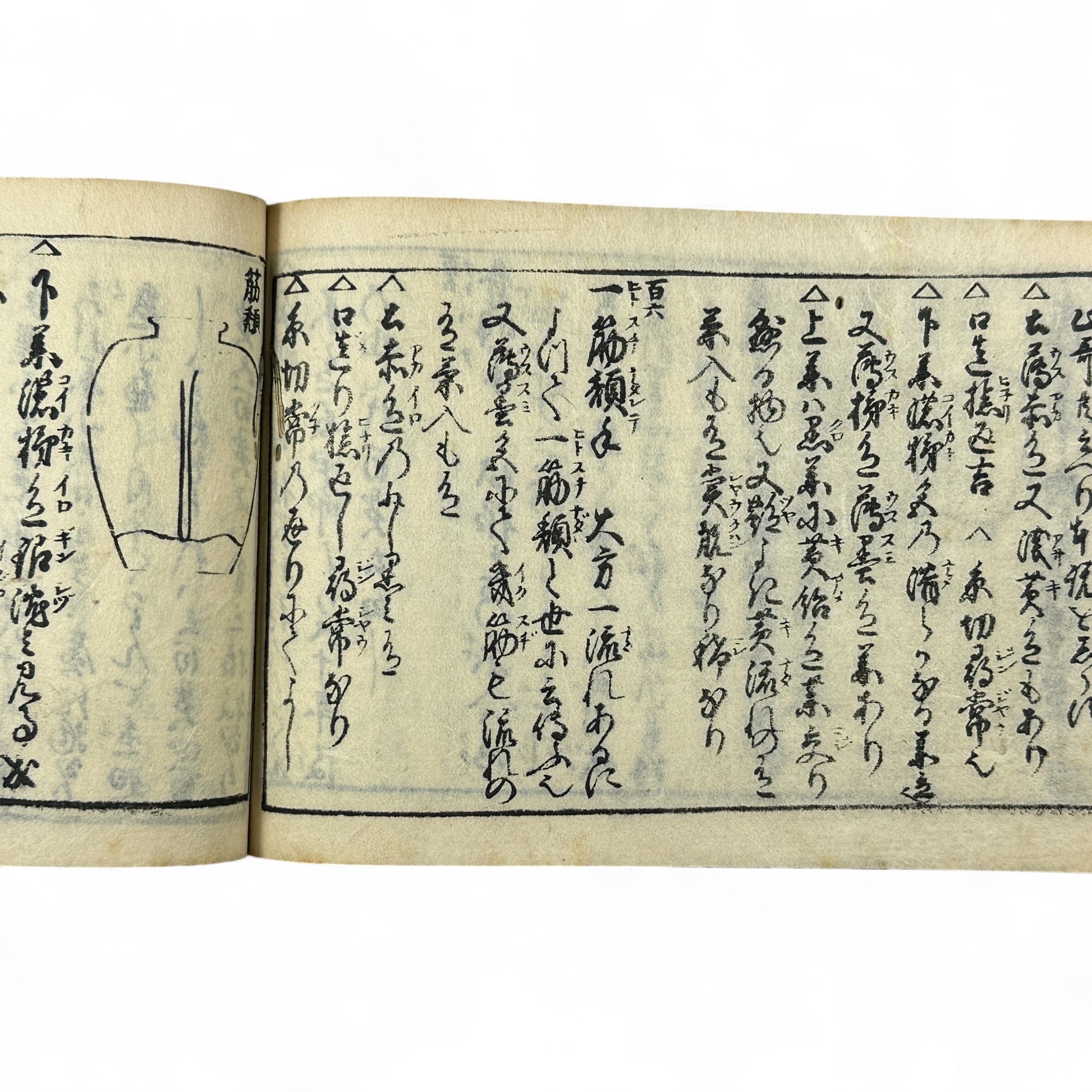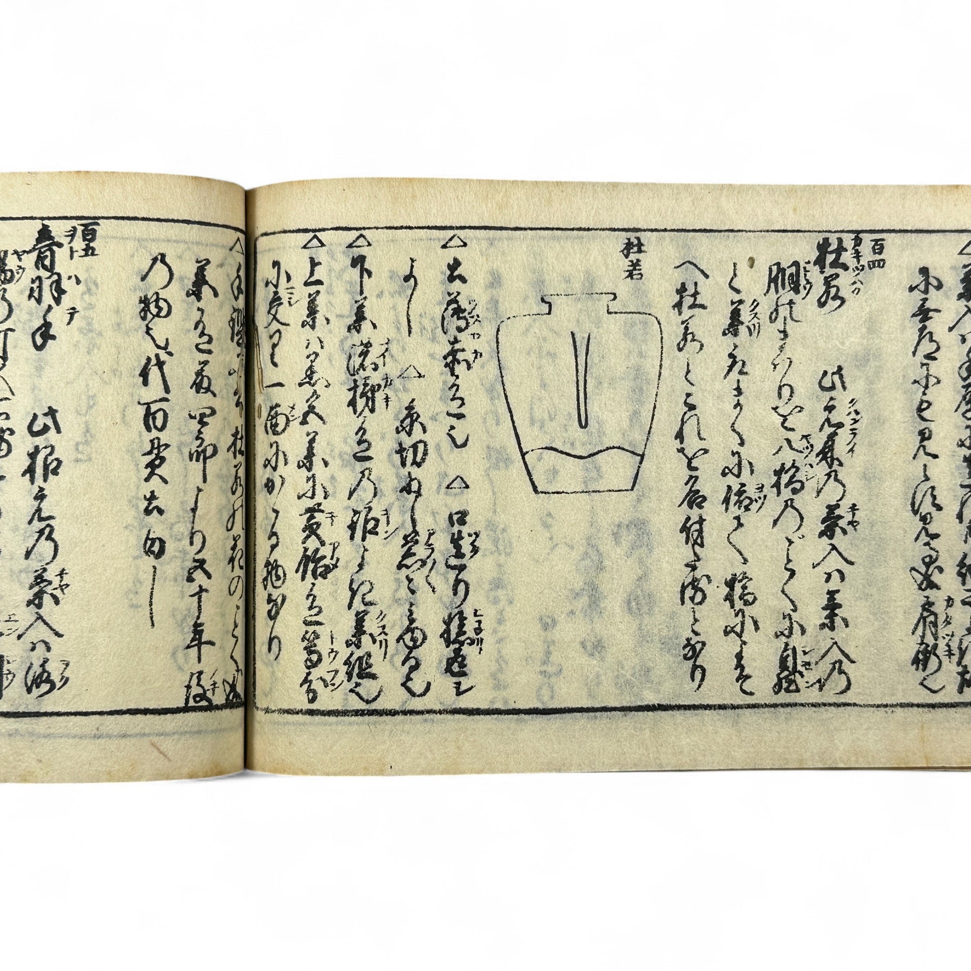 This beautifully bound fukurotoji (thread-bound) volume serves as a visual and textual encyclopedia of tea ceremony utensils, ceramics, scholar’s tools, and refined cultural arts. Its pages combine calligraphic annotations with precise woodblock illustrations, documenting the forms, proportions, and symbolism of traditional objects used in daily and ceremonial life — from tea jars and bowls to inkstones, scroll boxes, and incense burners.