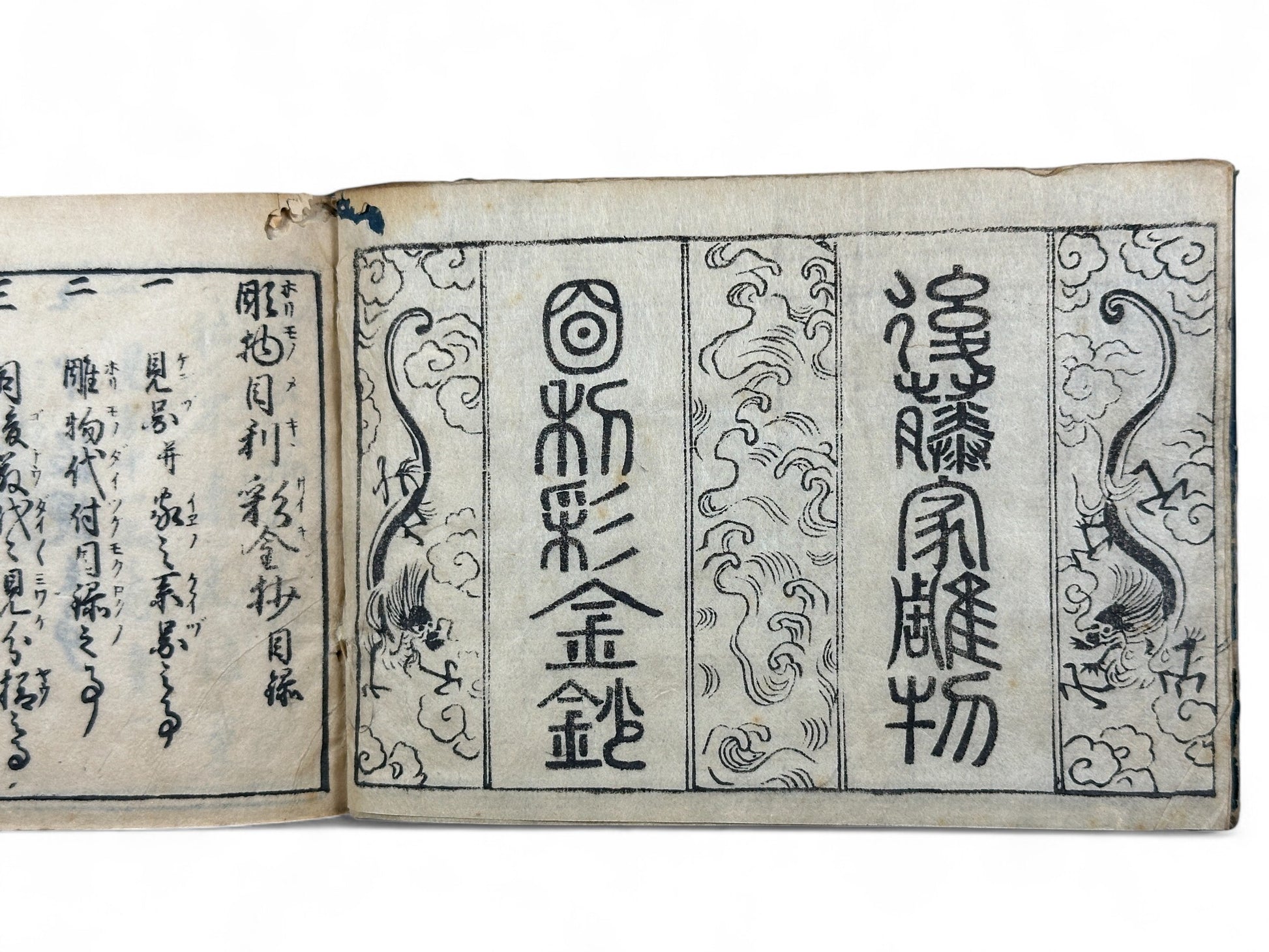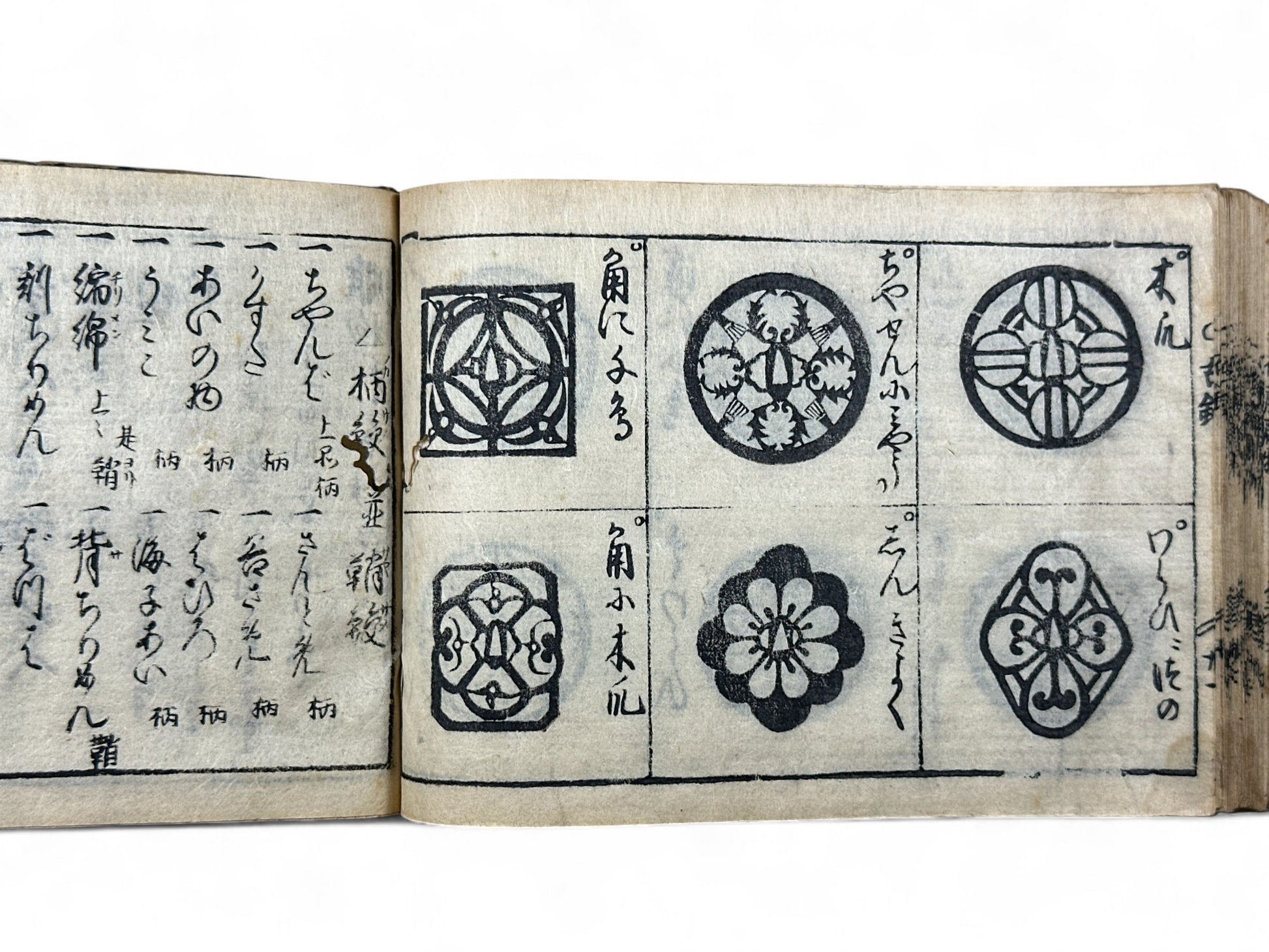 古今和漢萬寶全書 (Kokin Wakan Manpō Zensho) – Edo Period Japanese Woodblock Book – Metalwork & Crest Designs (Kamon) – Decorative Arts Encyclopedia – Rare Antique-B25