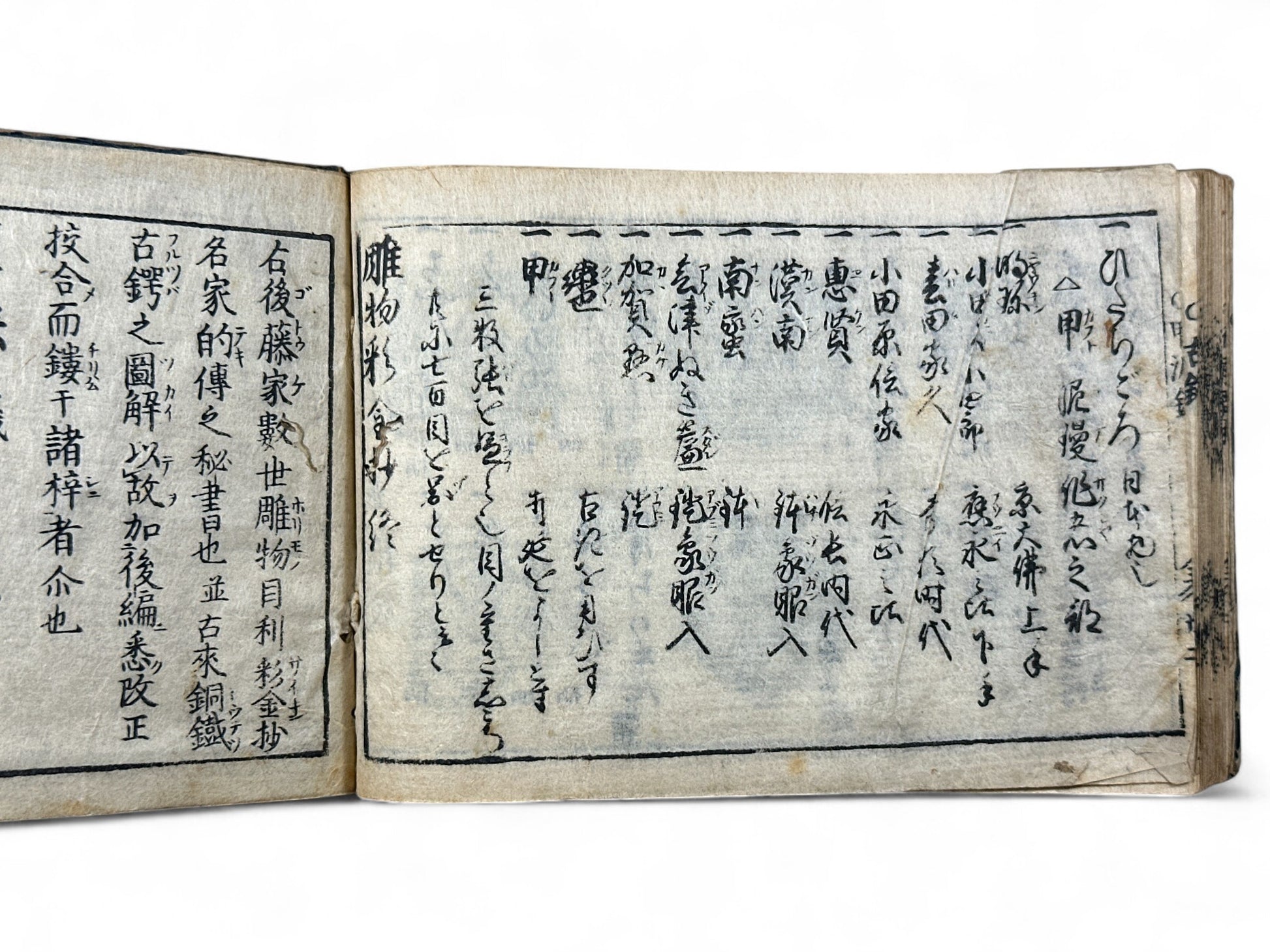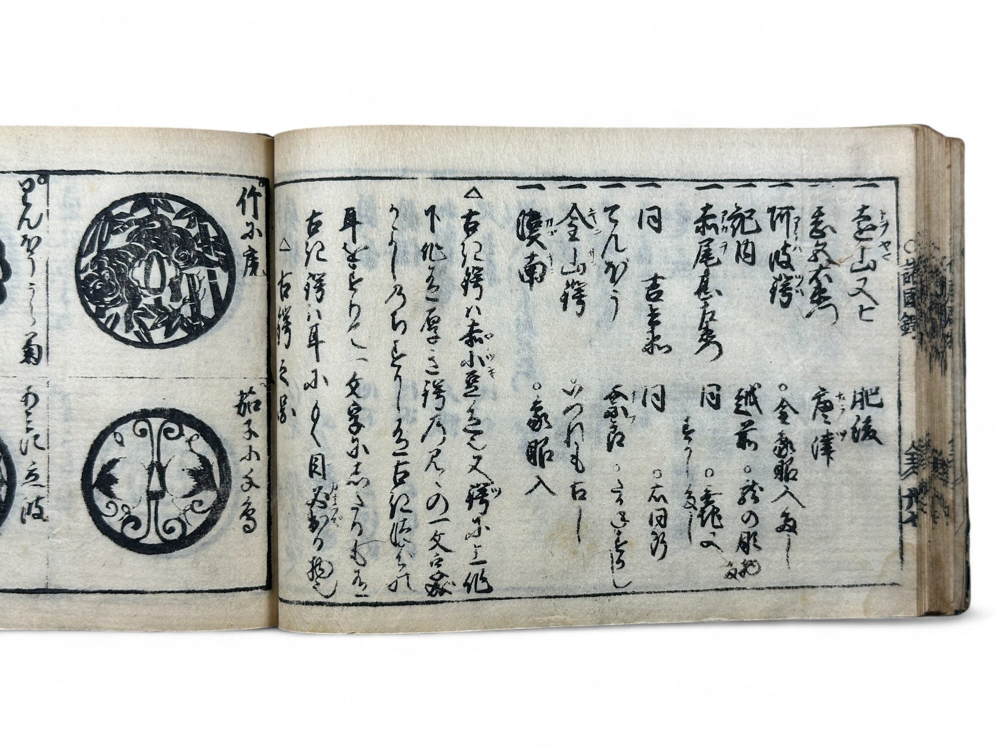 An exquisite Edo woodblock reference on metalwork and family crests, Kokin Wakan Manpō Zensho captures the refined craft of an age when art was both functional and philosophical.