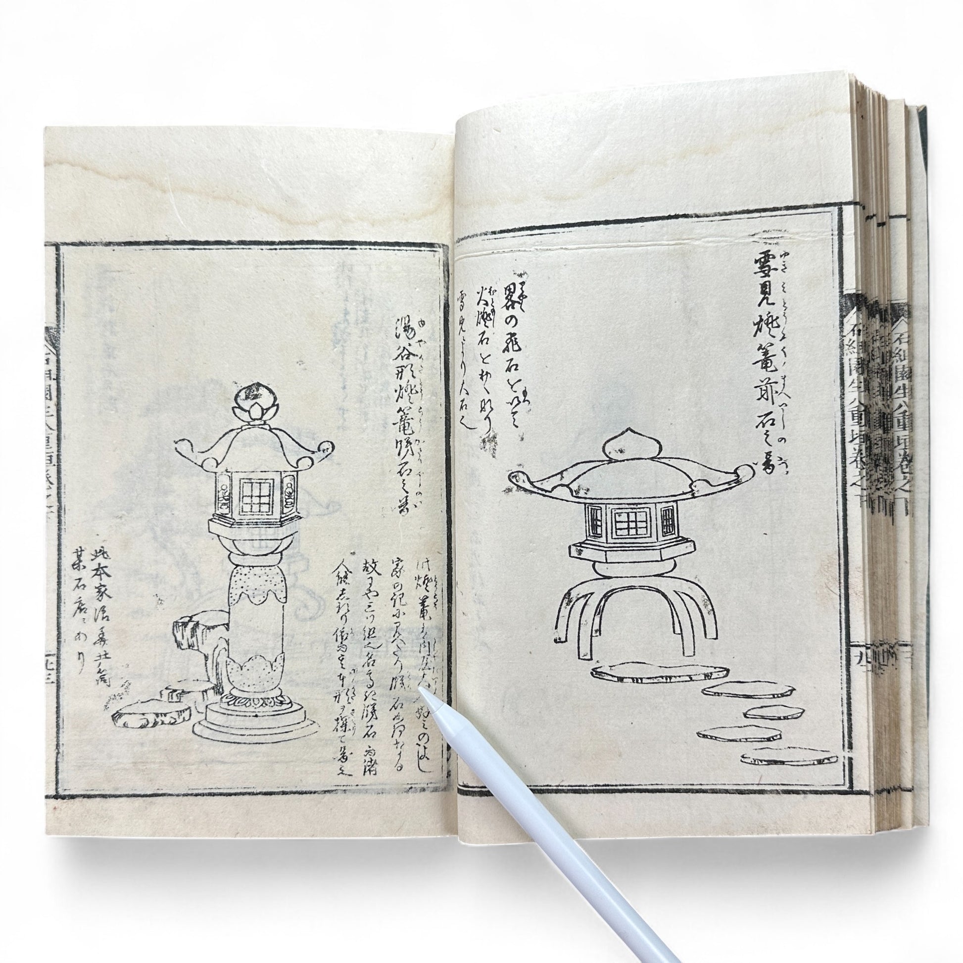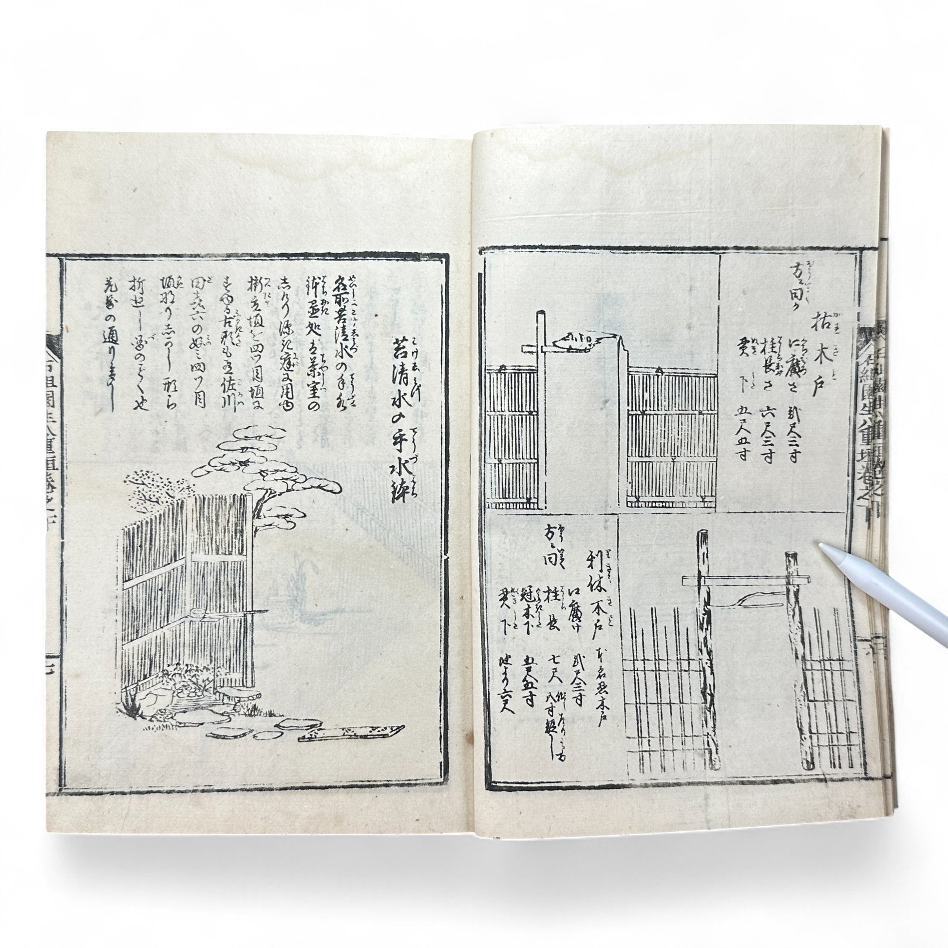 Published in the late Edo period (mid-19th century), this volume presents a comprehensive visual and textual guide to landscape composition, stone arrangement, water features, and garden structures such as bridges, gates, lanterns, and teahouses.