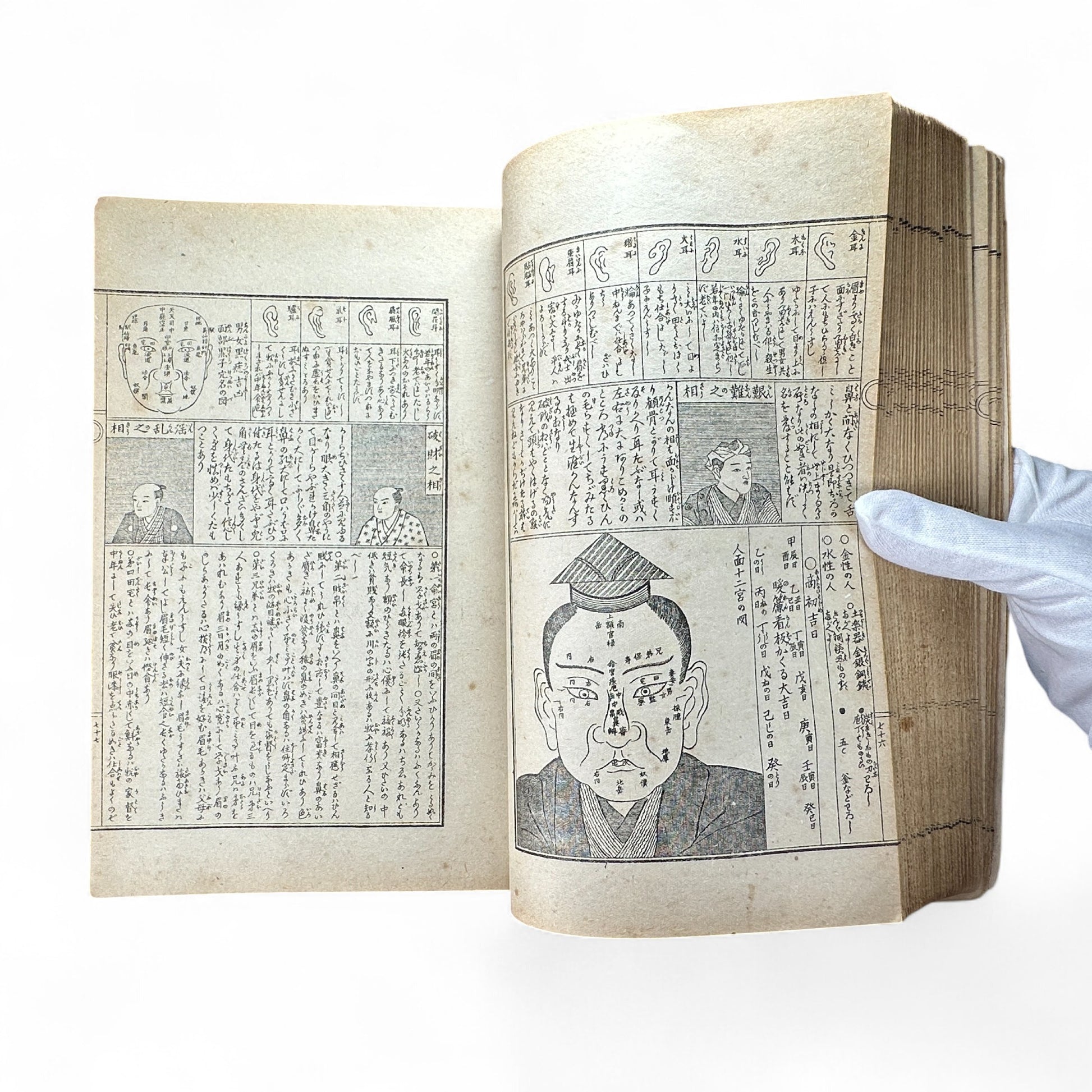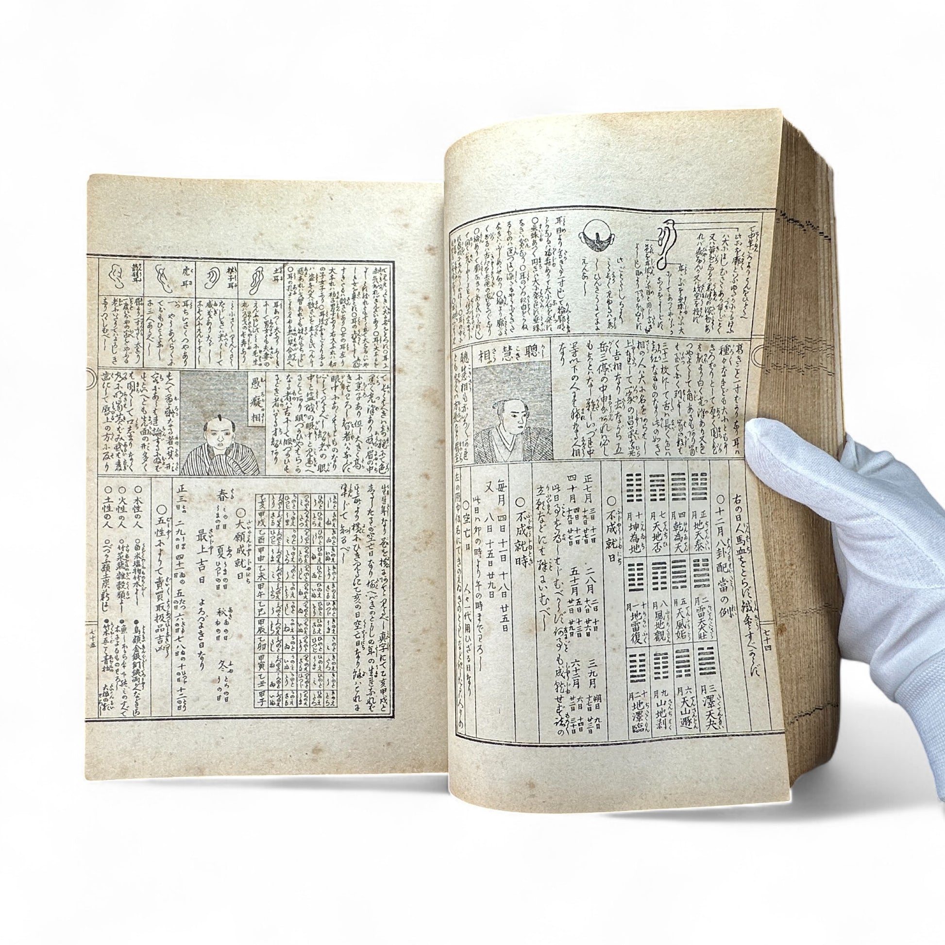 This woodblock-printed book is an extraordinary record of early Japanese thought, combining astrology, geomancy, astronomy, and physiognomy (face-reading). The pages are filled with intricate black-ink diagrams, celestial charts, and illustrated portraits demonstrating fortune-telling methods and human character interpretation.