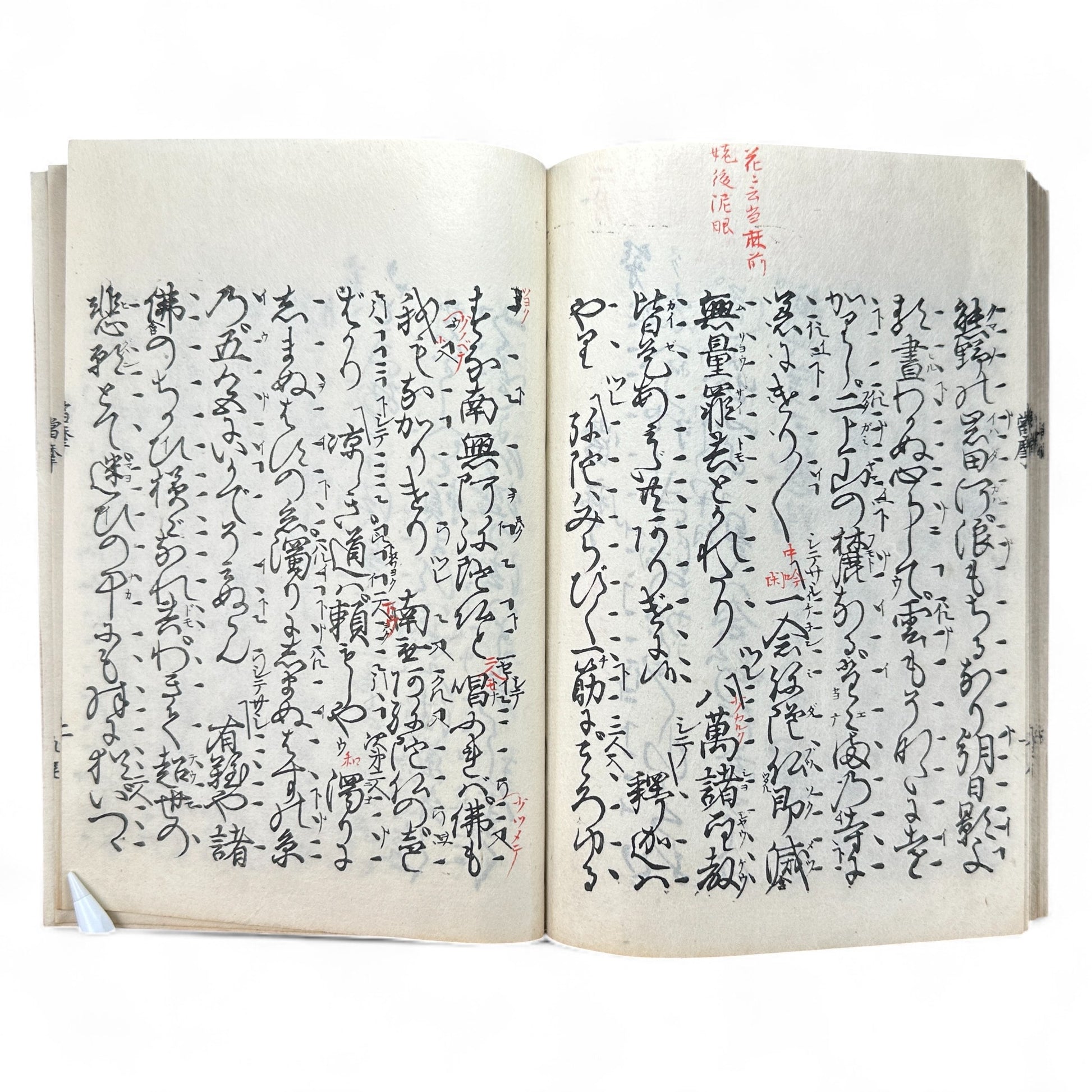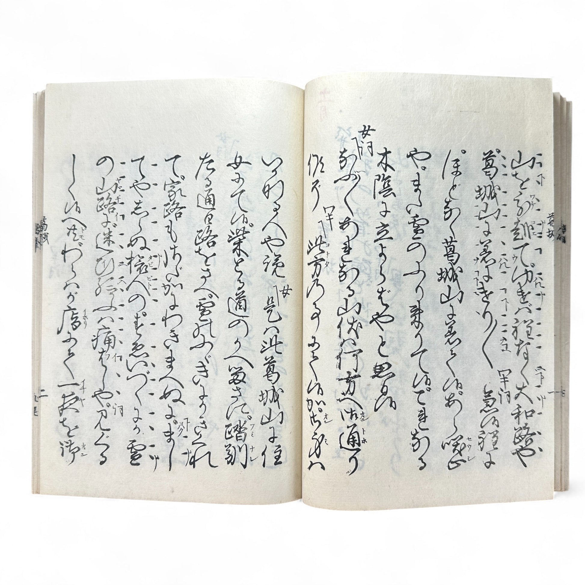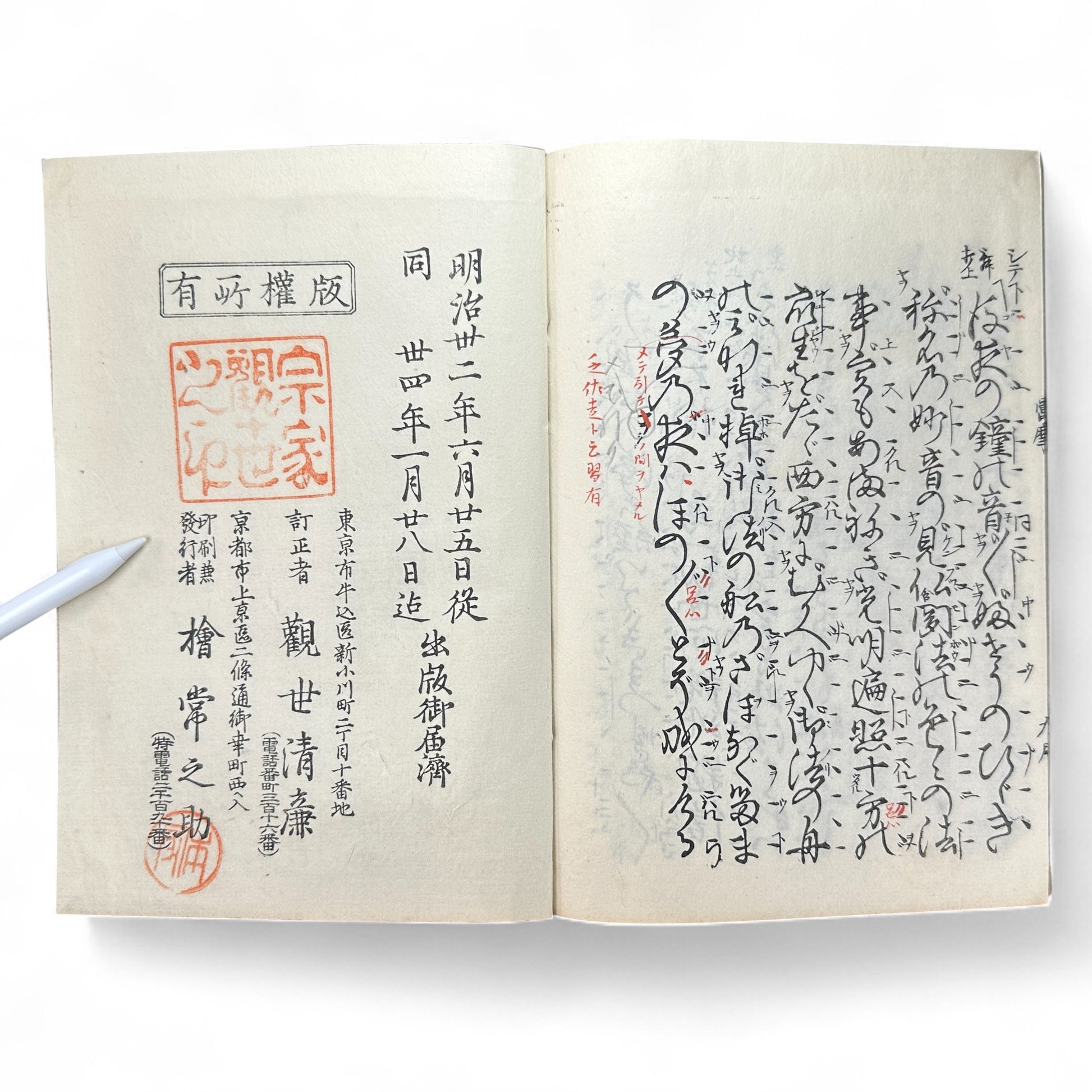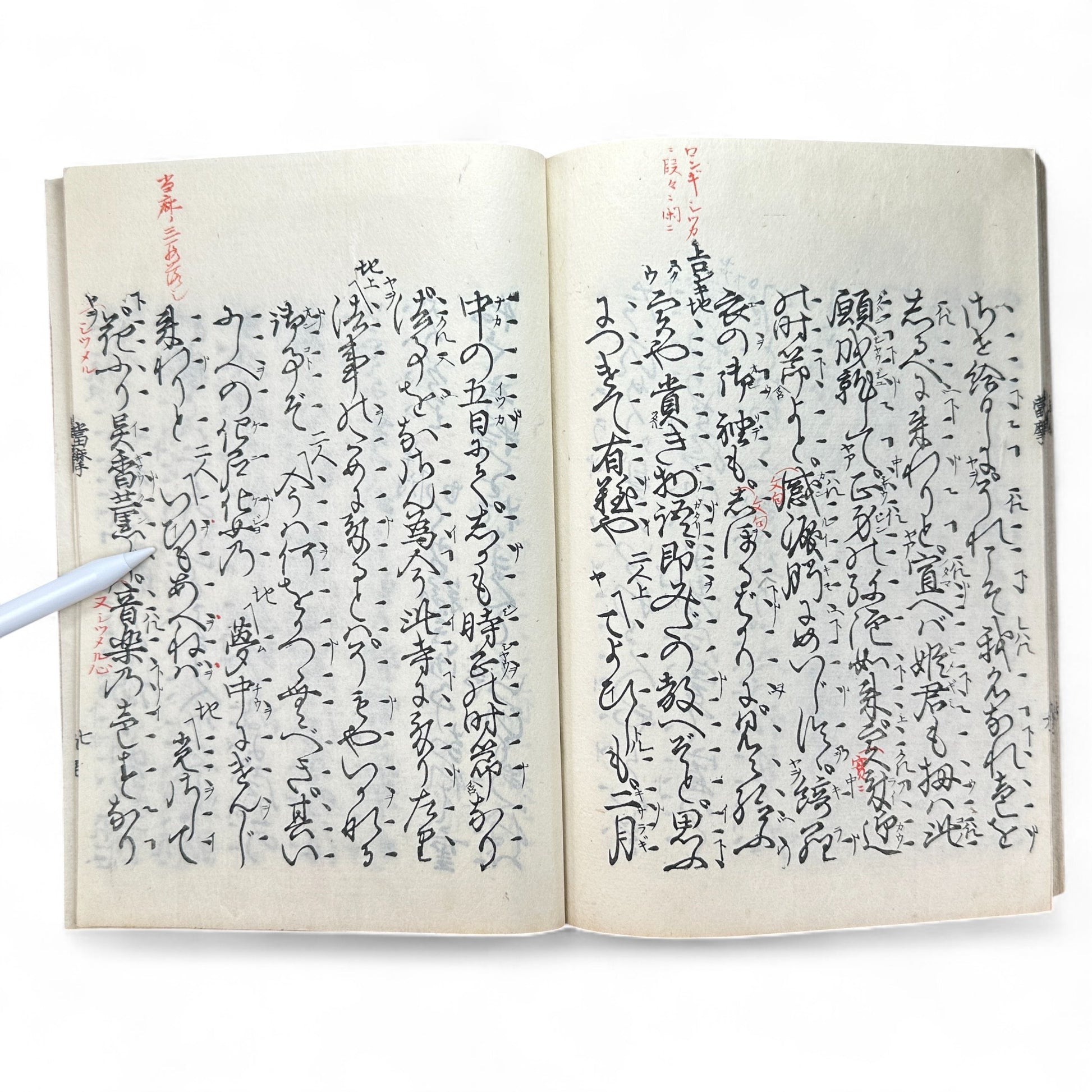 Beautifully handwritten in kuzushiji-style with red editorial notes, this work tells a refined tale of fashion, love, and daily life among kimono merchants and townspeople in Kyoto during Japan’s transition to modernity.