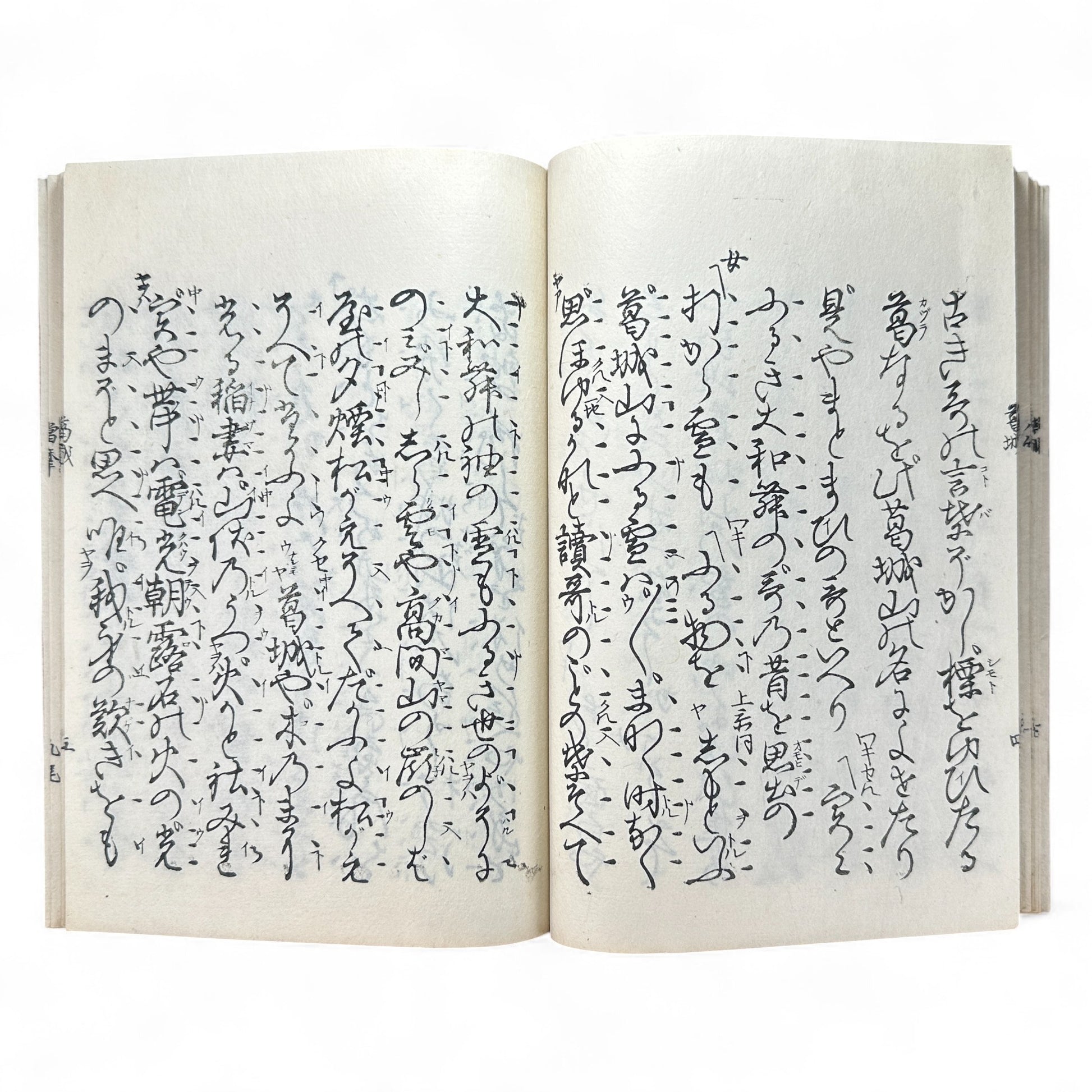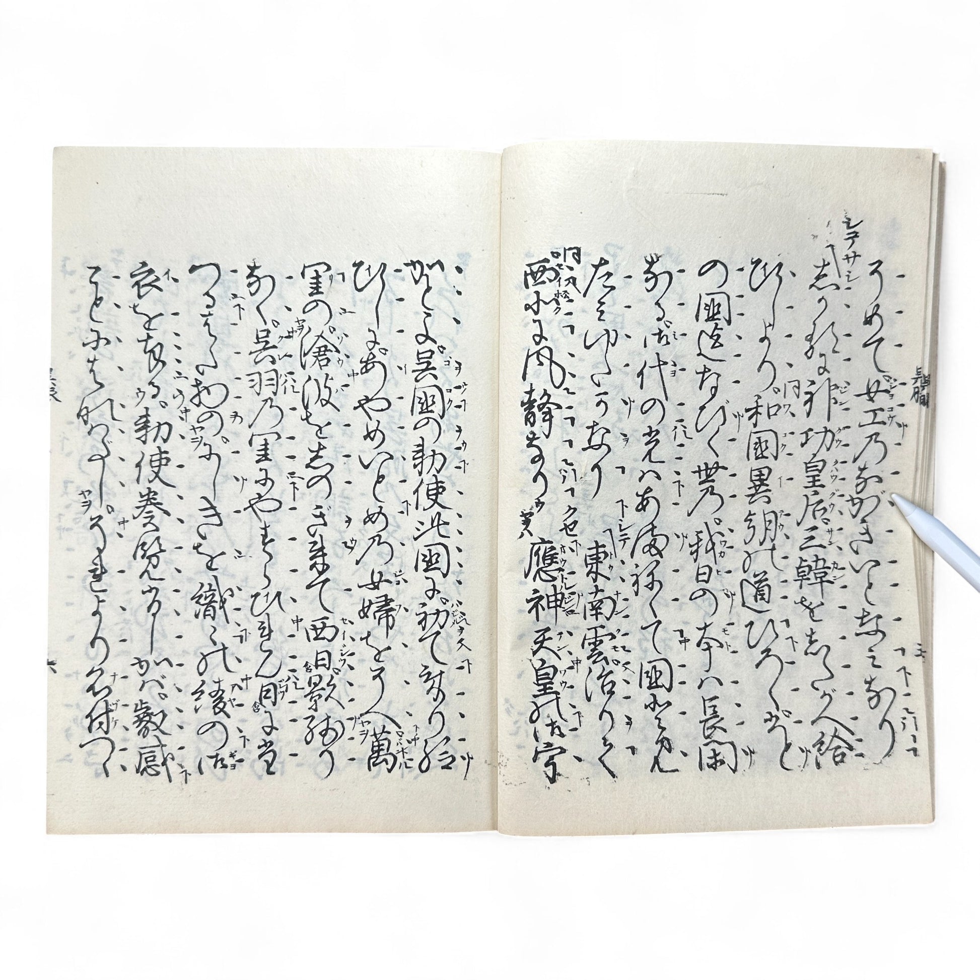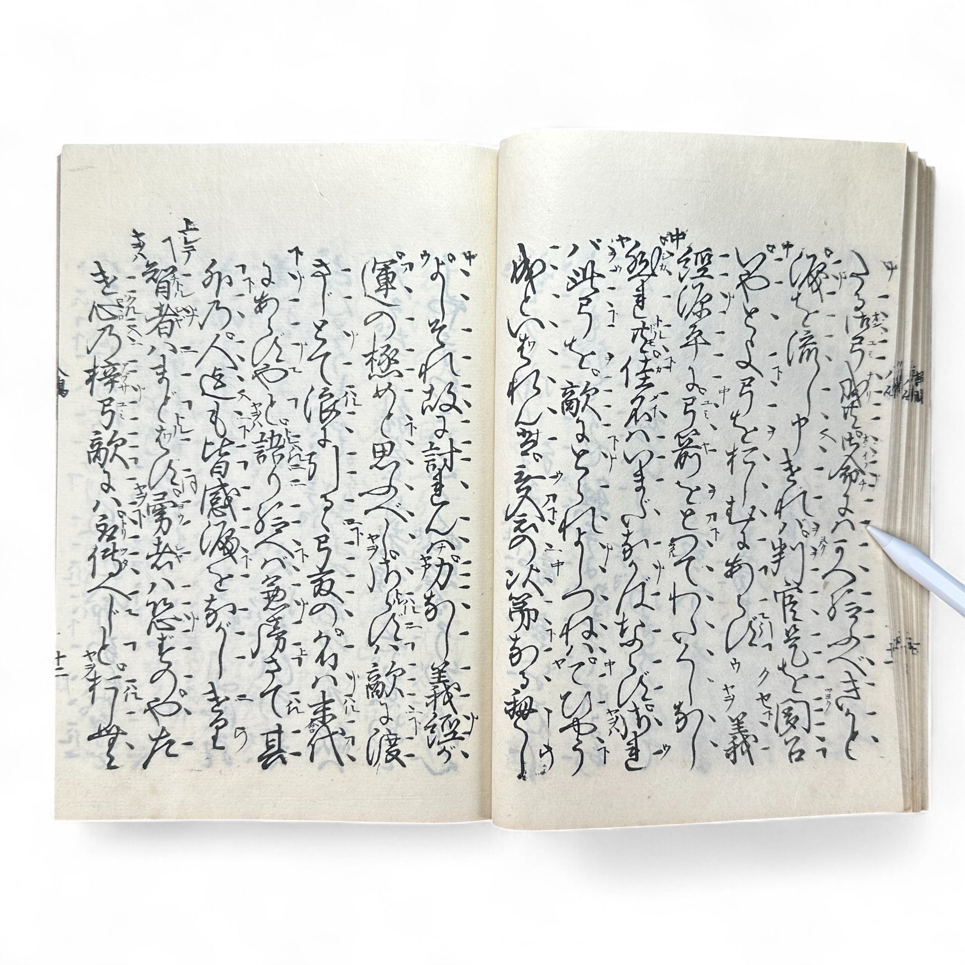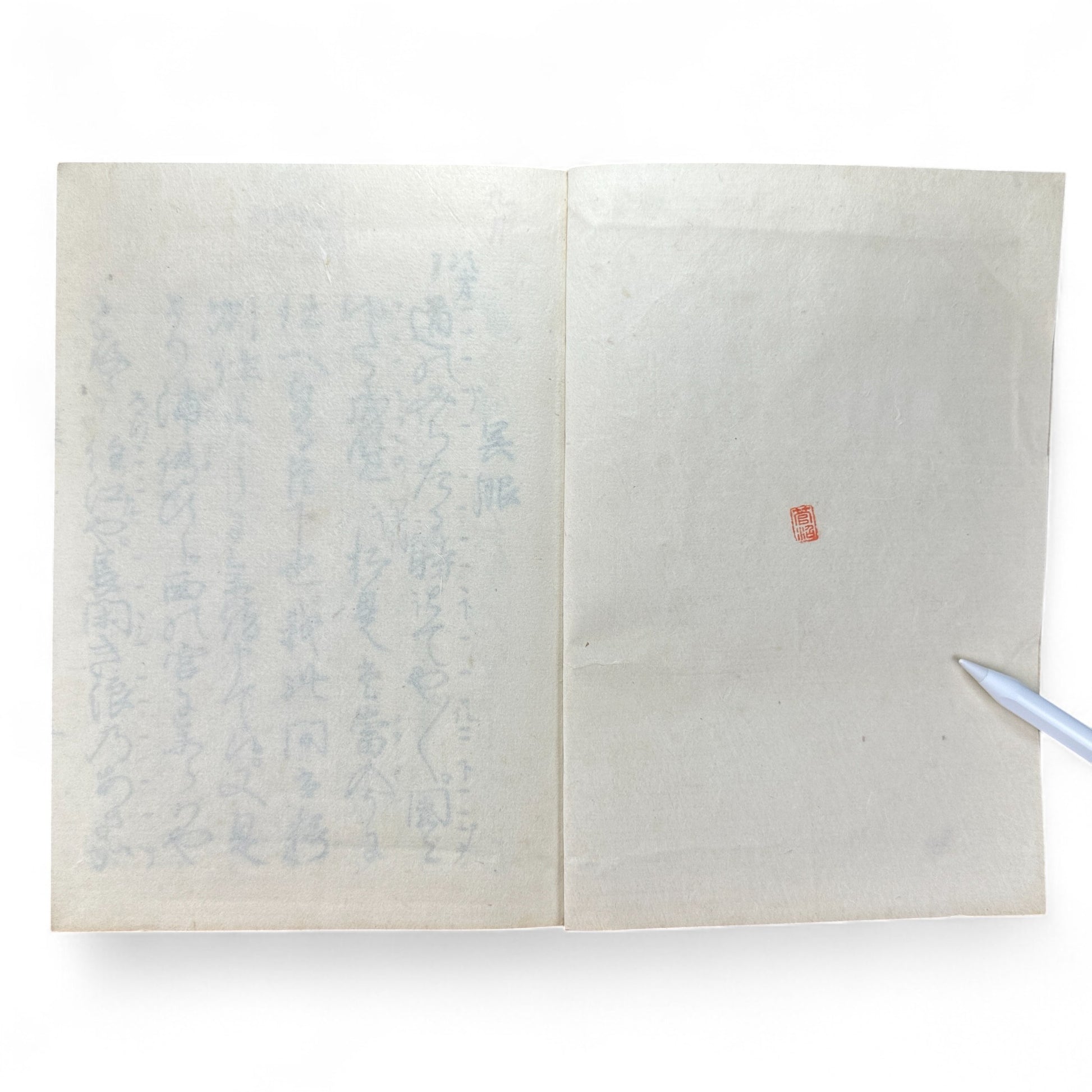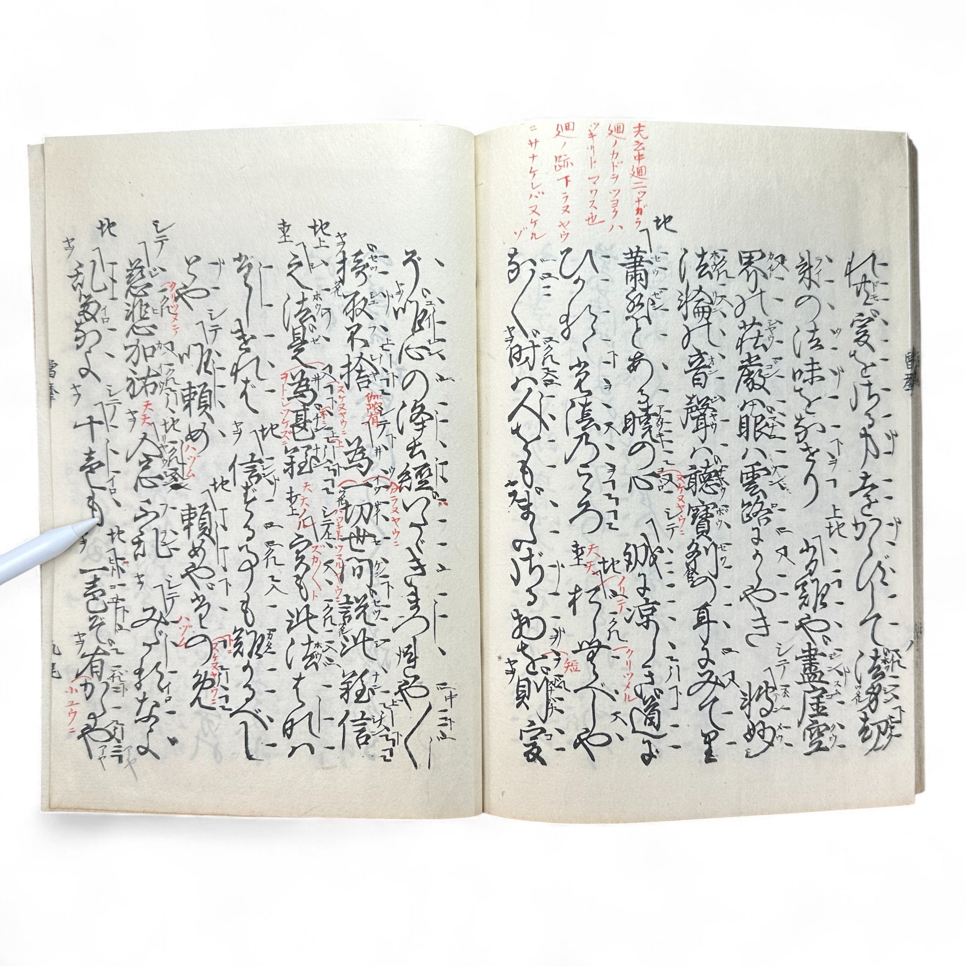 Beautifully handwritten in kuzushiji-style with red editorial notes, this work tells a refined tale of fashion, love, and daily life among kimono merchants and townspeople in Kyoto during Japan’s transition to modernity.
