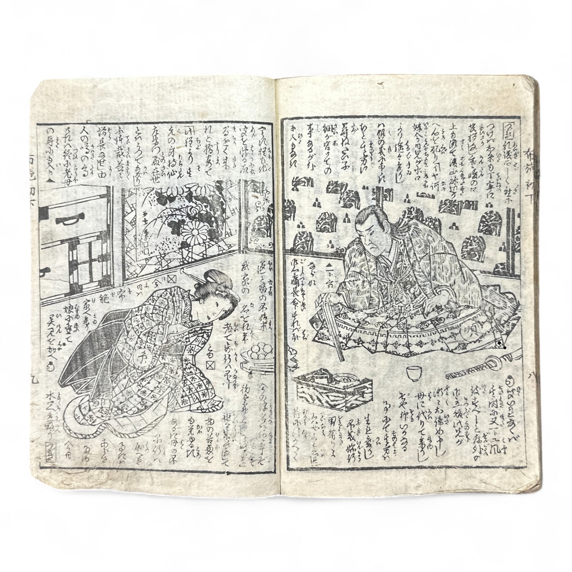 The cover scene evokes refined domestic interiors of the Meiji era, while the interior images depict samurai, heroines, and dramatic encounters — a vivid window into the culture and art of 19th-century Japan.