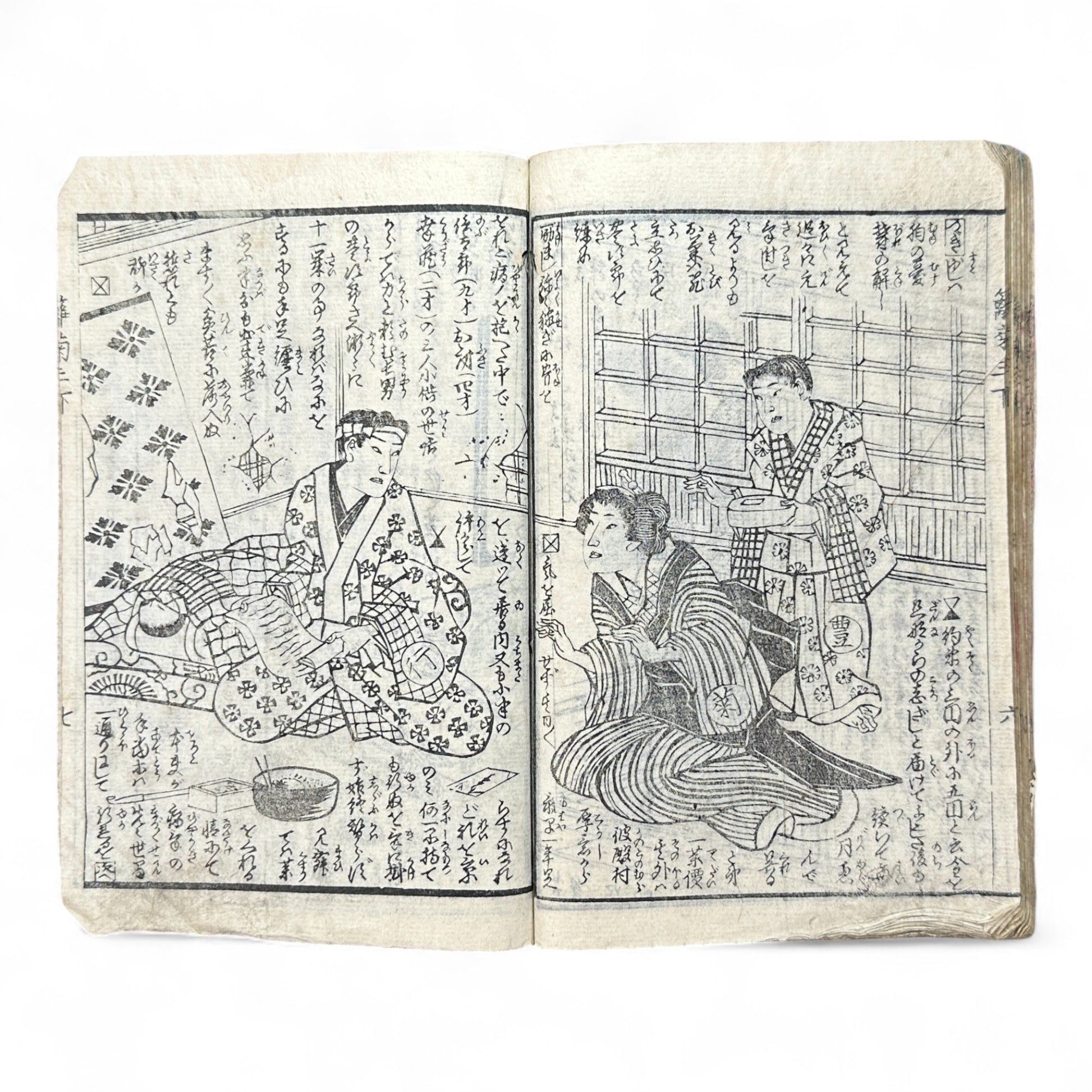 Scenes depict domestic interiors, family life, and dramatic confrontations rendered with fine woodblock detail and expressive linework.