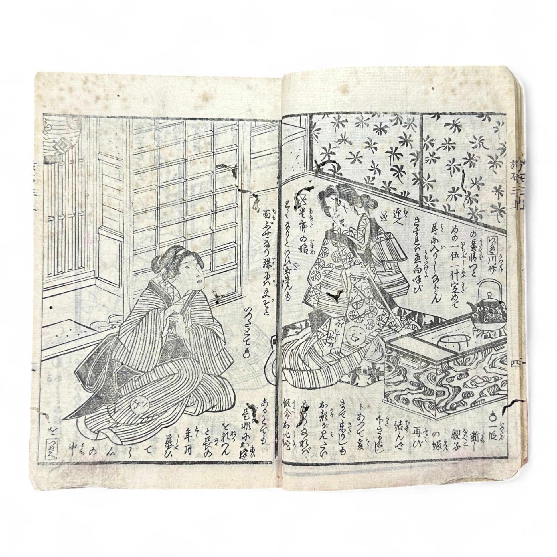 The narrative intertwines scenes of urban life, women’s virtue, and moral testing, rendered in elegant brush linework typical of transitional Edo–Meiji book art.