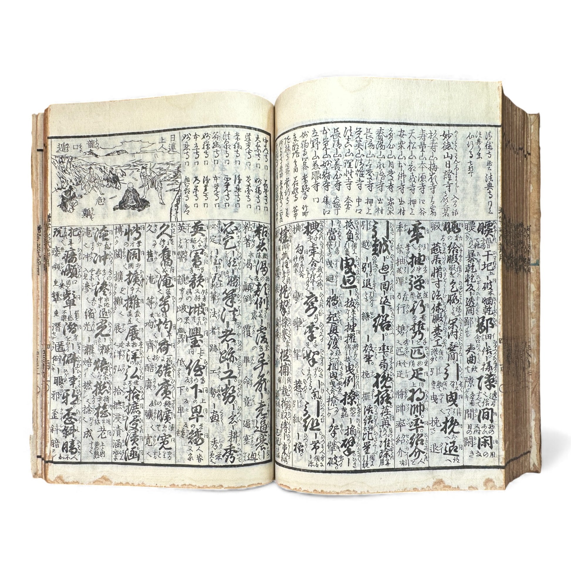 A rare and expansive Edo-period illustrated encyclopedia, this woodblock-printed compendium gathers knowledge from across traditional Japanese and Chinese disciplines. It includes history, cosmology, fortune-telling, palmistry, seasonal charts, poetry, temple records, and biographical portraits — all in one thick, richly detailed volume.