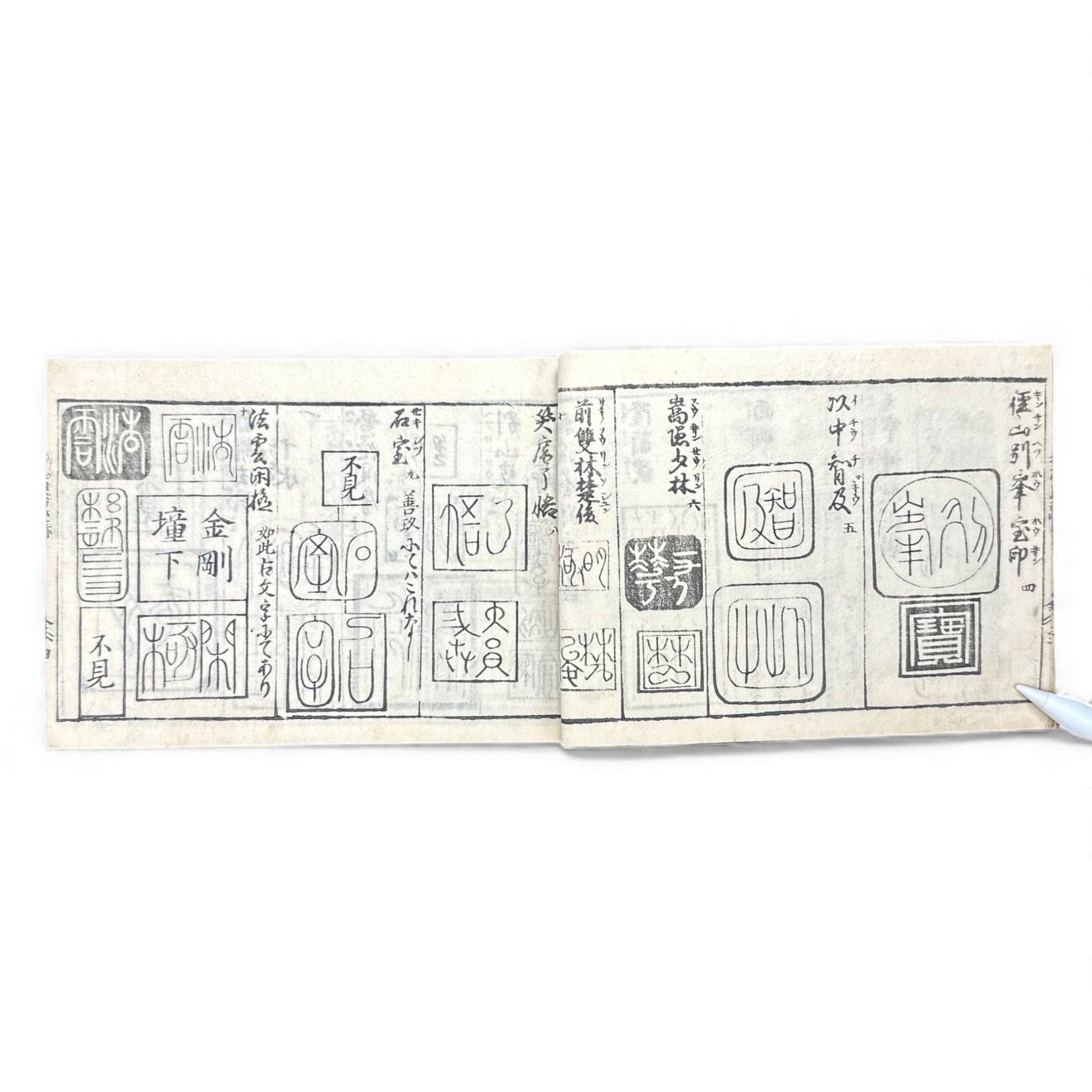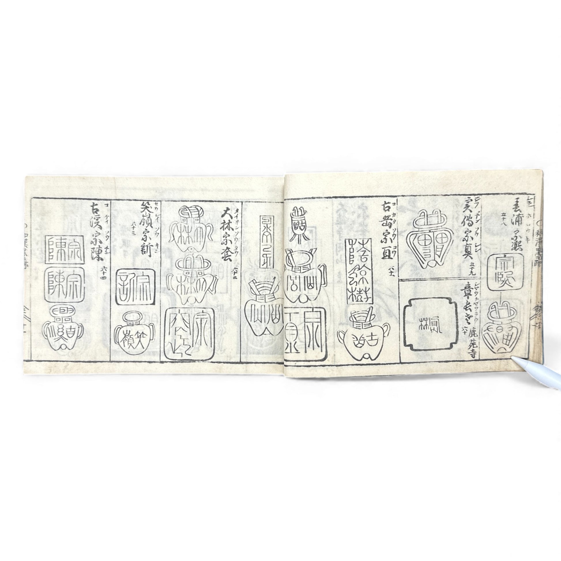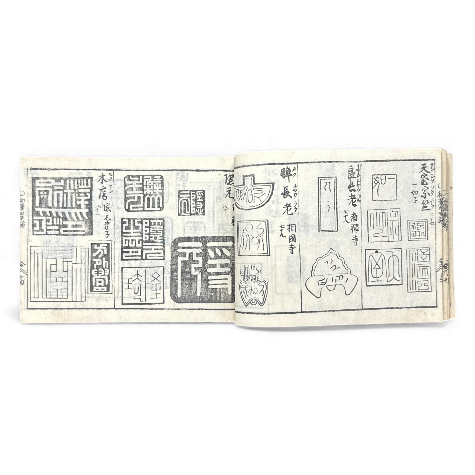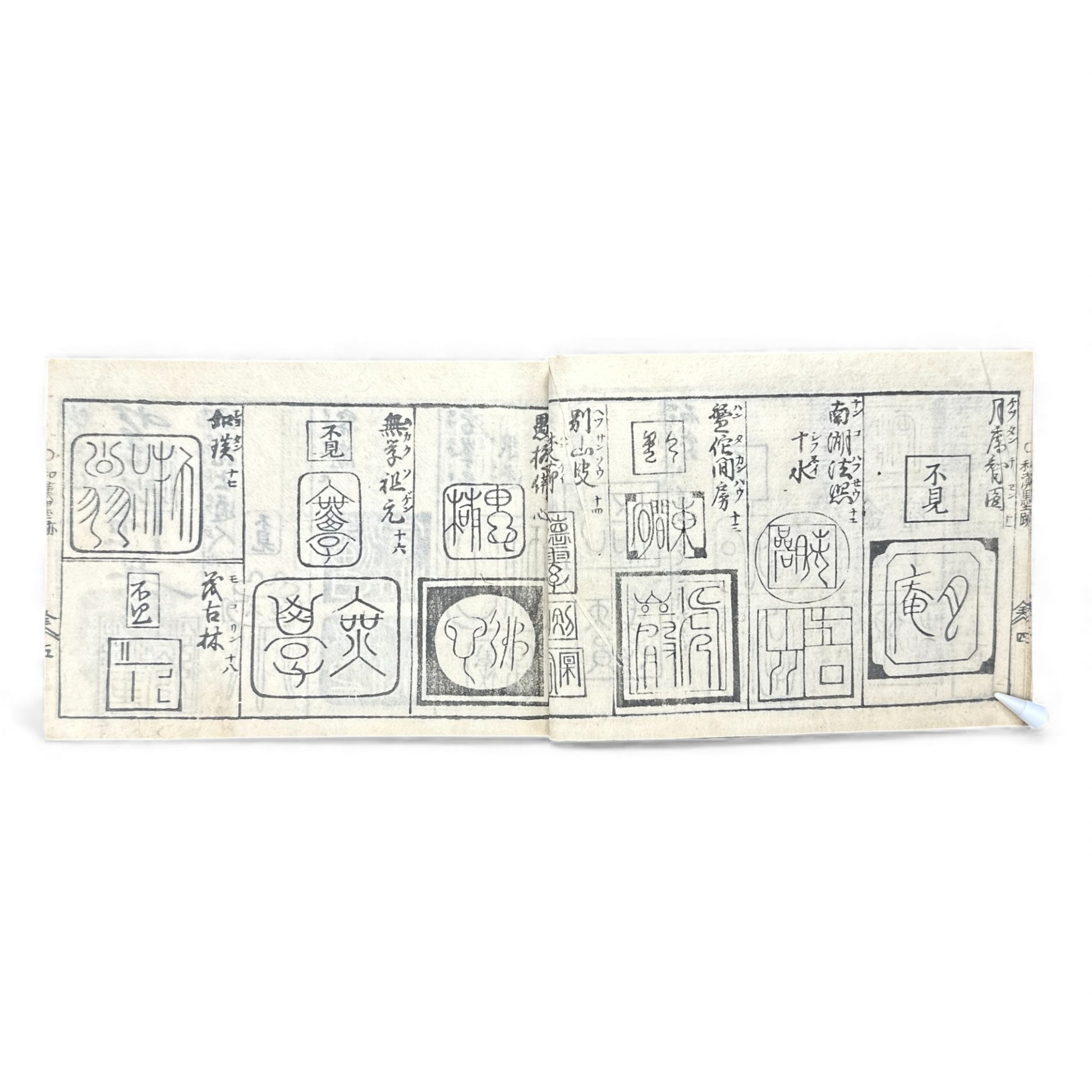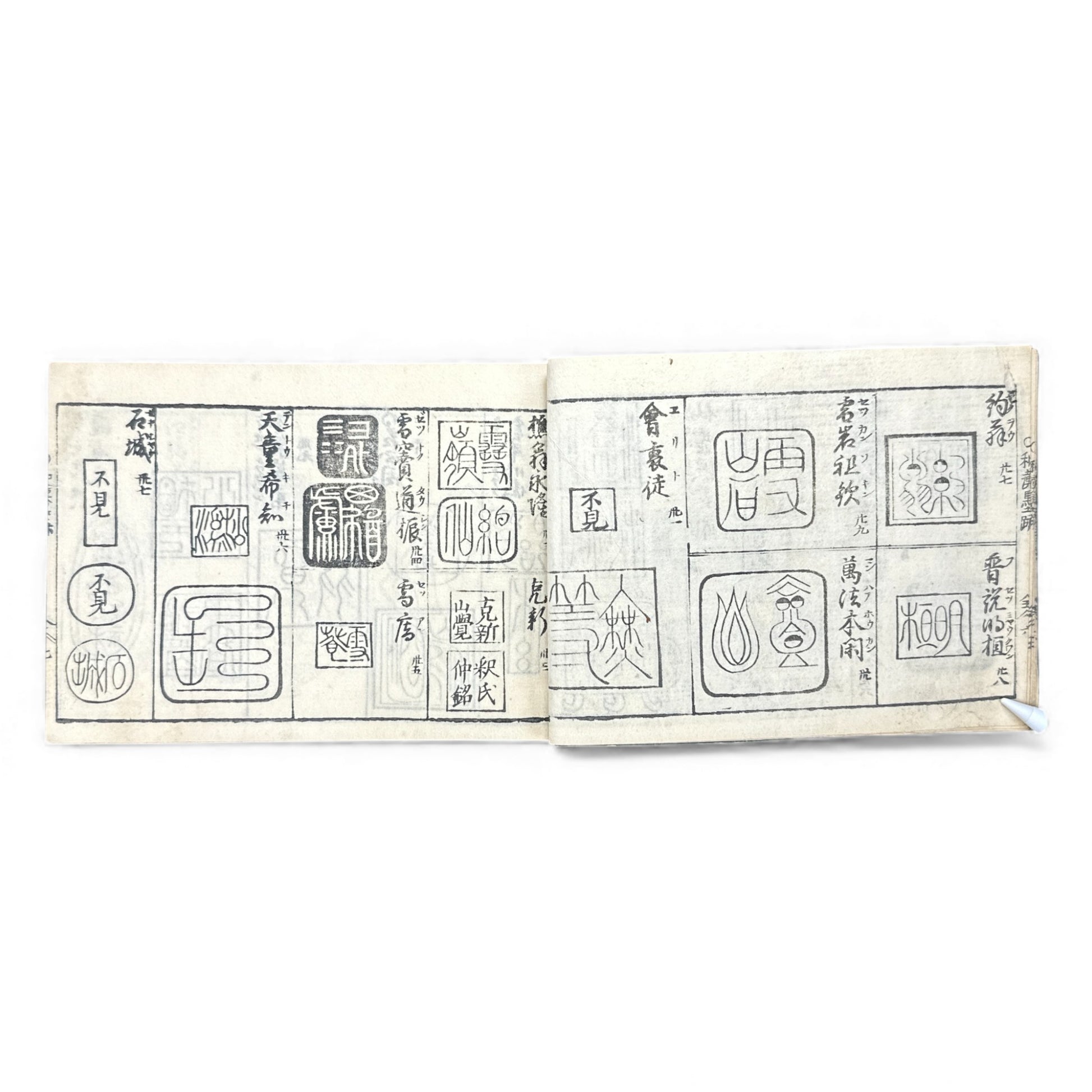 A rare Edo–Meiji era Japanese 印譜 (inpu) — a woodblock-printed manual of seal designs, artistic motifs, and classical seal-script characters used by calligraphers, scholars, monks, and seal-carvers.