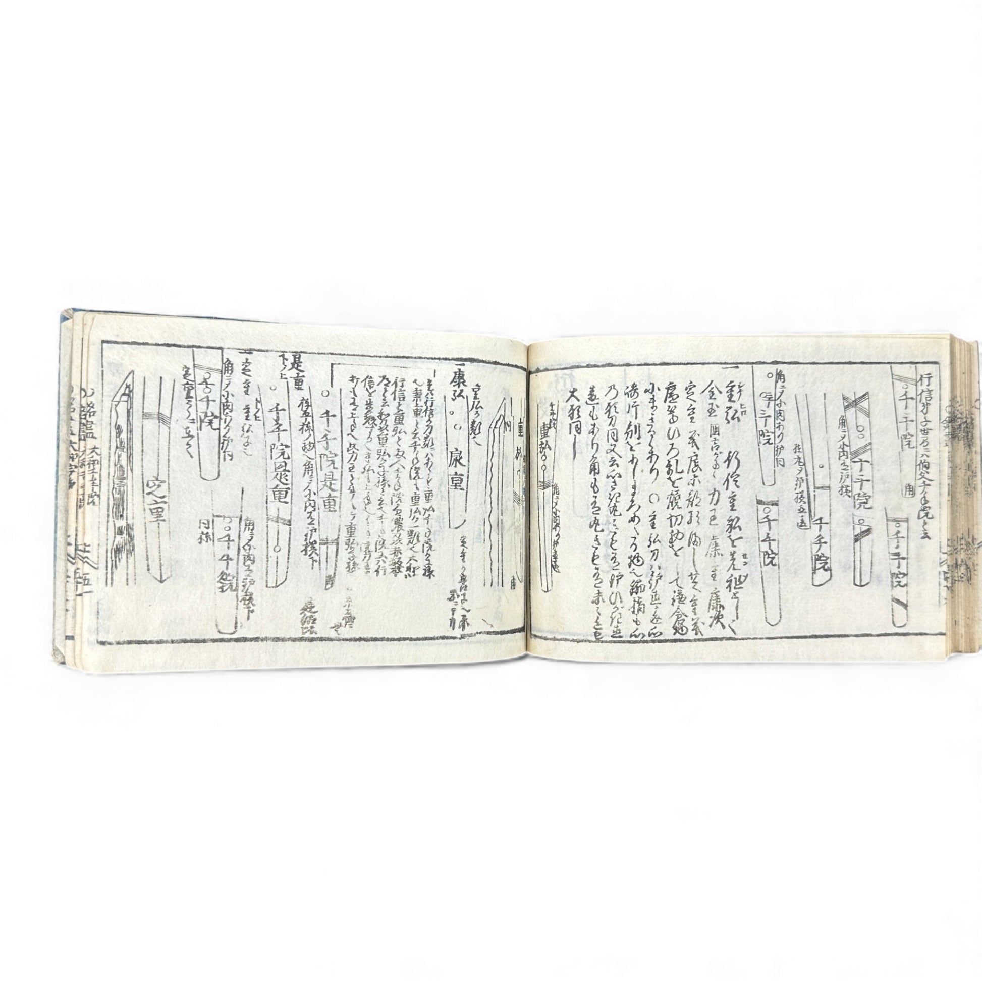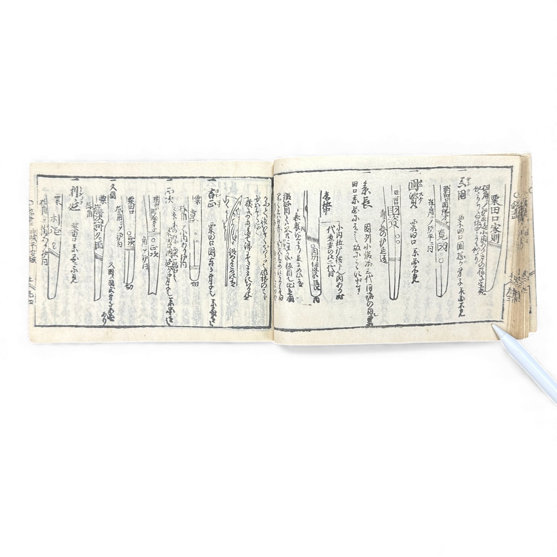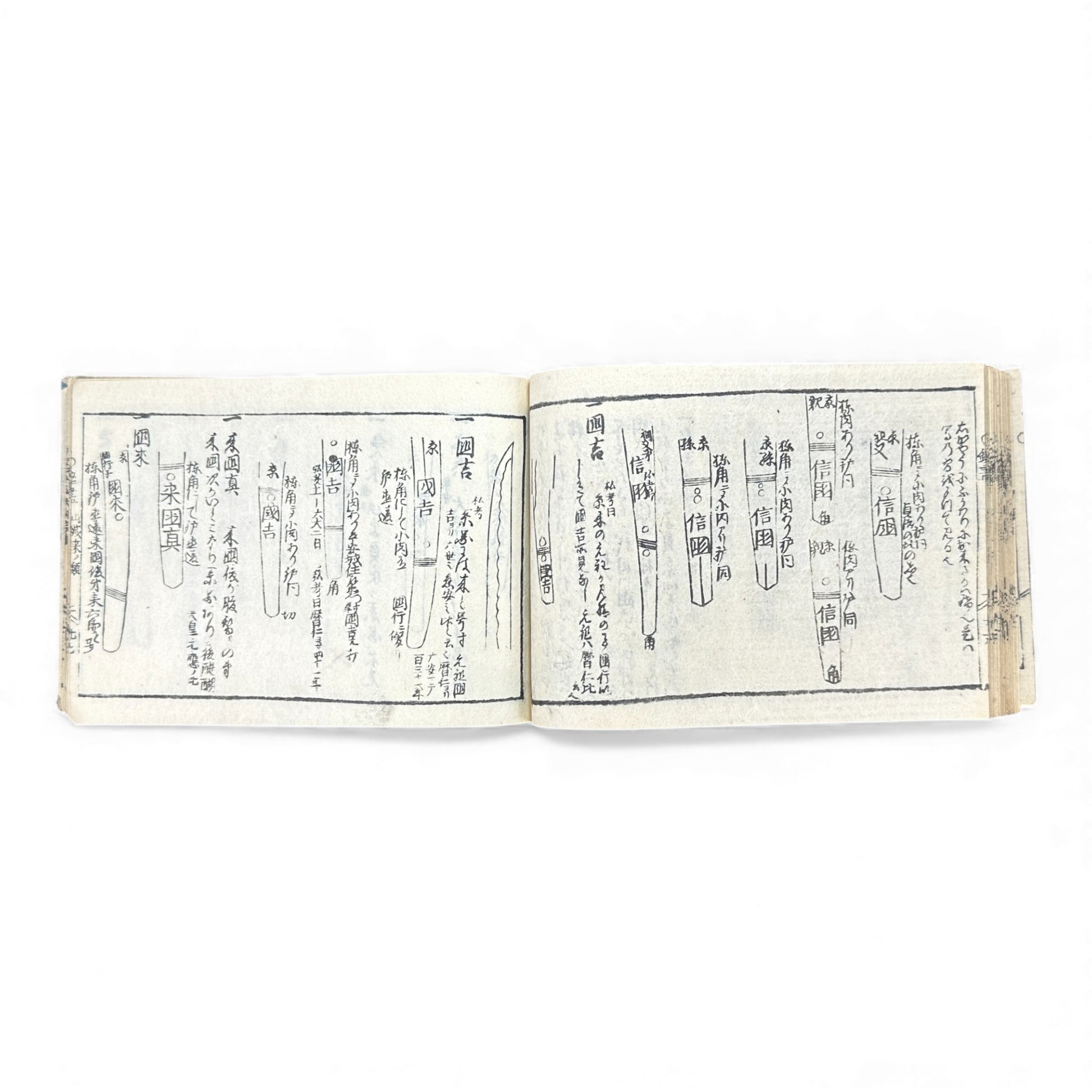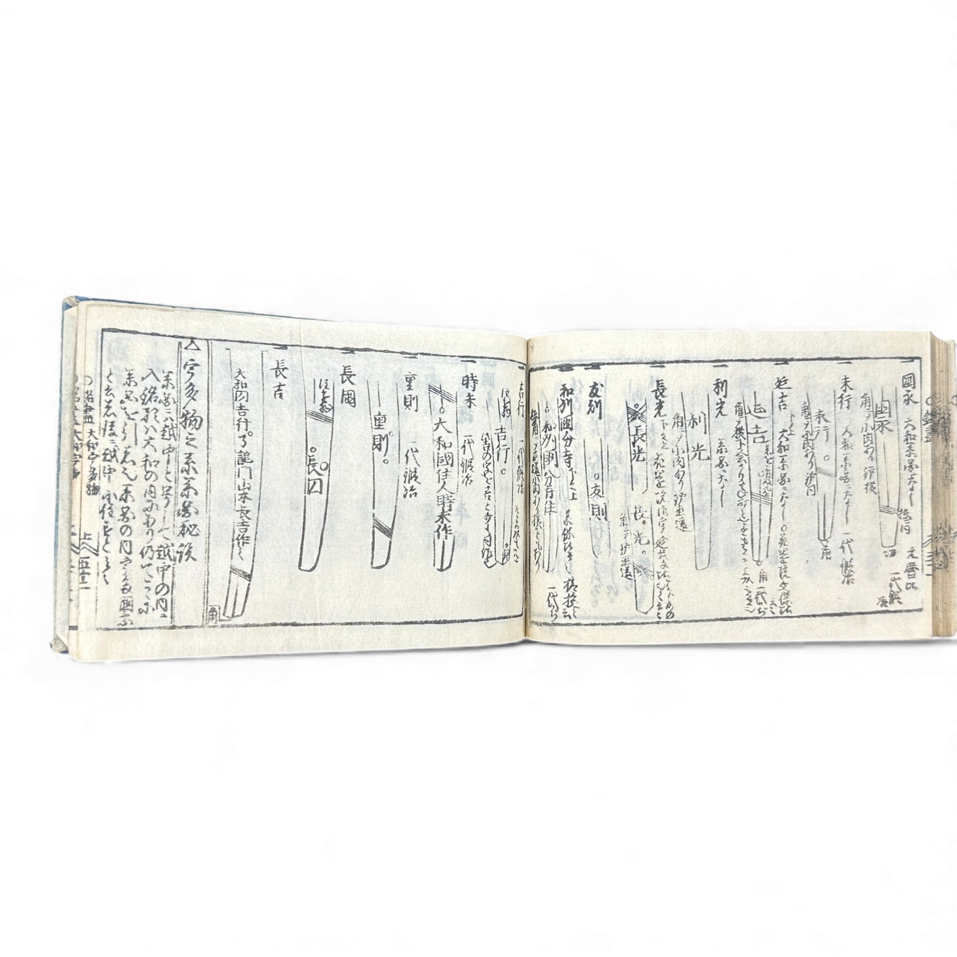 Step into the world of samurai scholarship with this rare Edo period woodblock-printed reference manual, a surviving volume of 古今銘盡合鑑大全 (Kokon Meijin Gōkan Taizen) — an encyclopedic guide to Japan’s sword traditions, official ranks, historical lineages, and ceremonial implements.