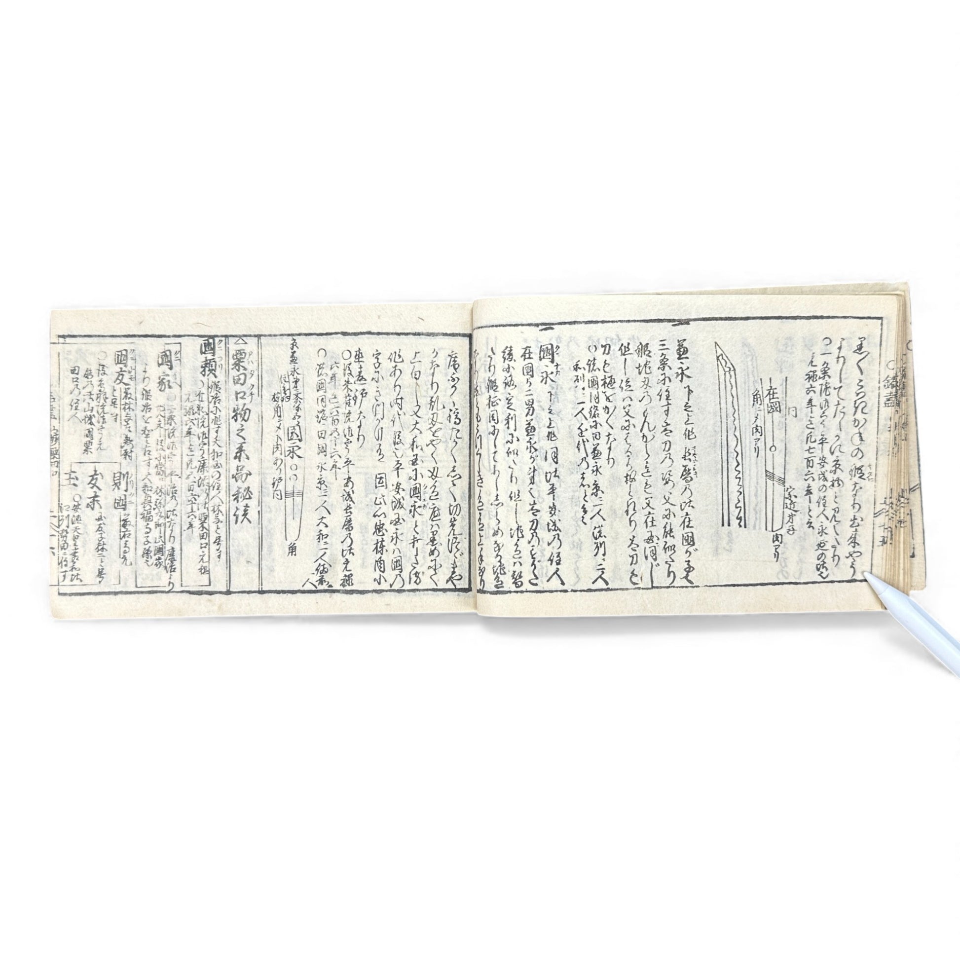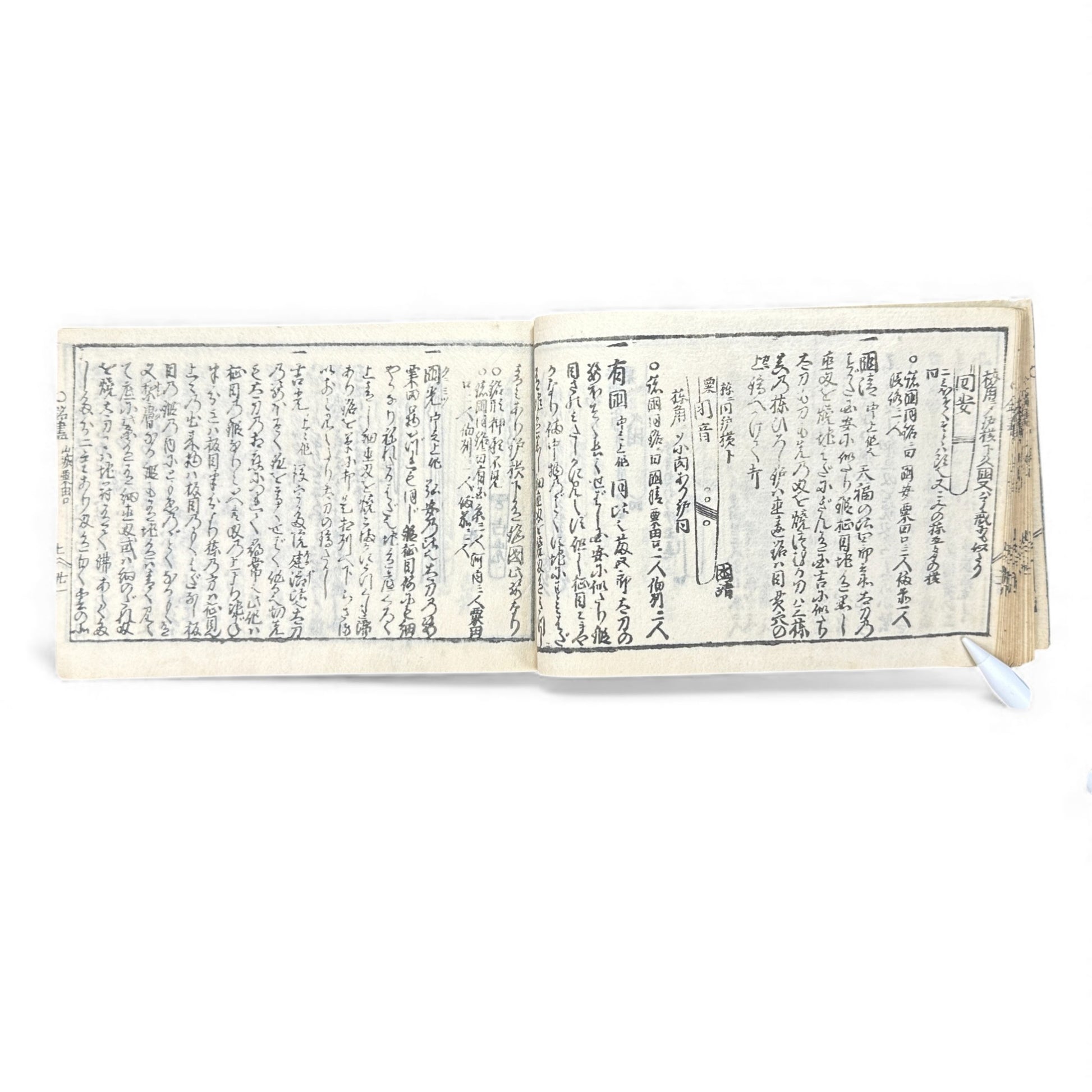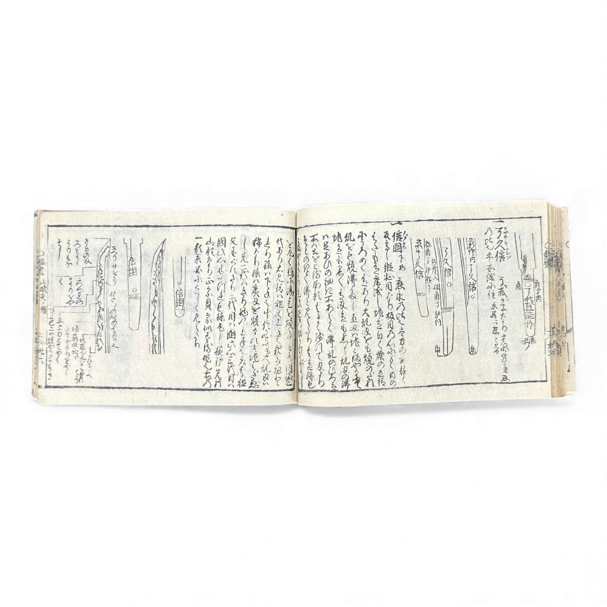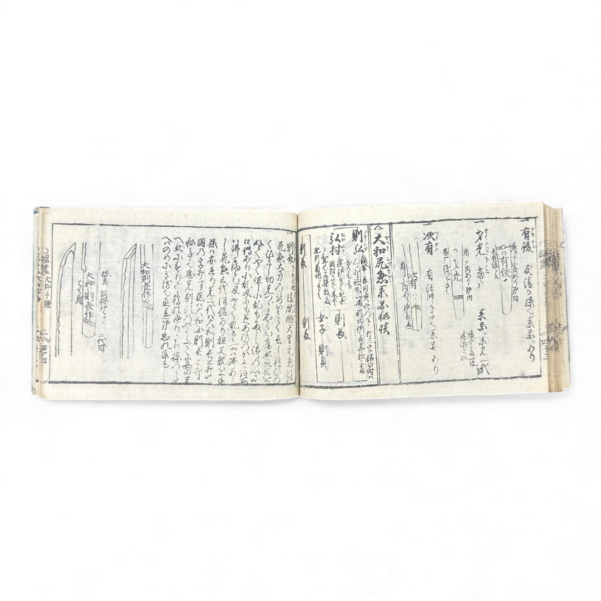 Step into the world of samurai scholarship with this rare Edo period woodblock-printed reference manual, a surviving volume of 古今銘盡合鑑大全 (Kokon Meijin Gōkan Taizen) — an encyclopedic guide to Japan’s sword traditions, official ranks, historical lineages, and ceremonial implements.