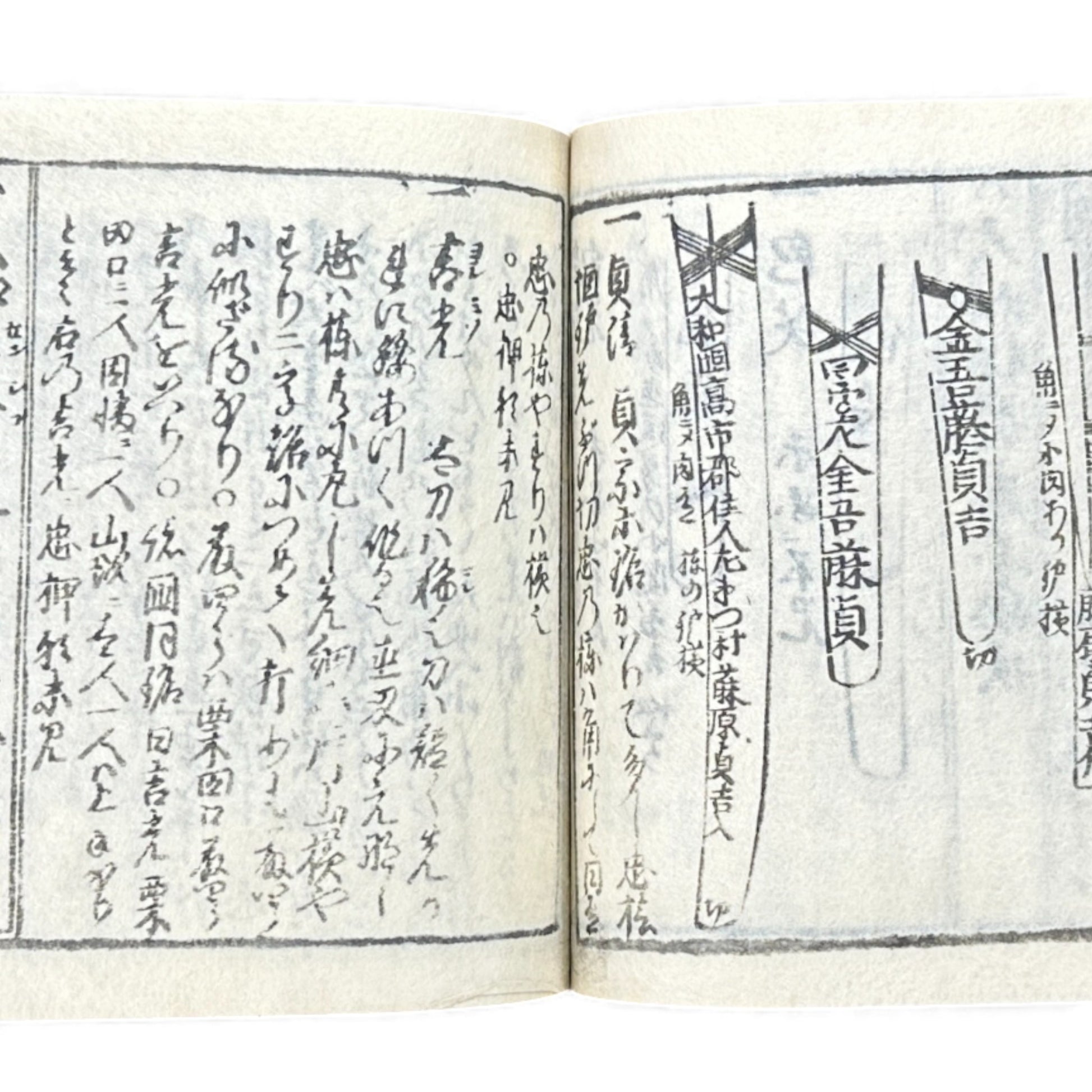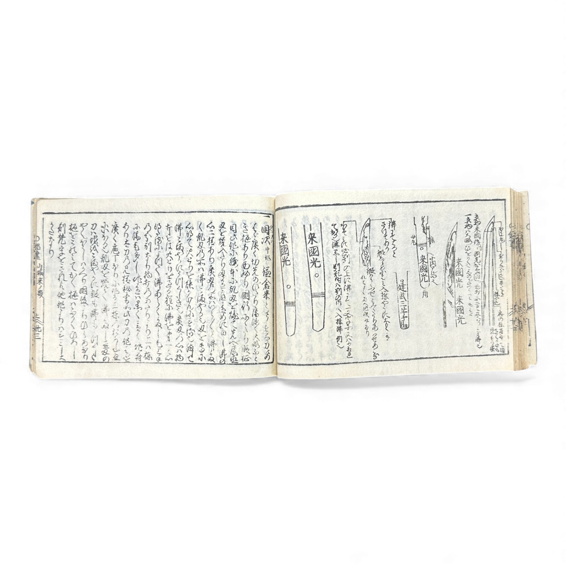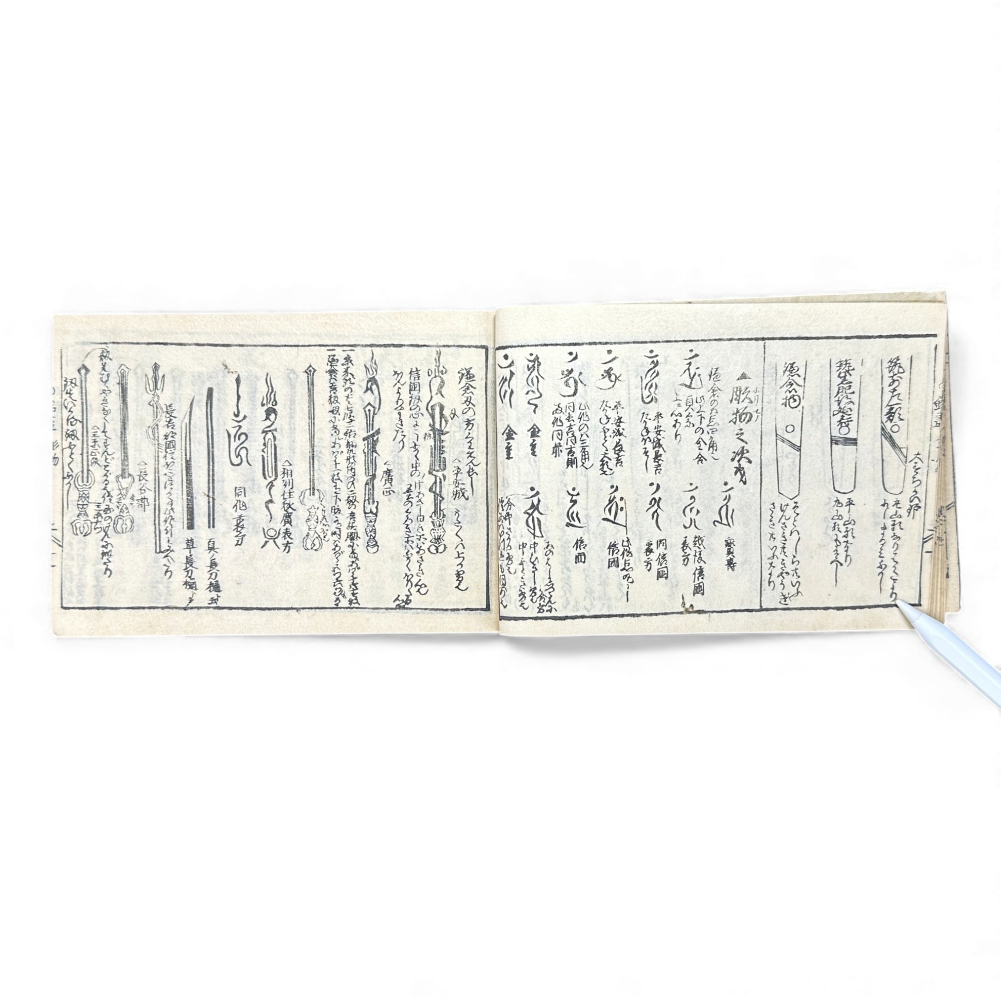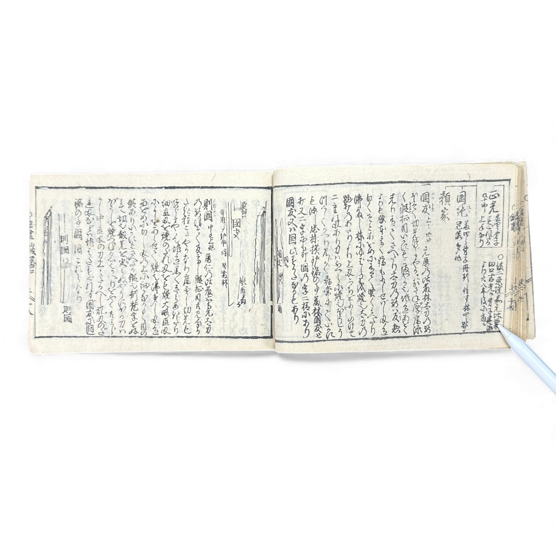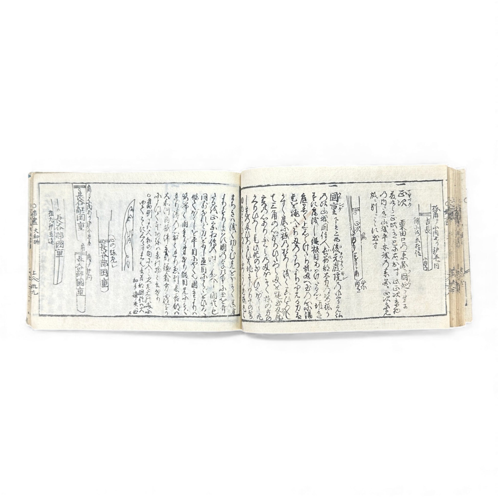 Step into the world of samurai scholarship with this rare Edo period woodblock-printed reference manual, a surviving volume of 古今銘盡合鑑大全 (Kokon Meijin Gōkan Taizen) — an encyclopedic guide to Japan’s sword traditions, official ranks, historical lineages, and ceremonial implements.
