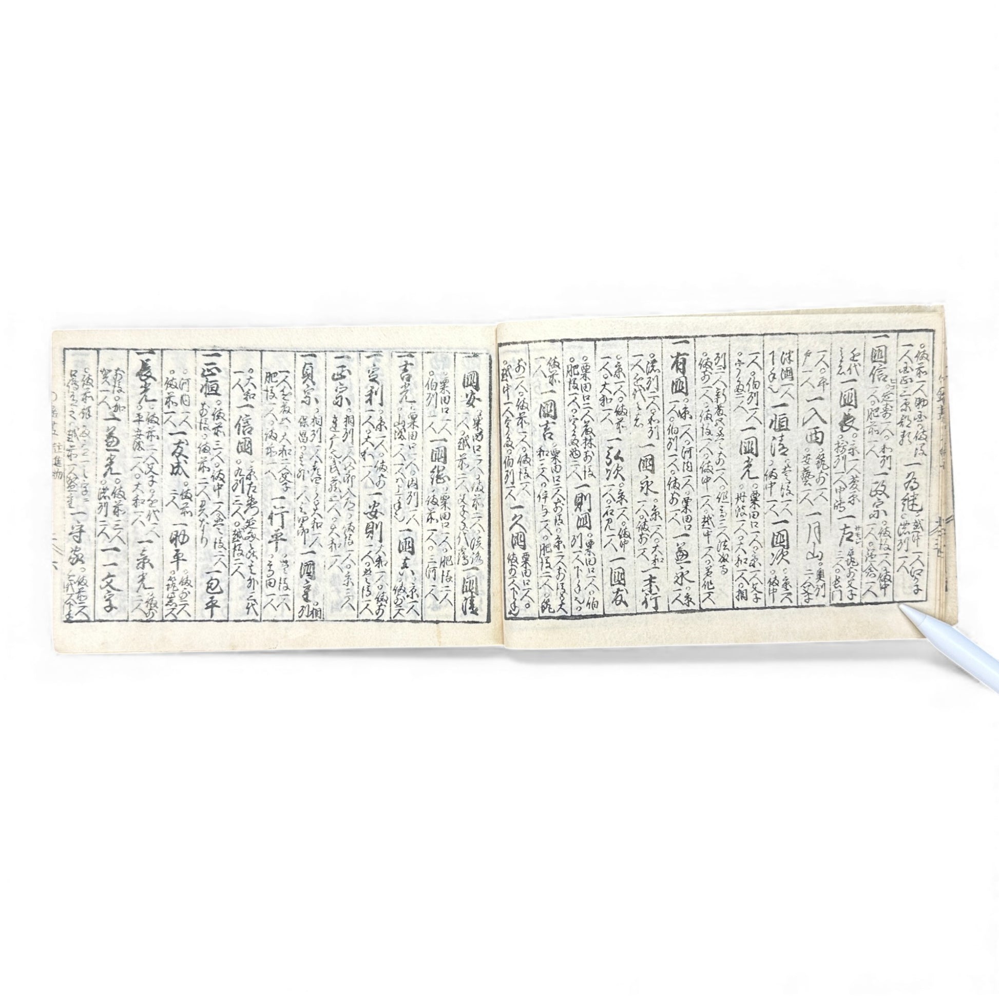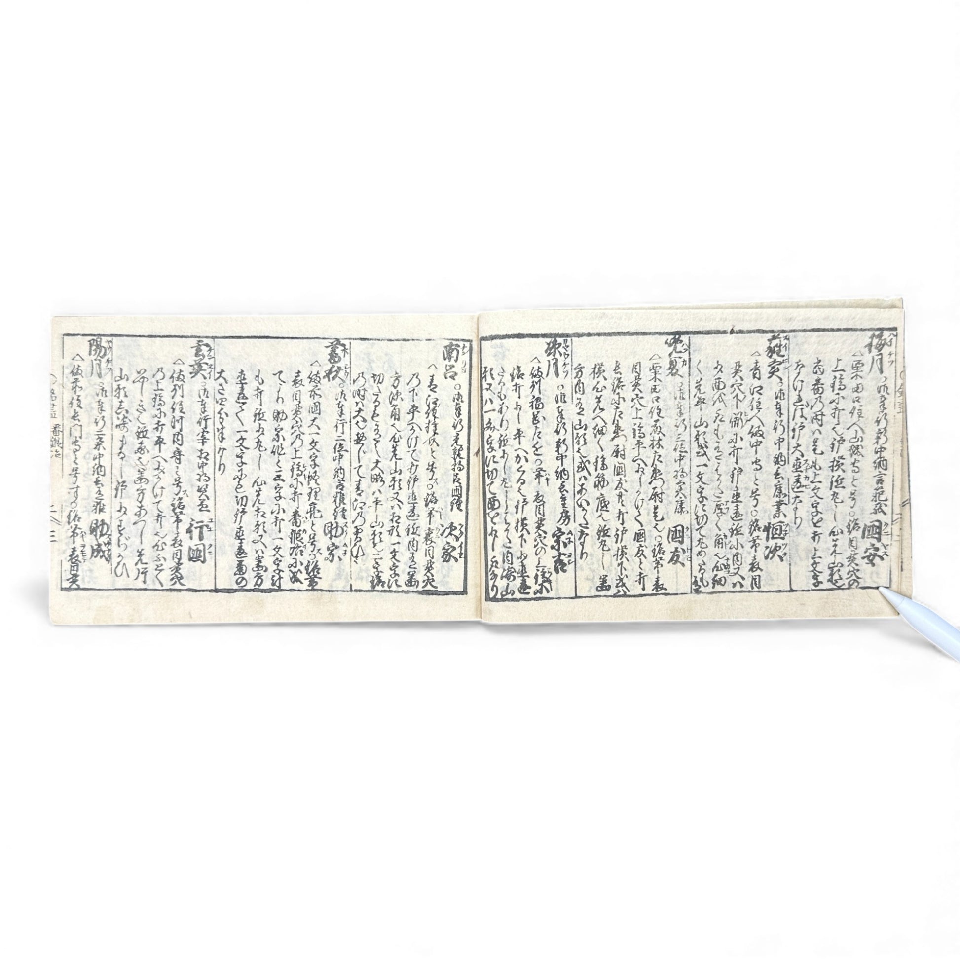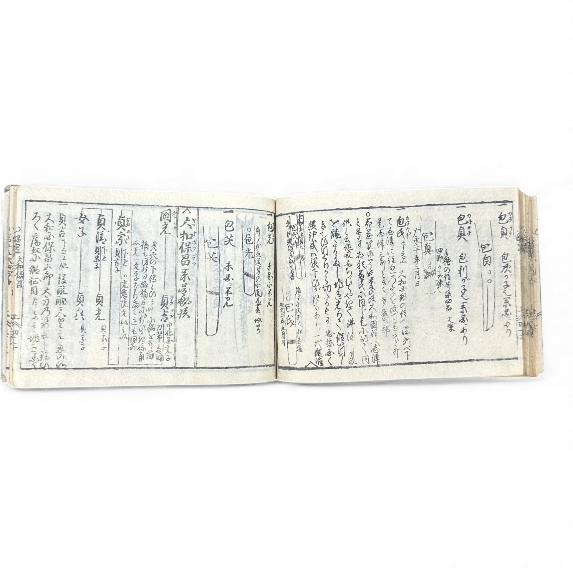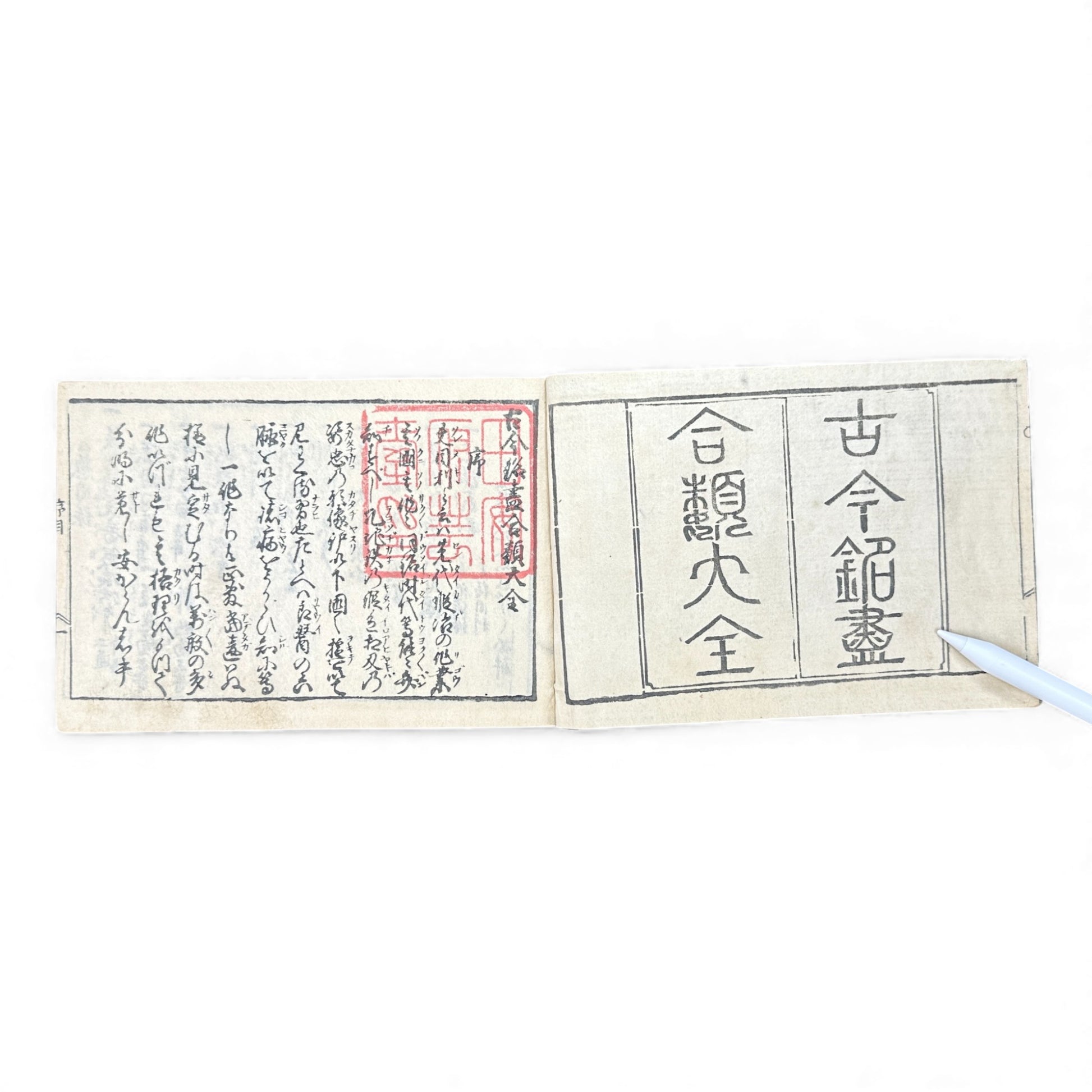 Step into the world of samurai scholarship with this rare Edo period woodblock-printed reference manual, a surviving volume of 古今銘盡合鑑大全 (Kokon Meijin Gōkan Taizen) — an encyclopedic guide to Japan’s sword traditions, official ranks, historical lineages, and ceremonial implements.