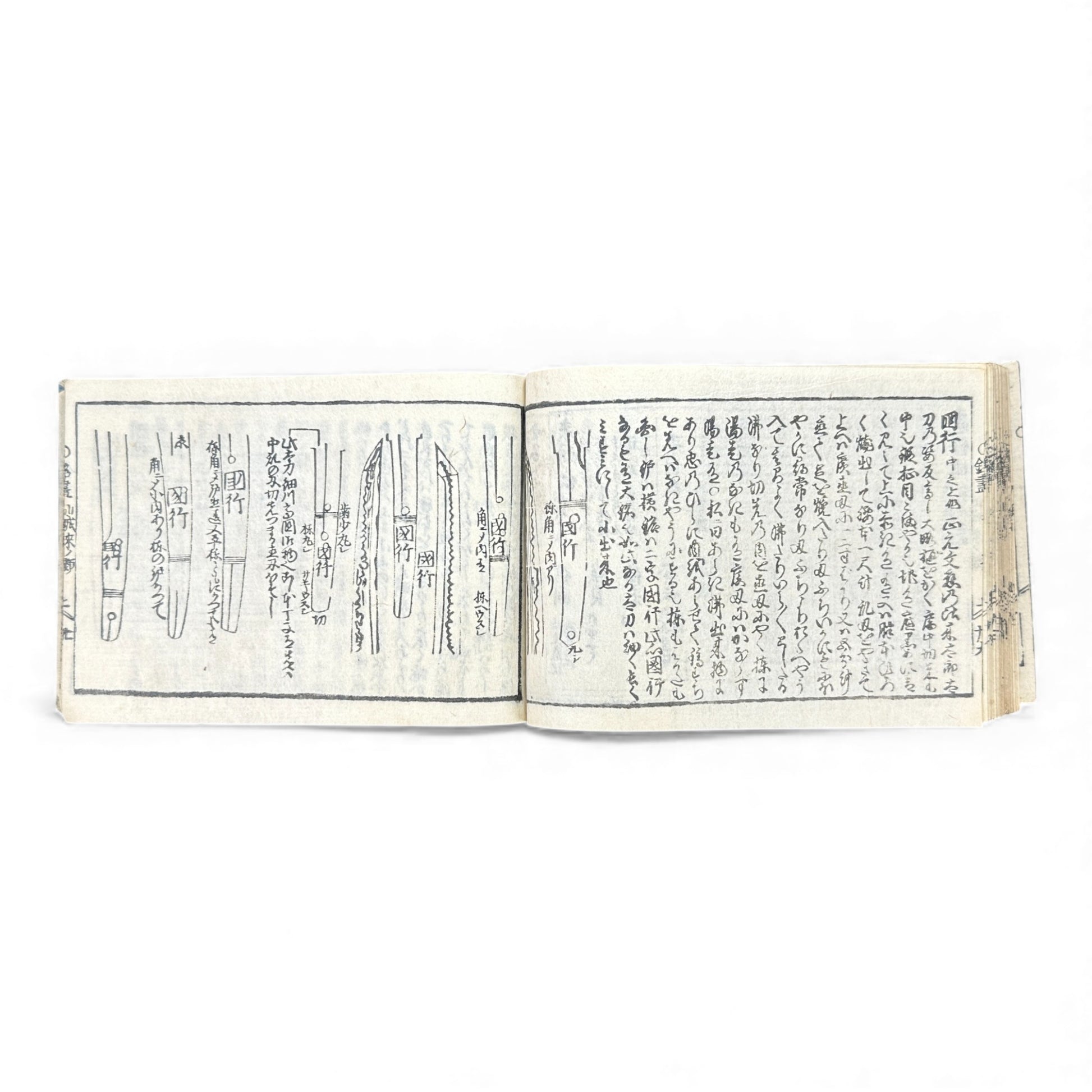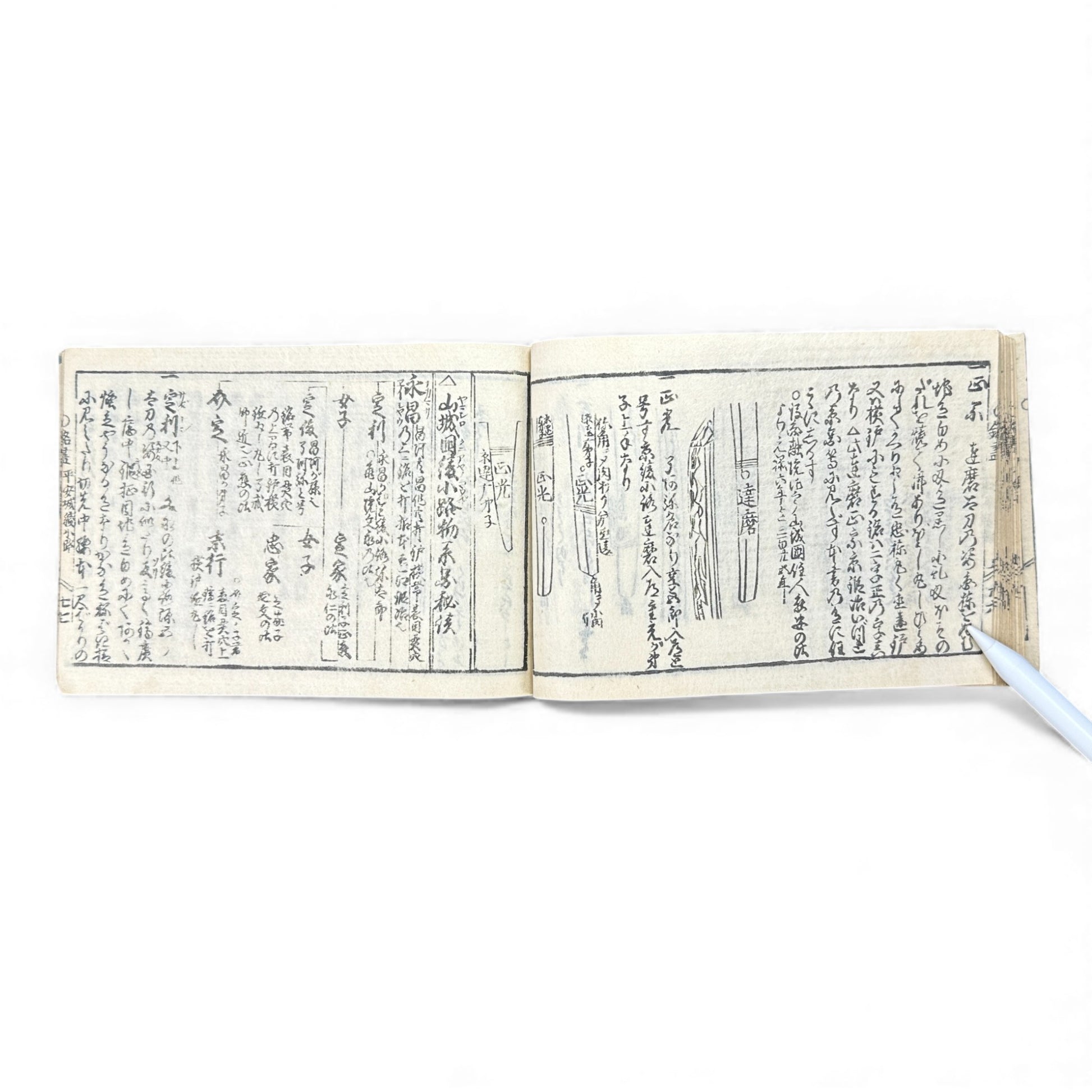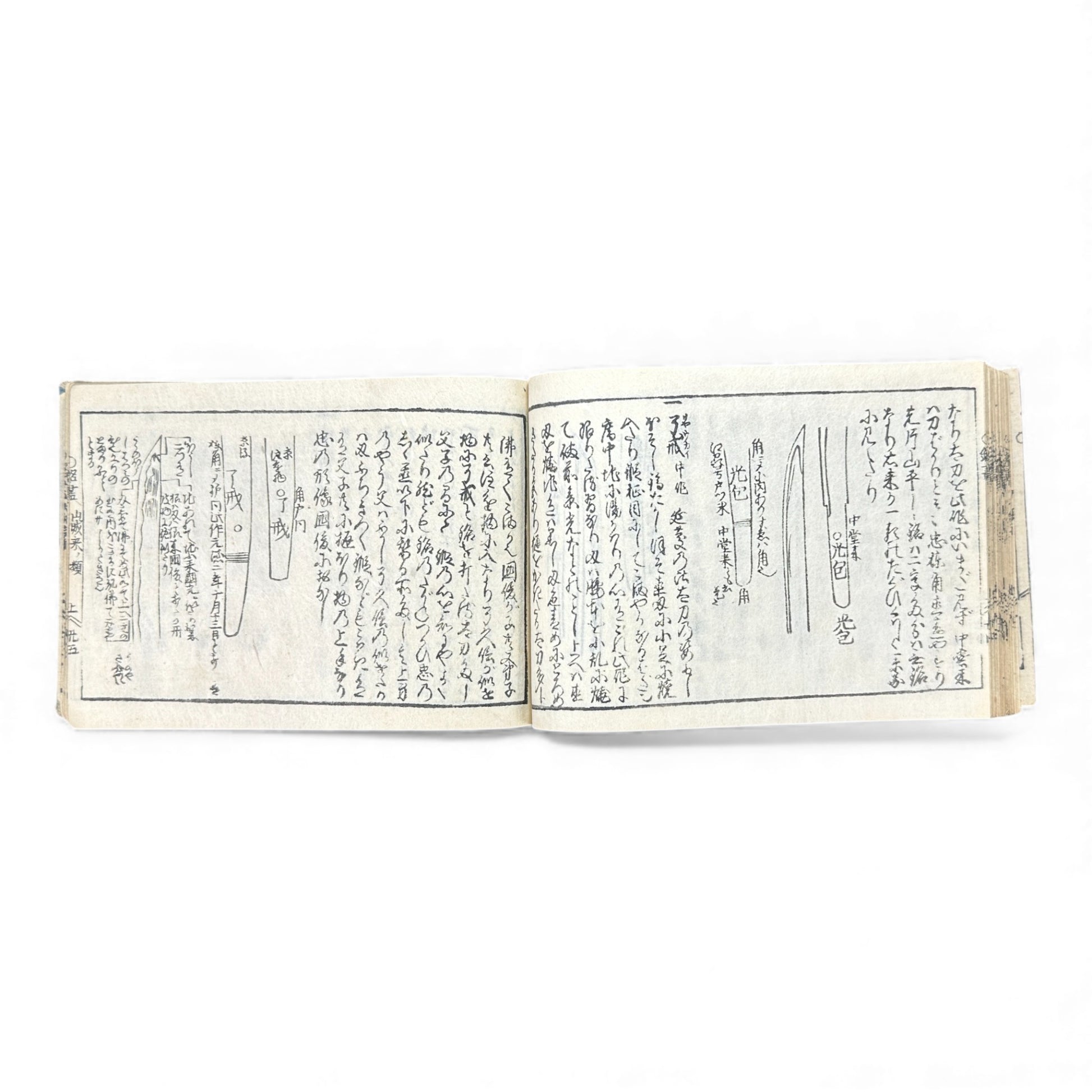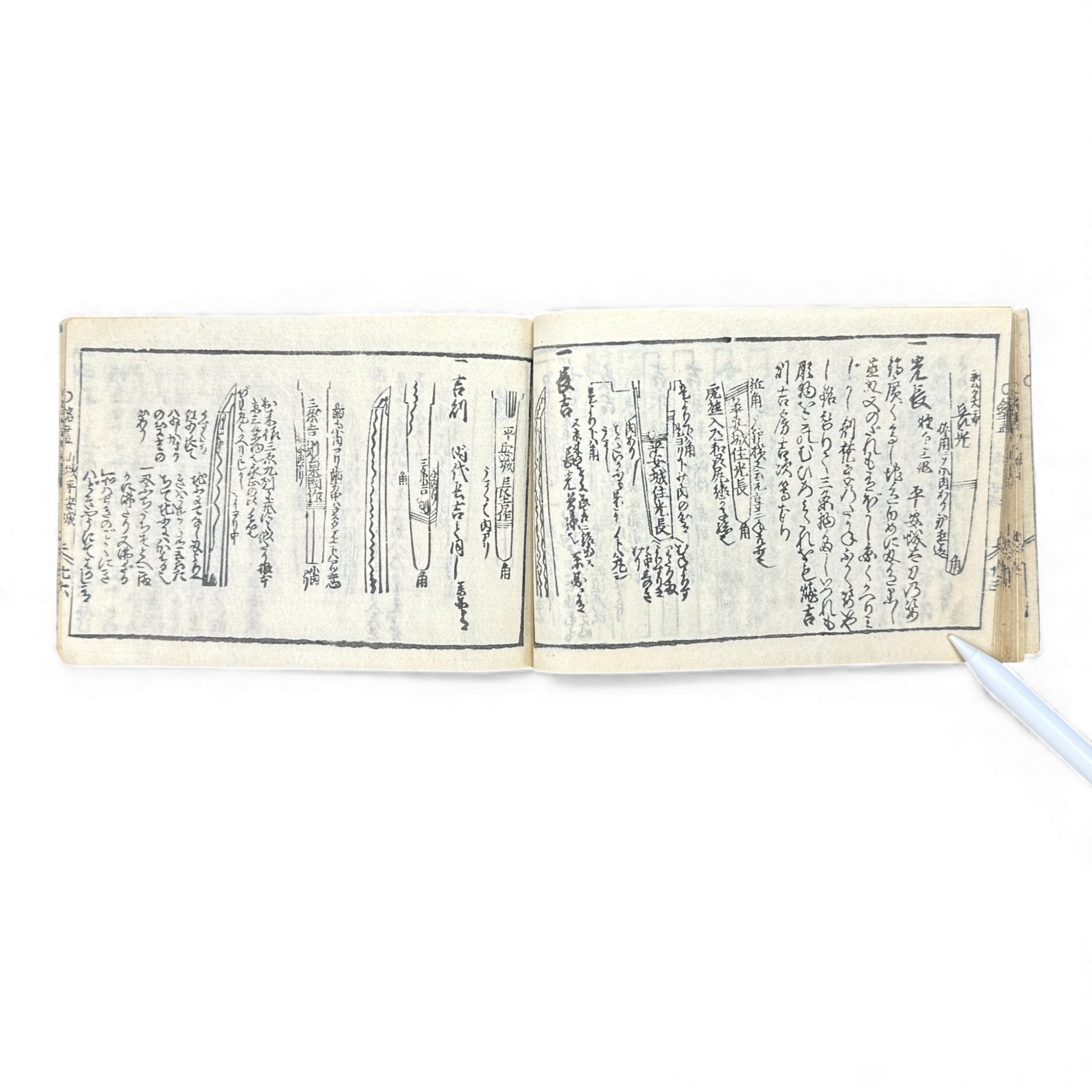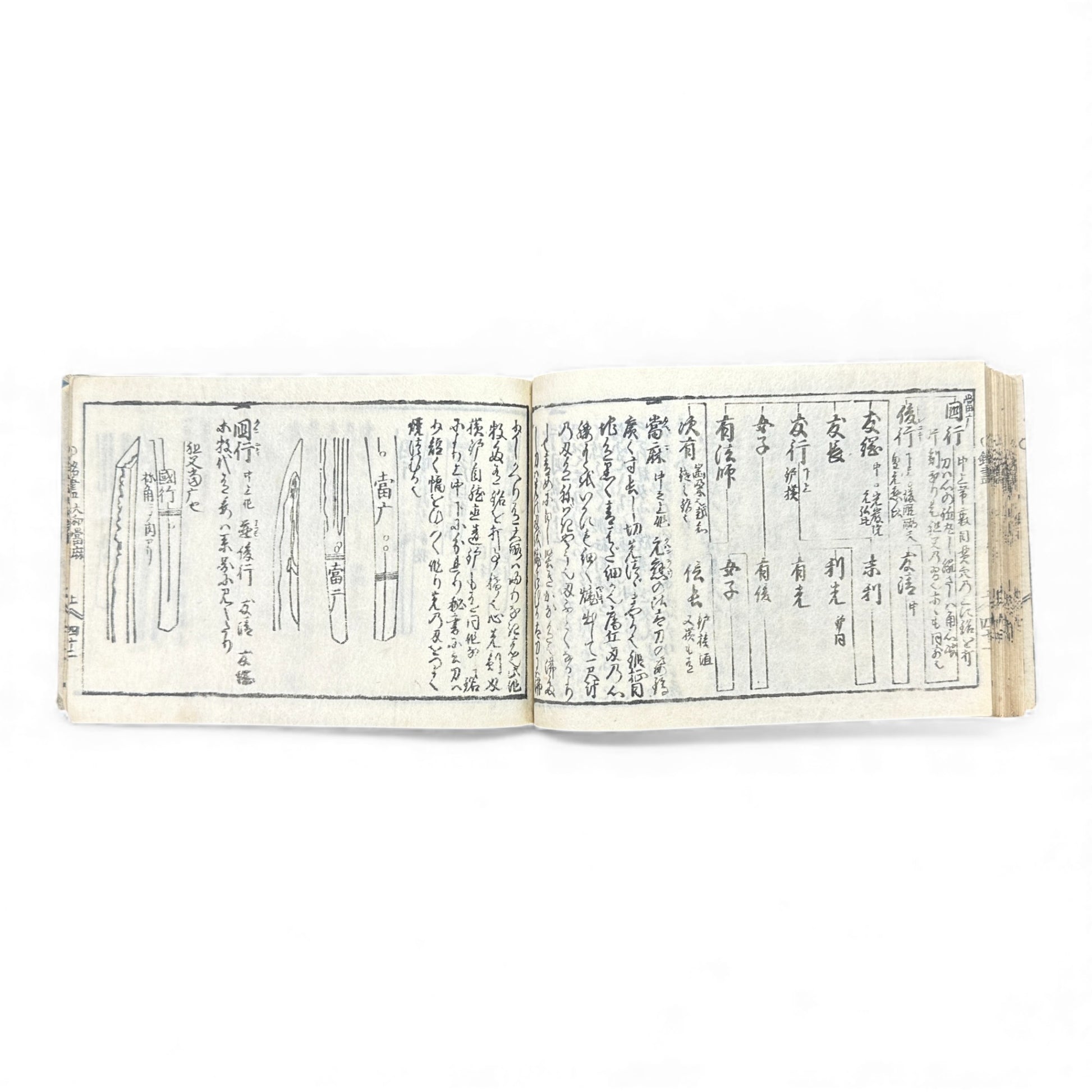 Its illustrated pages show exactly how technical and cultural knowledge was catalogued before modern printing. This is an unusually rich example — not just text, but full-page diagrams, blade profiles, tool illustrations, and compact reference charts that are rarely preserved so well.