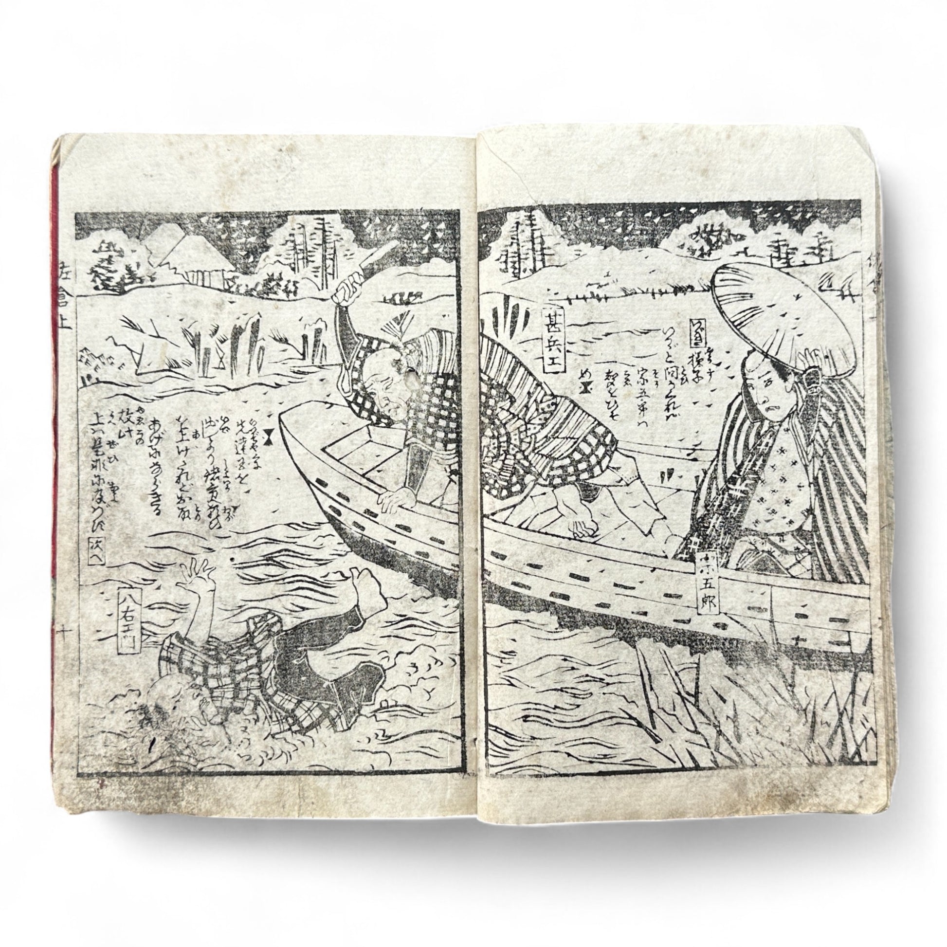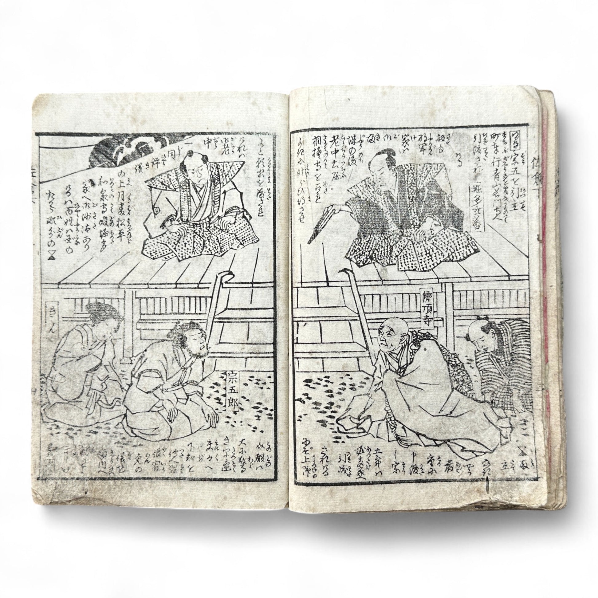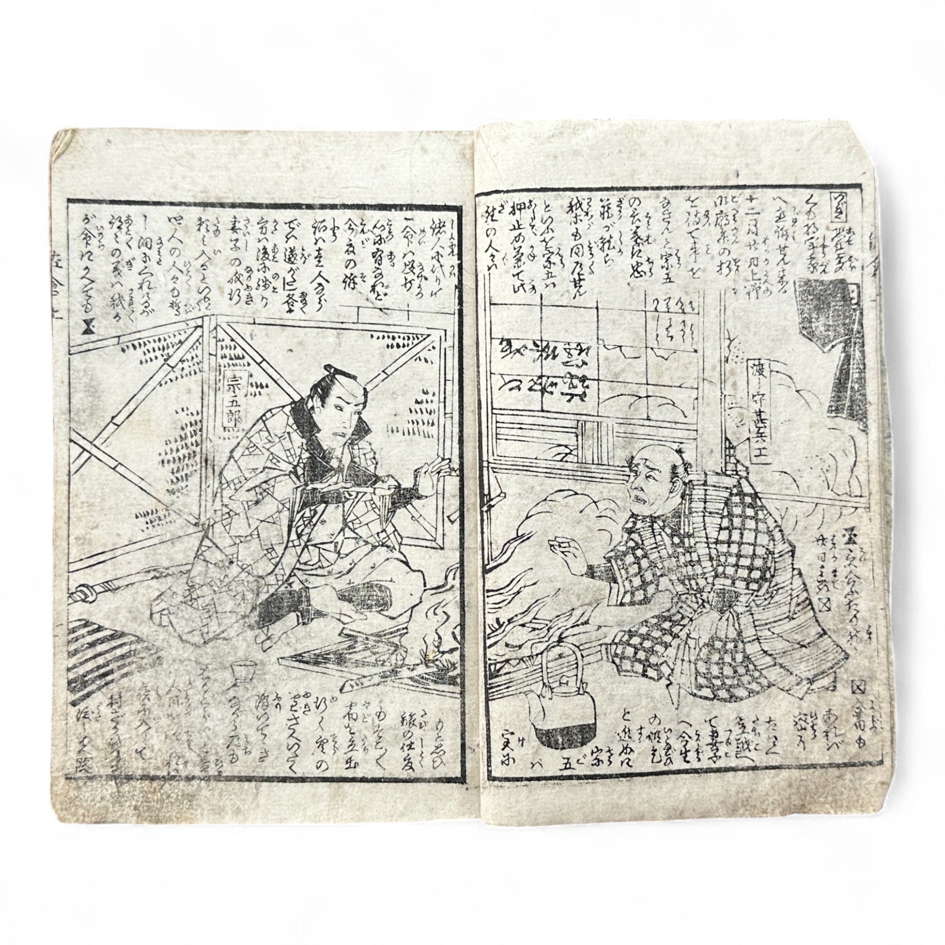 A fascinating Edo-period woodblock-printed book illustrating samurai life, moral tales, and scenes of loyalty, discipline, and duty. This work, bound as a two-volume combined edition, represents the popular samurai-themed illustrated fiction (kibyōshi or gesaku) that flourished in 19th-century Japan.