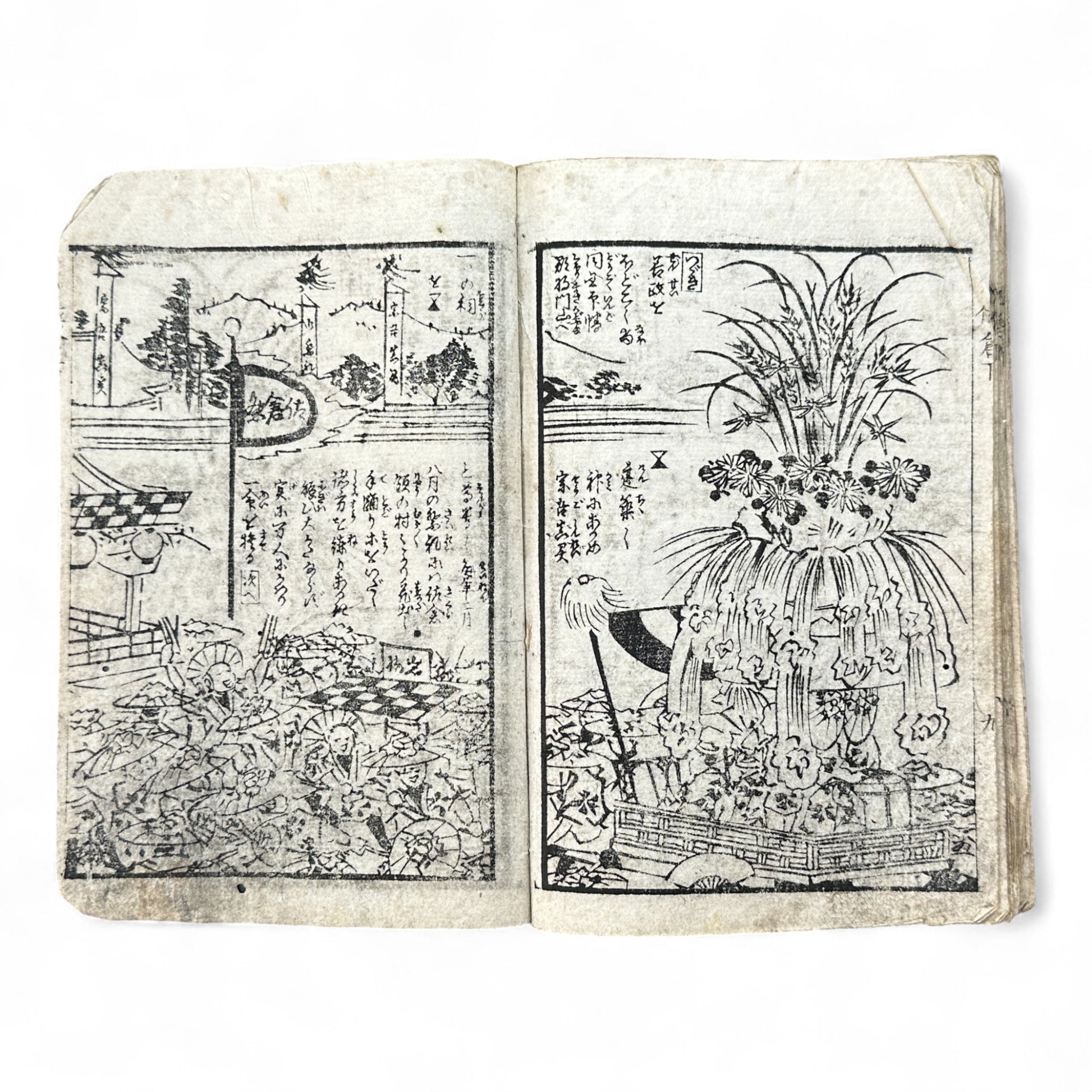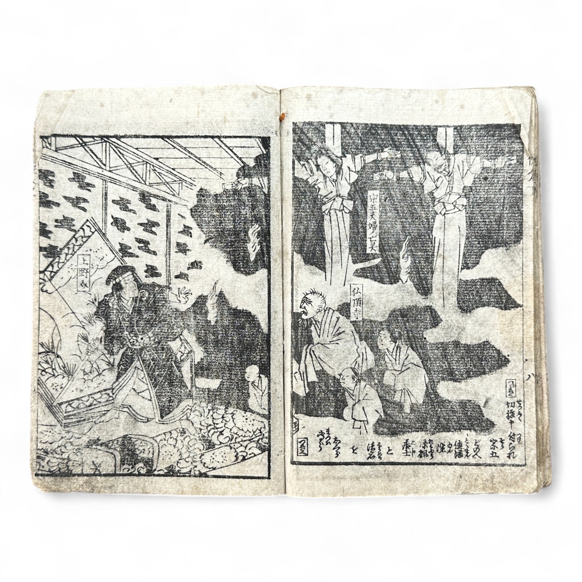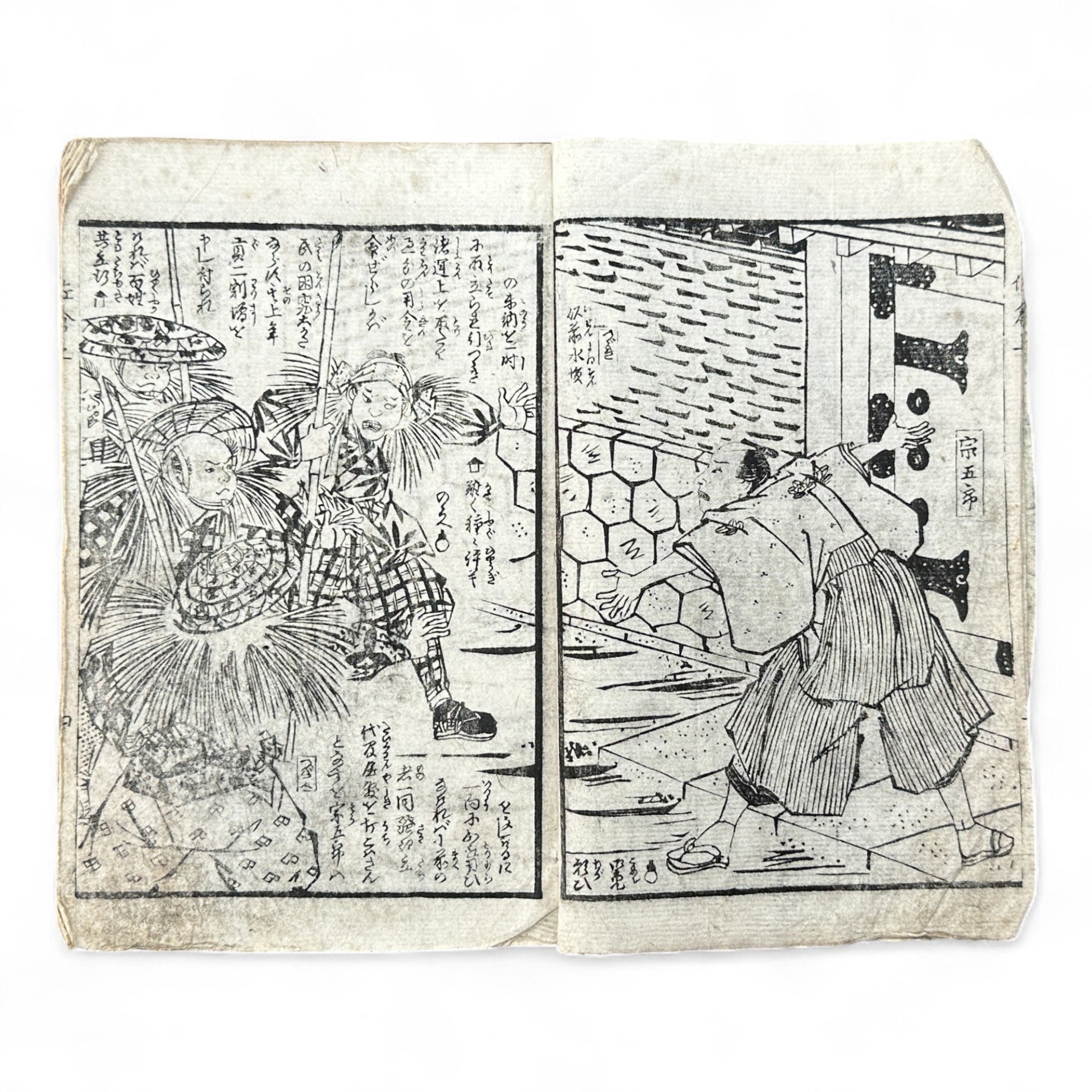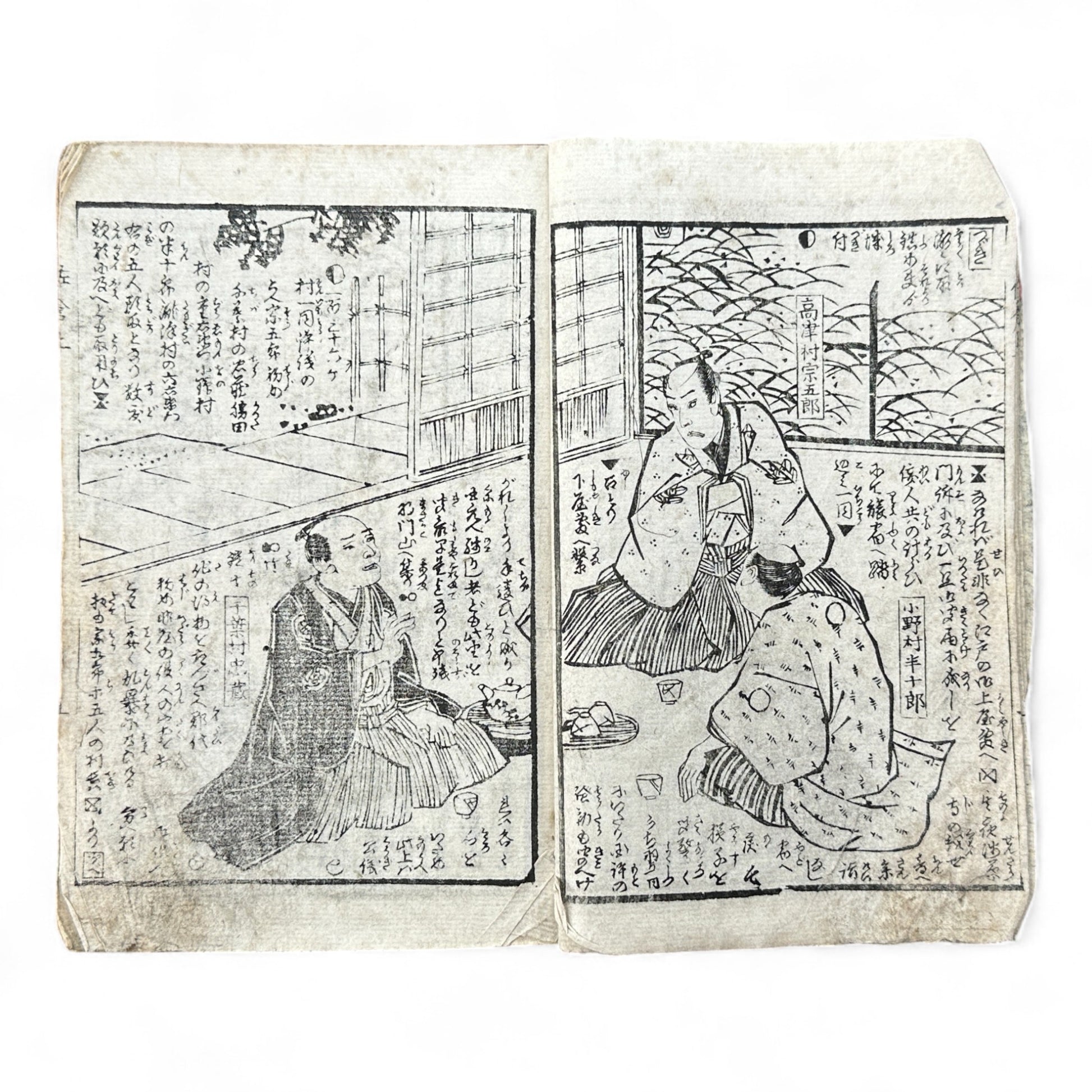 A fascinating Edo-period woodblock-printed book illustrating samurai life, moral tales, and scenes of loyalty, discipline, and duty. This work, bound as a two-volume combined edition, represents the popular samurai-themed illustrated fiction (kibyōshi or gesaku) that flourished in 19th-century Japan.