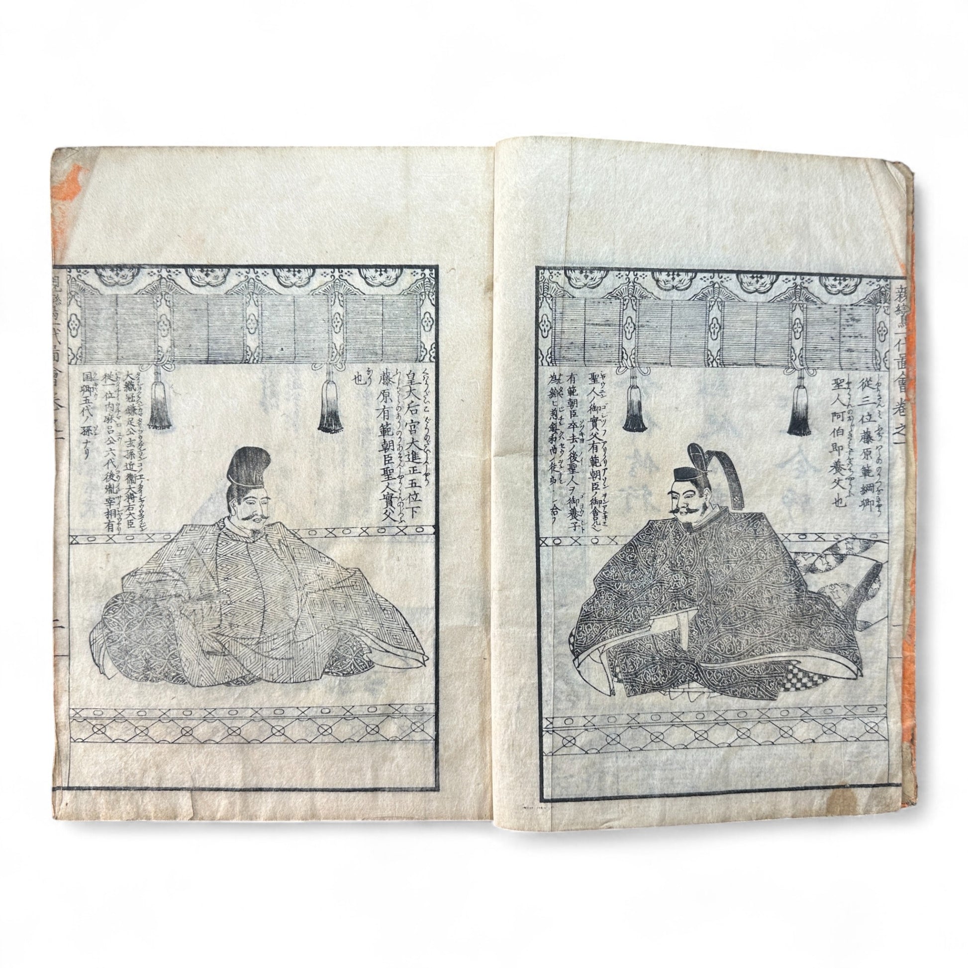 Produced during the late Edo to early Meiji period (circa 1850–1880), this book combines beautiful line-engraved illustrations with detailed textual records of emperors, noble families, and legendary figures.