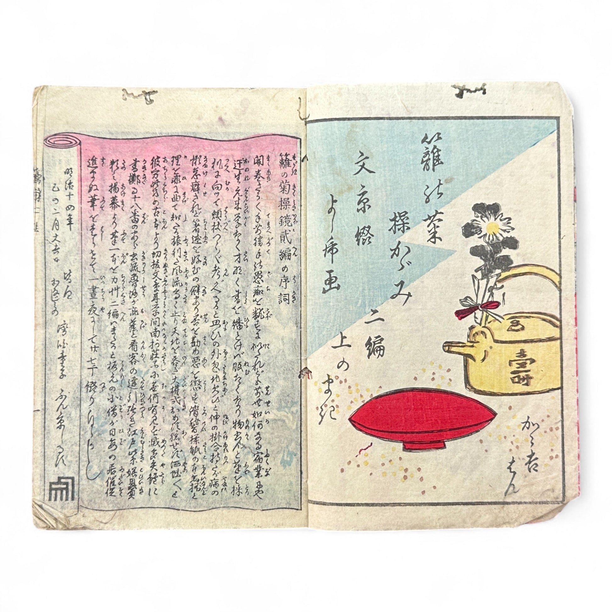 An exquisite Edo-period color-illustrated woodblock-printed book, uniting three volumes into a single bound edition. This work, Hi no Kiku Shirube Kagami — literally “Mirror Guide of the Chrysanthemum of Hi” — belongs to the refined tradition of Edo gesaku (playful literature), combining storytelling, poetry, and ukiyo-e style illustration.