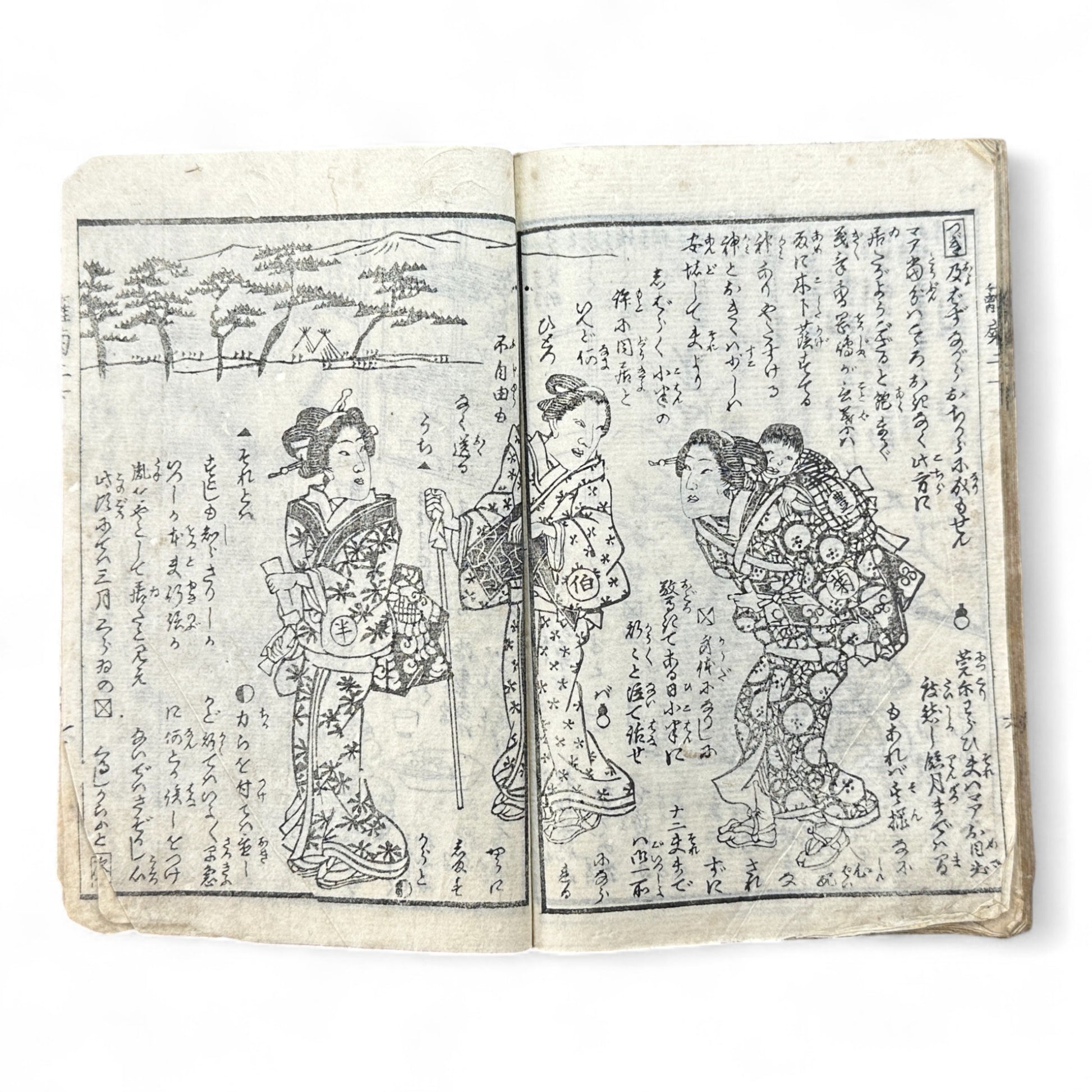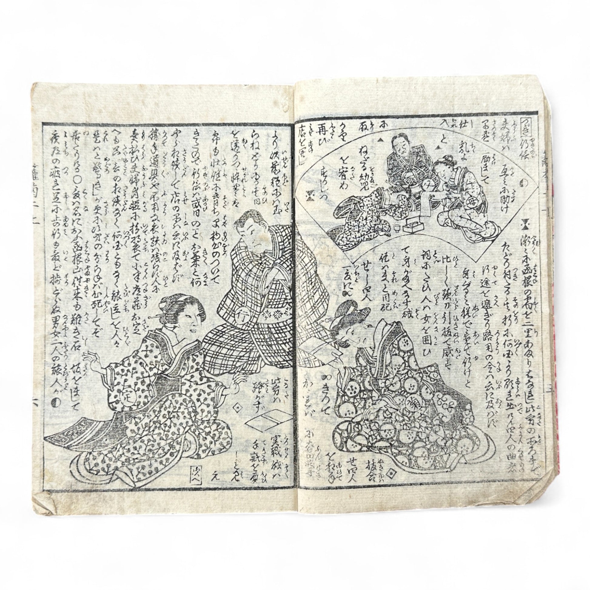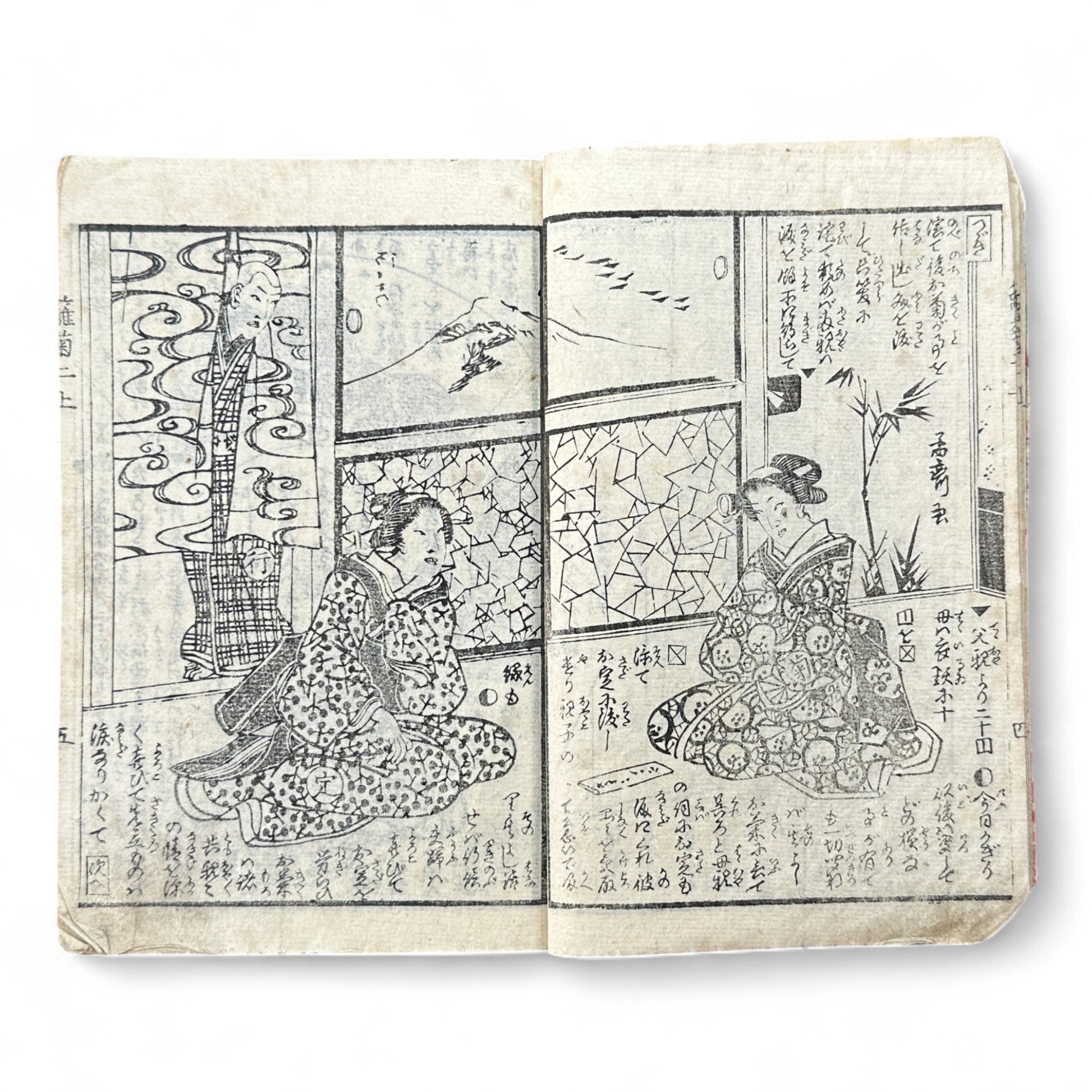 Printed in multi-tone woodblock ink with hand-applied colors, it captures the humor and elegance of everyday life: bijin (beautiful women) at leisure, samurai domestic scenes, and poetic reflections of urban Edo culture. The illustrations, executed with fine linework and vibrant pigments, reveal the charm of late-Edo book design and the fusion of literature with visual art.