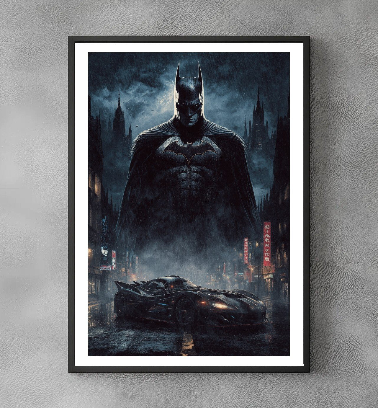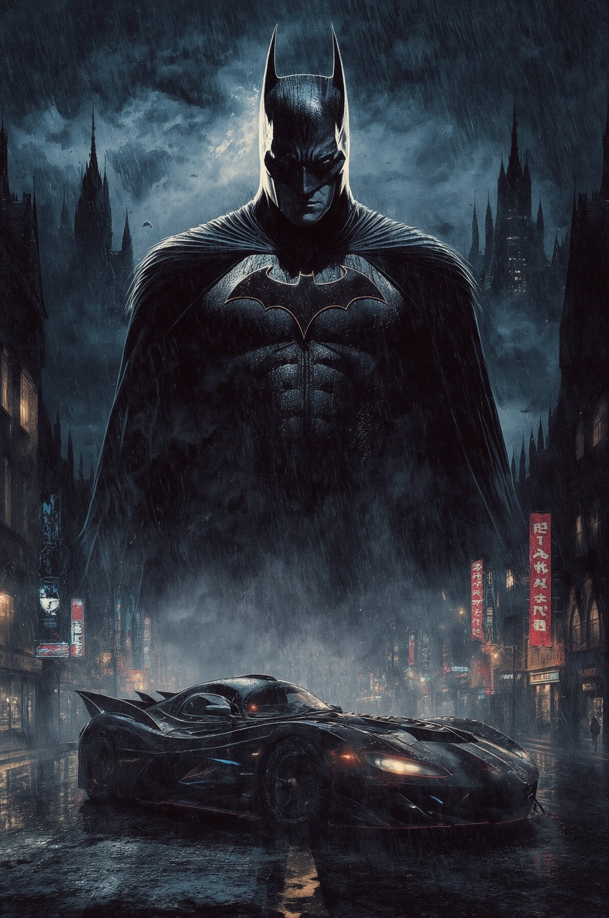A dark, cinematic portrait of Batman standing tall in the rain, with the Batmobile parked on a wet Gotham street below. The moody lighting, towering gothic buildings, and stormy atmosphere create a powerful, heroic presence.