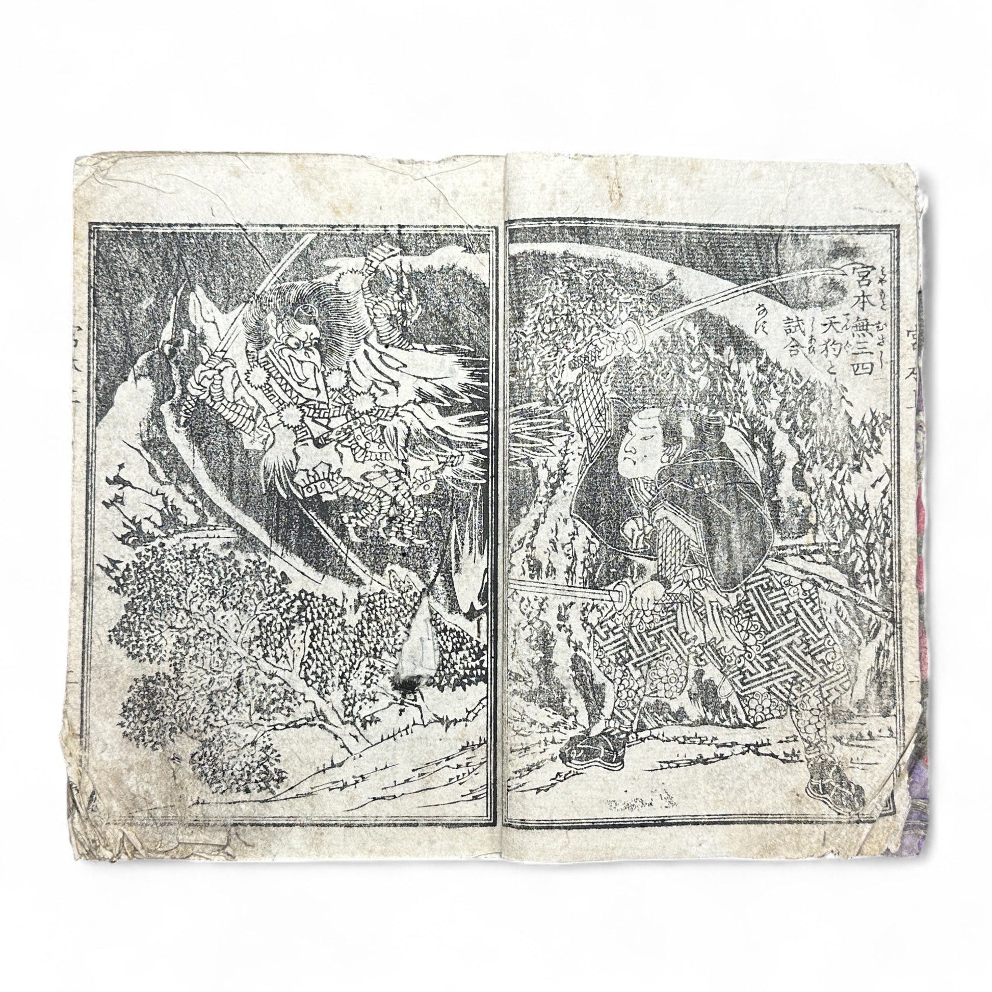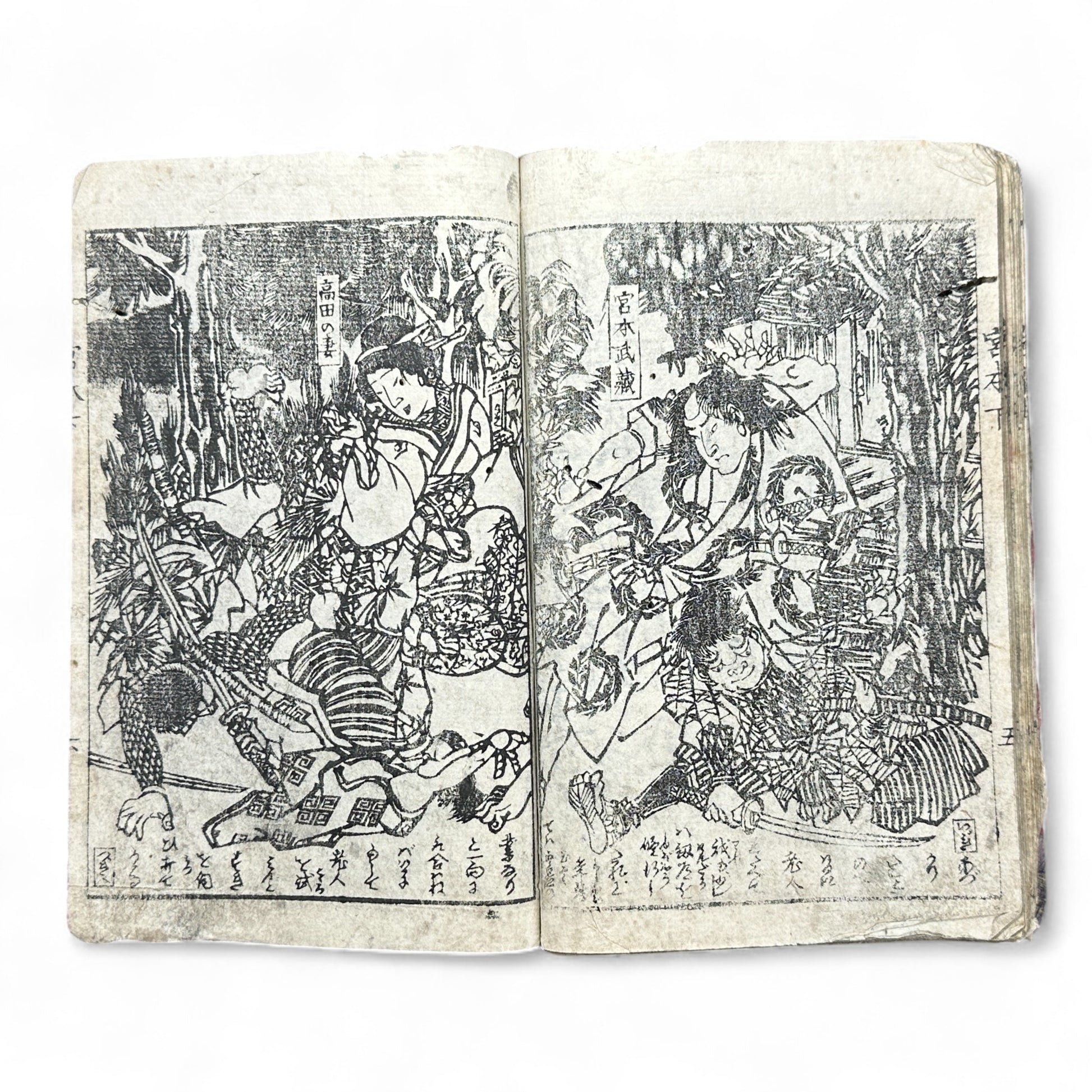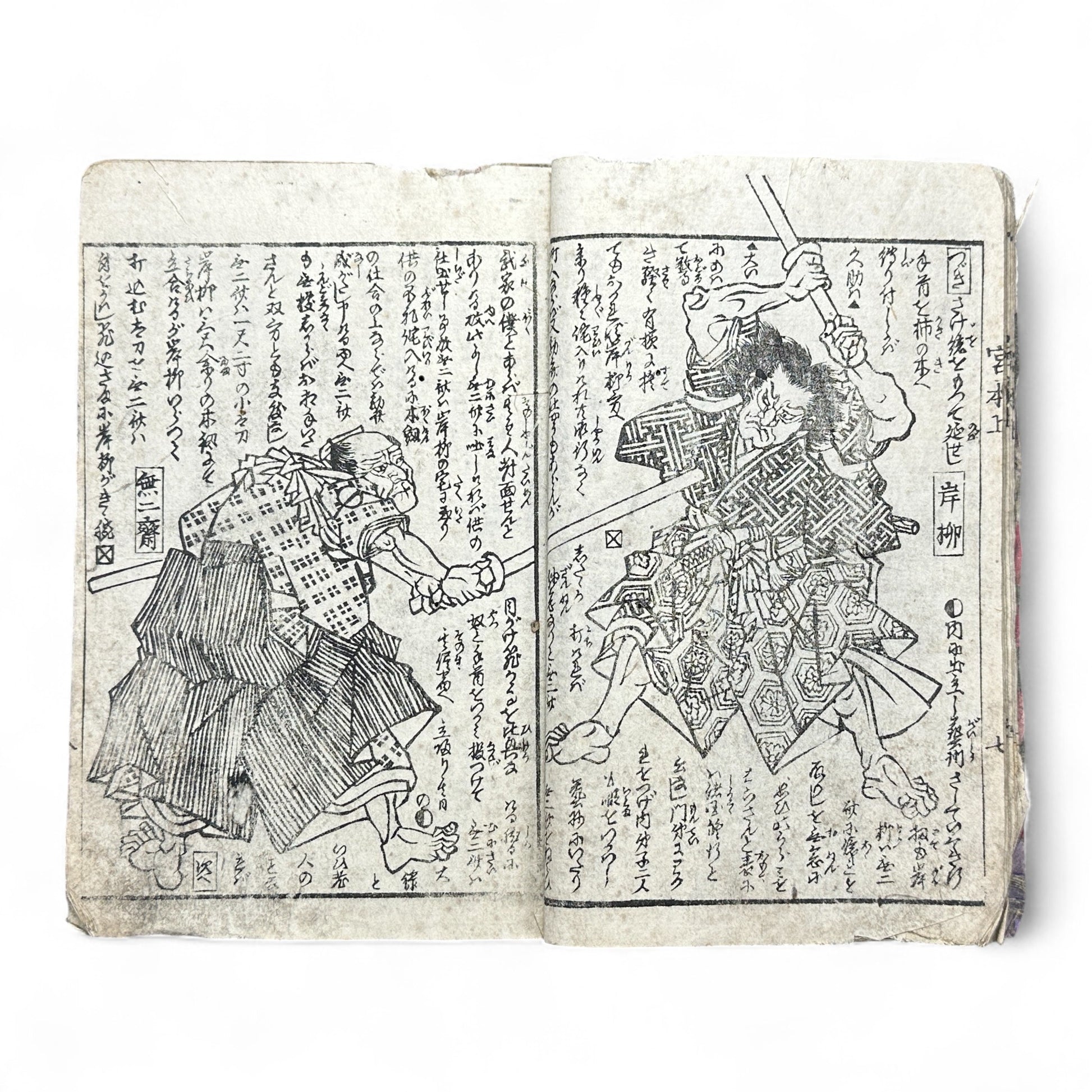 During the late Edo to early Meiji period, samurai hero stories became increasingly popular among common readers. These tales often drew inspiration from legendary swordsmen, framing them in dramatic theatrical style similar to kabuki plays. Printed using traditional woodblock printing techniques, these books were both literary entertainment and visual storytelling artifacts.