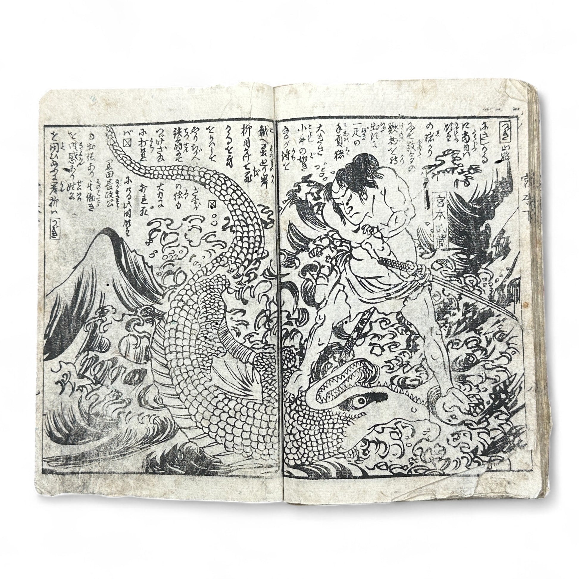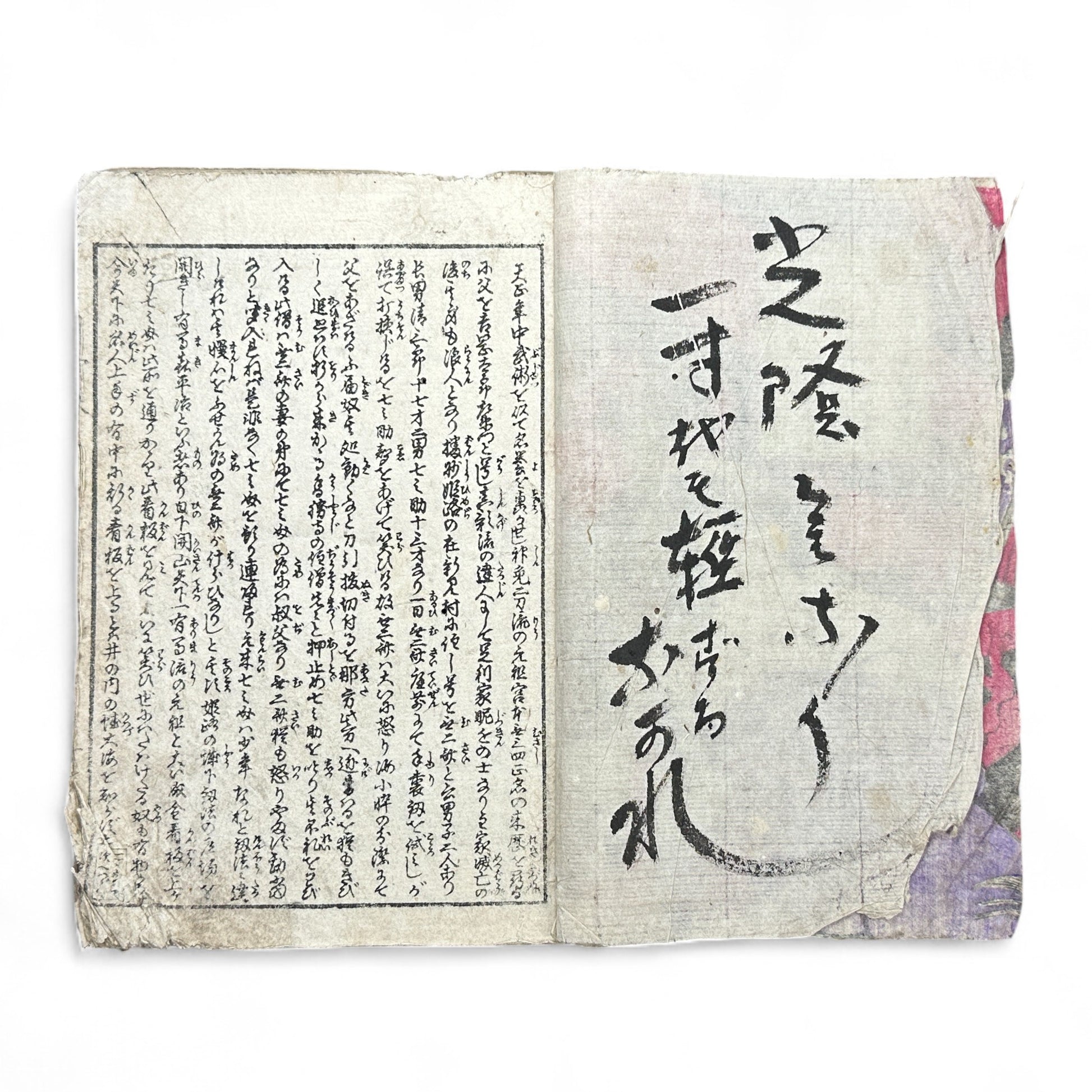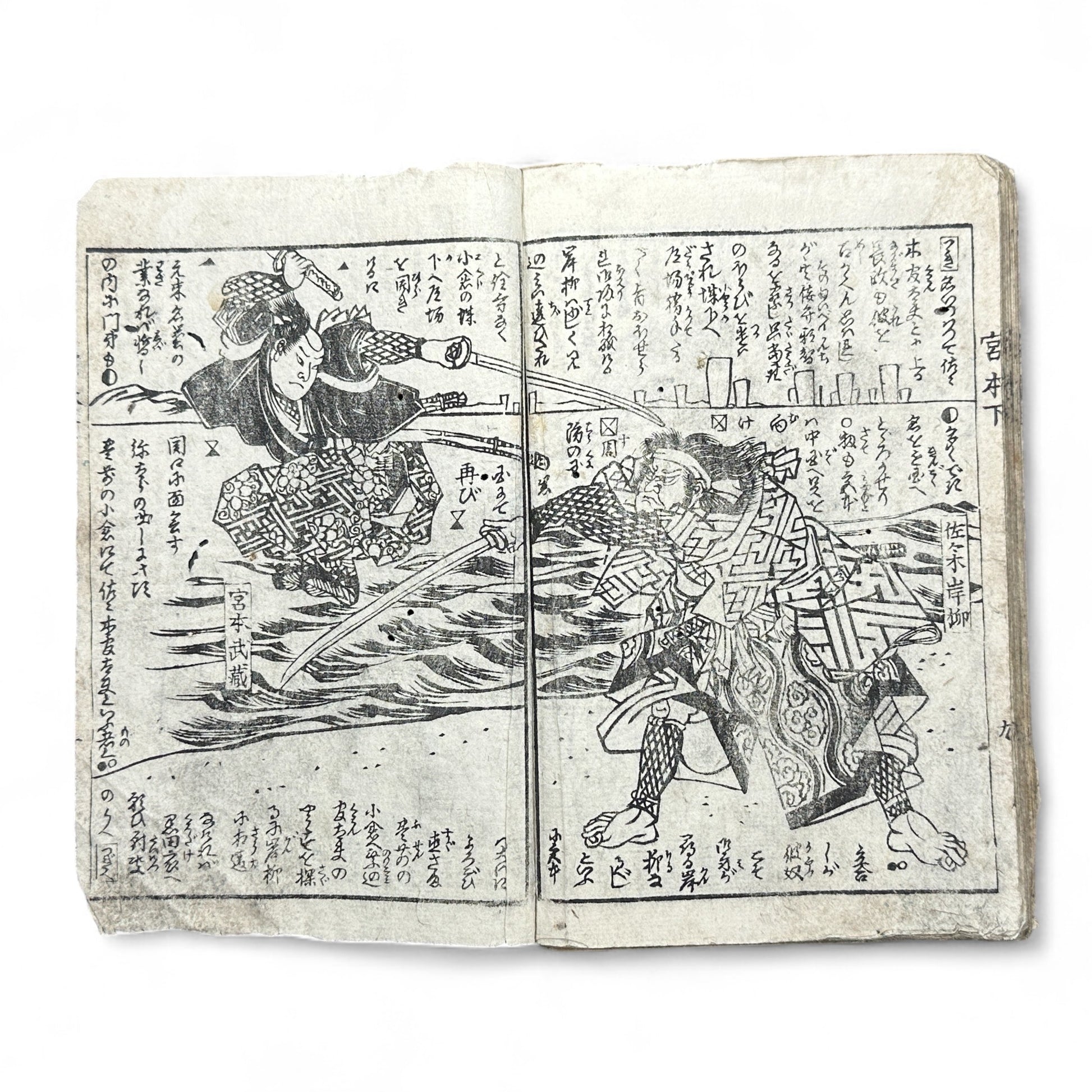 During the late Edo to early Meiji period, samurai hero stories became increasingly popular among common readers. These tales often drew inspiration from legendary swordsmen, framing them in dramatic theatrical style similar to kabuki plays. Printed using traditional woodblock printing techniques, these books were both literary entertainment and visual storytelling artifacts.