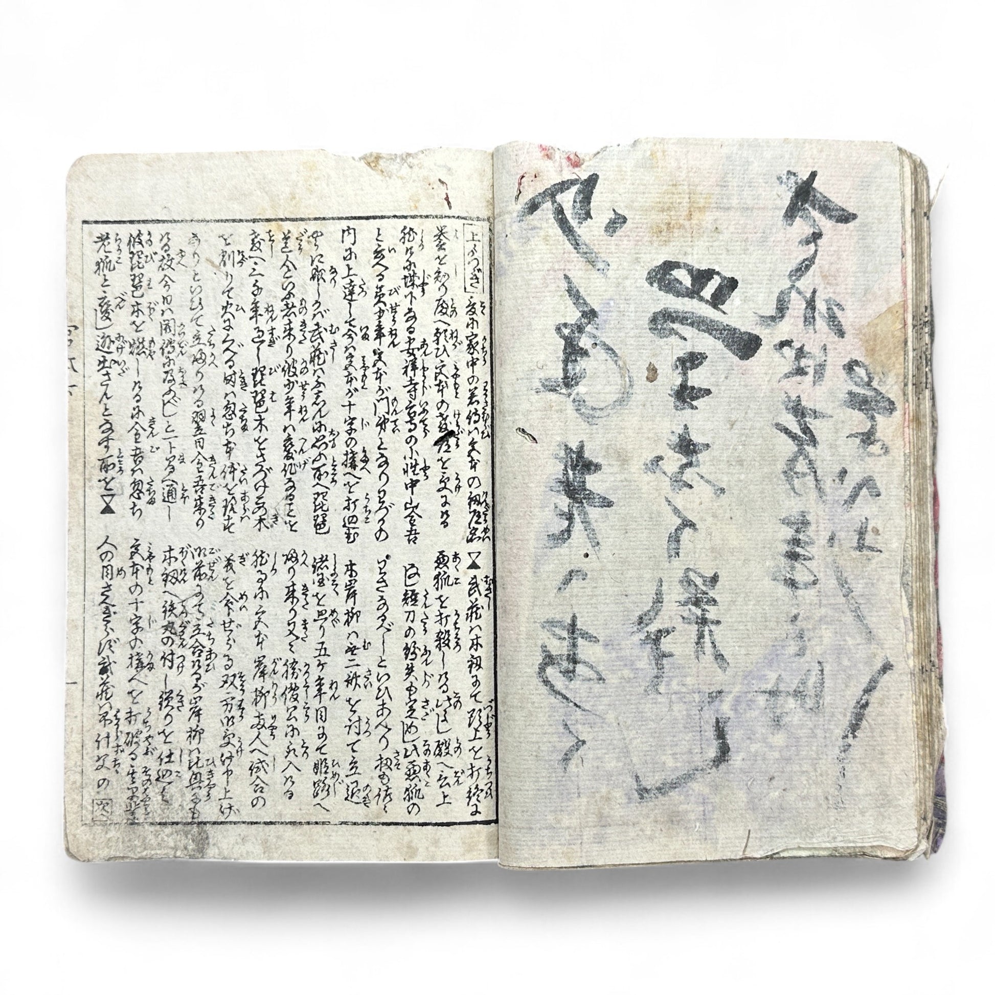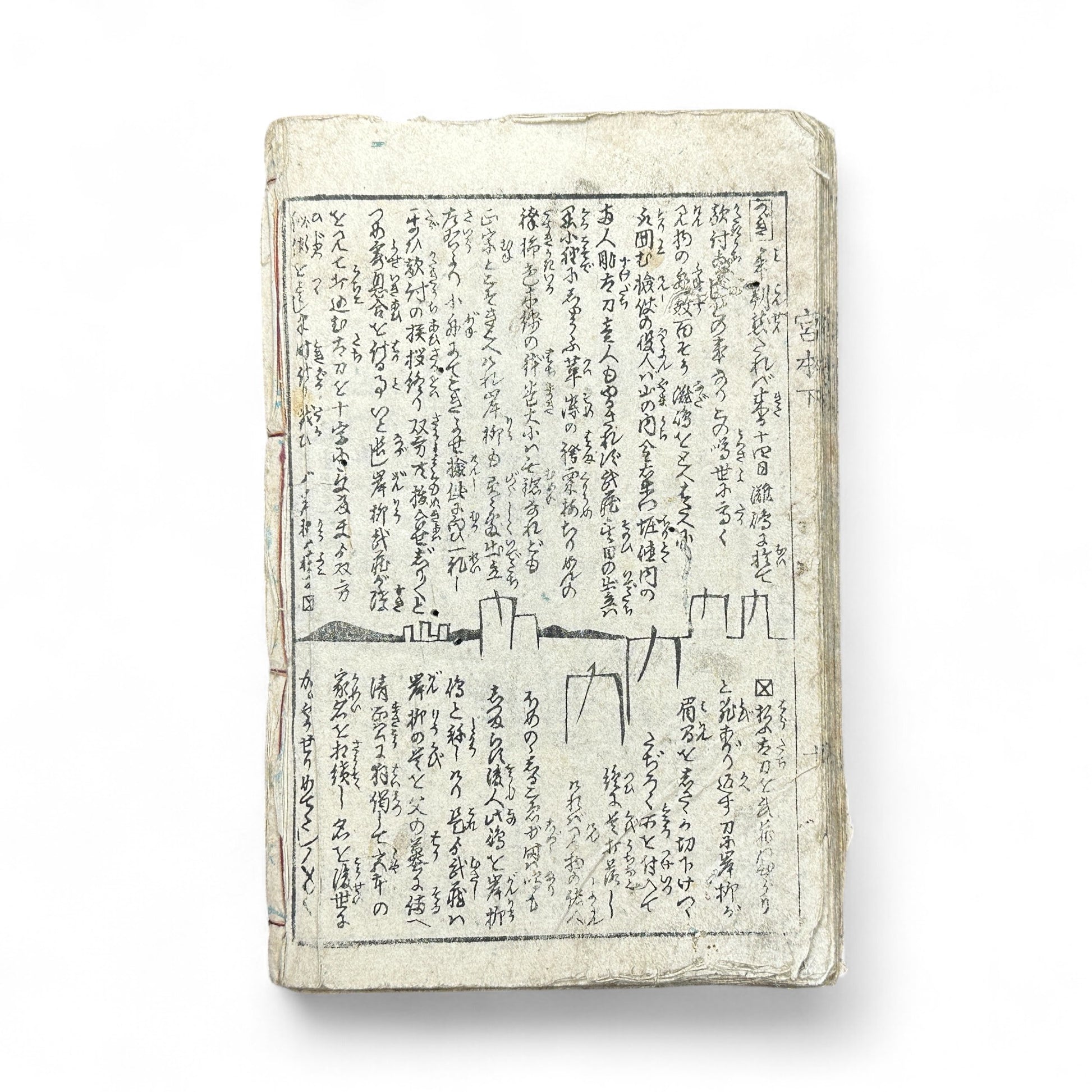 Step into the dramatic world of Japan’s warrior legends with this authentic late Edo-era Japanese samurai illustrated storybook, crafted in the traditional woodblock-printed kusazōshi format. Beautifully bound in classic fukuro-toji (stitched binding), this antique volume features a compelling fusion of narrative prose and expressive ukiyo-e style illustrations, capturing heroic duels, spiritual tension, and emotional intensity typical of the era’s warrior tales.