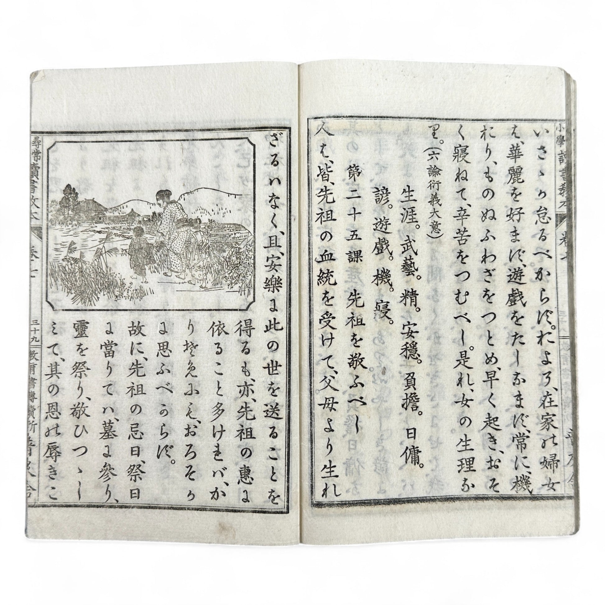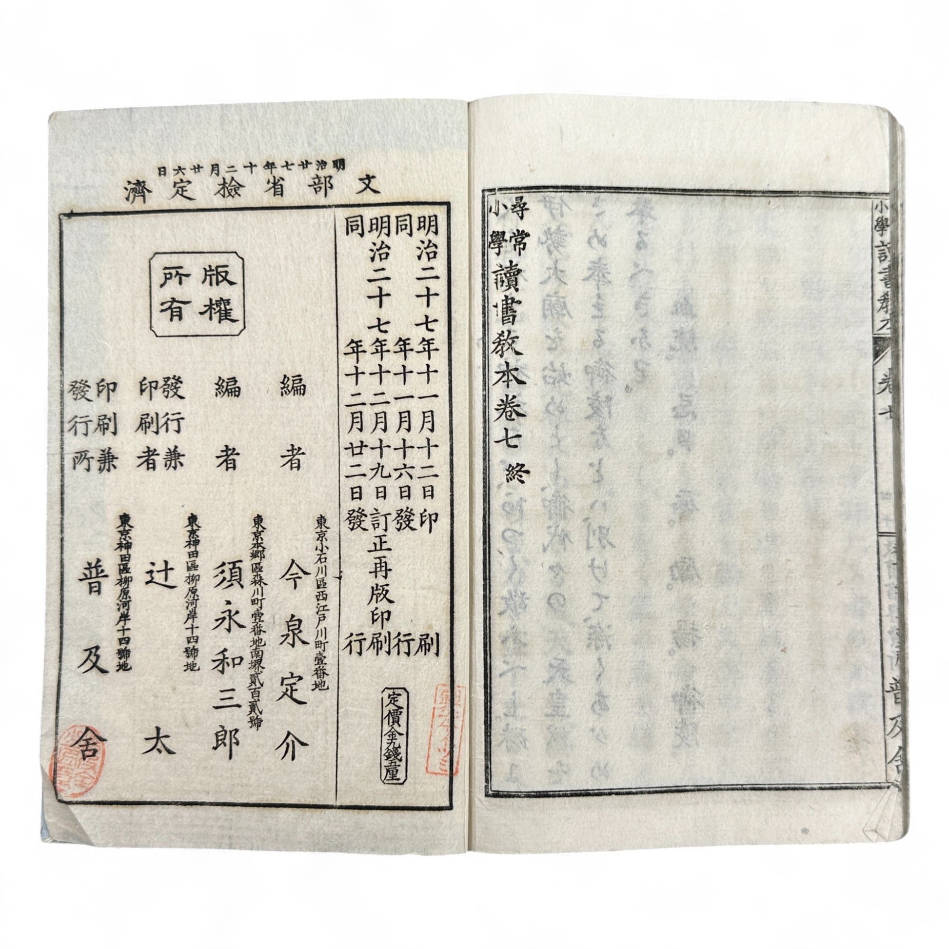 An exceptional survivor from Japan’s Meiji period (1868–1912), this original educational textbook titled Jinjō Shōgaku Dokusho Kyōhon (尋常小学読書教本 – Common Elementary Reading Textbook) Volume 7 reflects the early years of Japan’s modern national education system.
