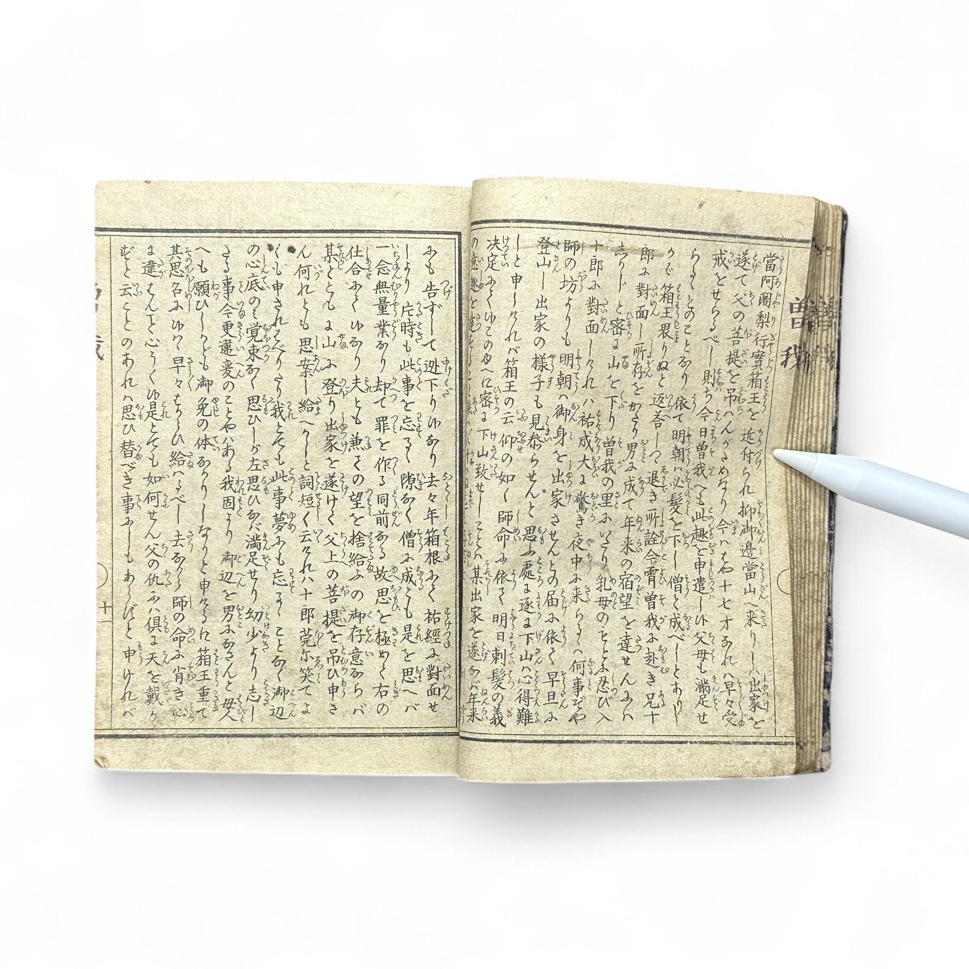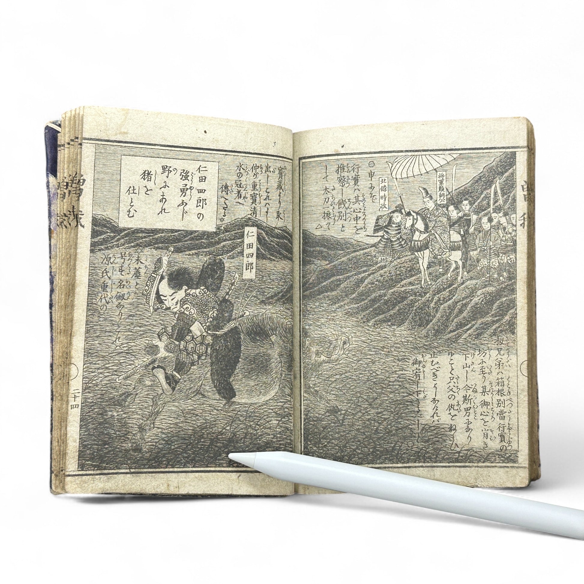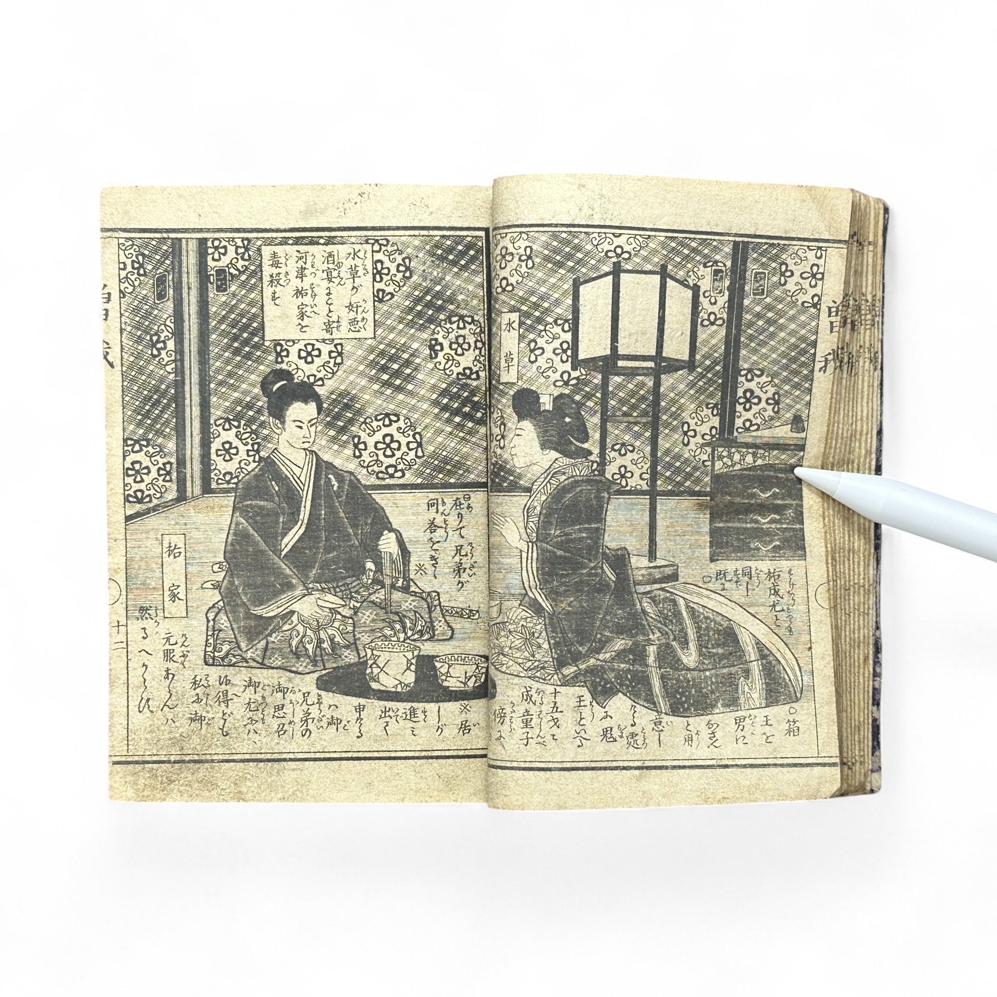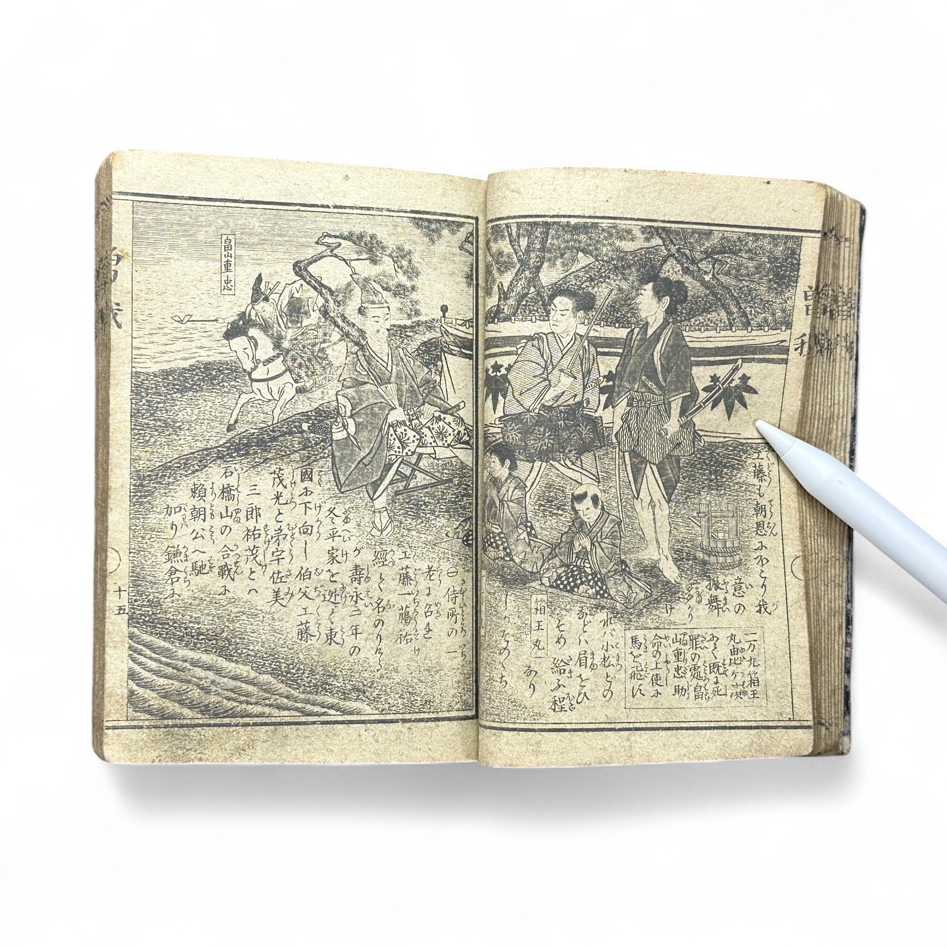 Discover an evocative piece of early modern Japanese literature with this authentic Meiji-era illustrated woodblock storybook, created during a transformative period in Japan’s cultural history. Printed in traditional narrative style, this volume presents a dramatic blend of moral storytelling, samurai-era values, and ukiyo-e inspired illustration, continuing the literary legacy rooted in late Edo popular fiction.