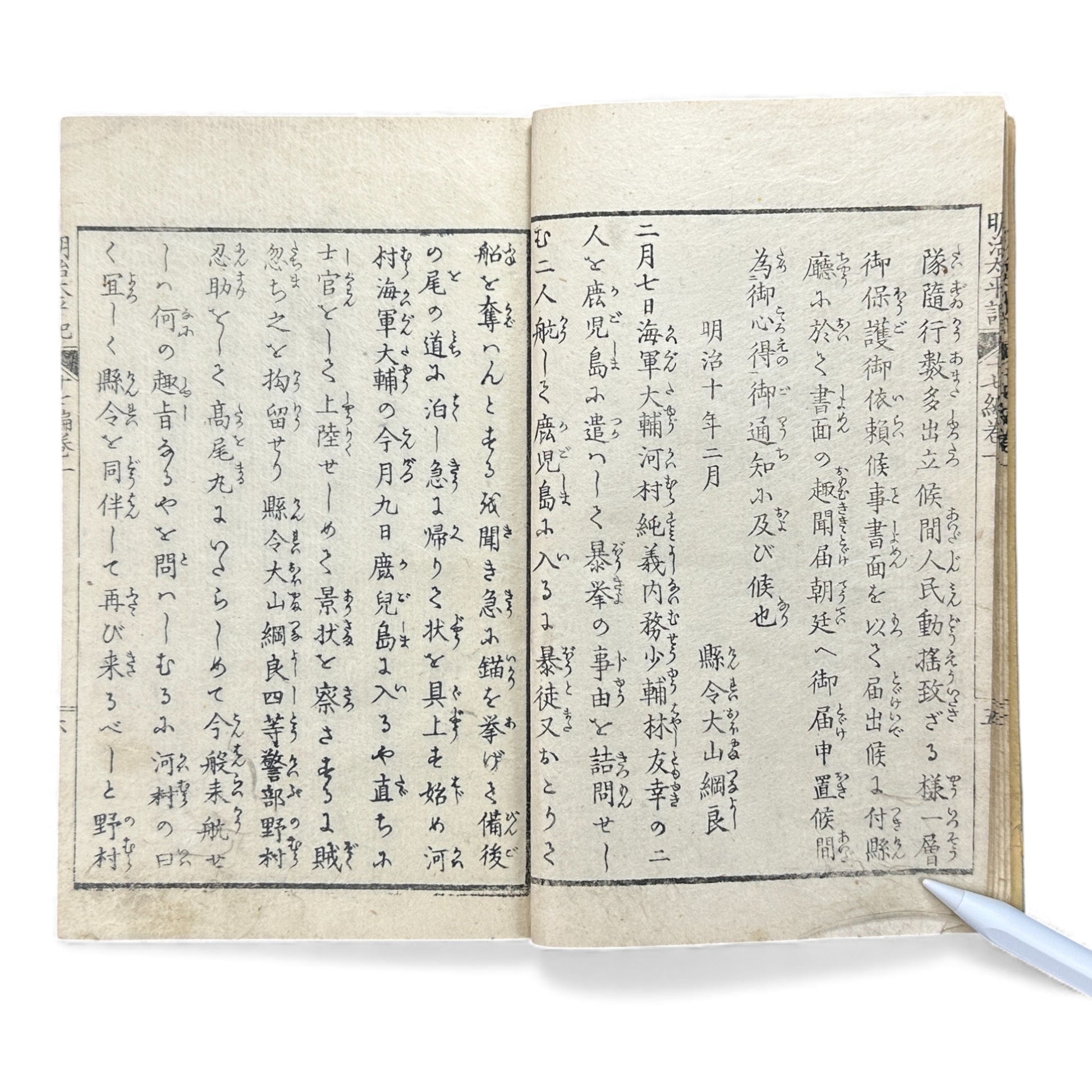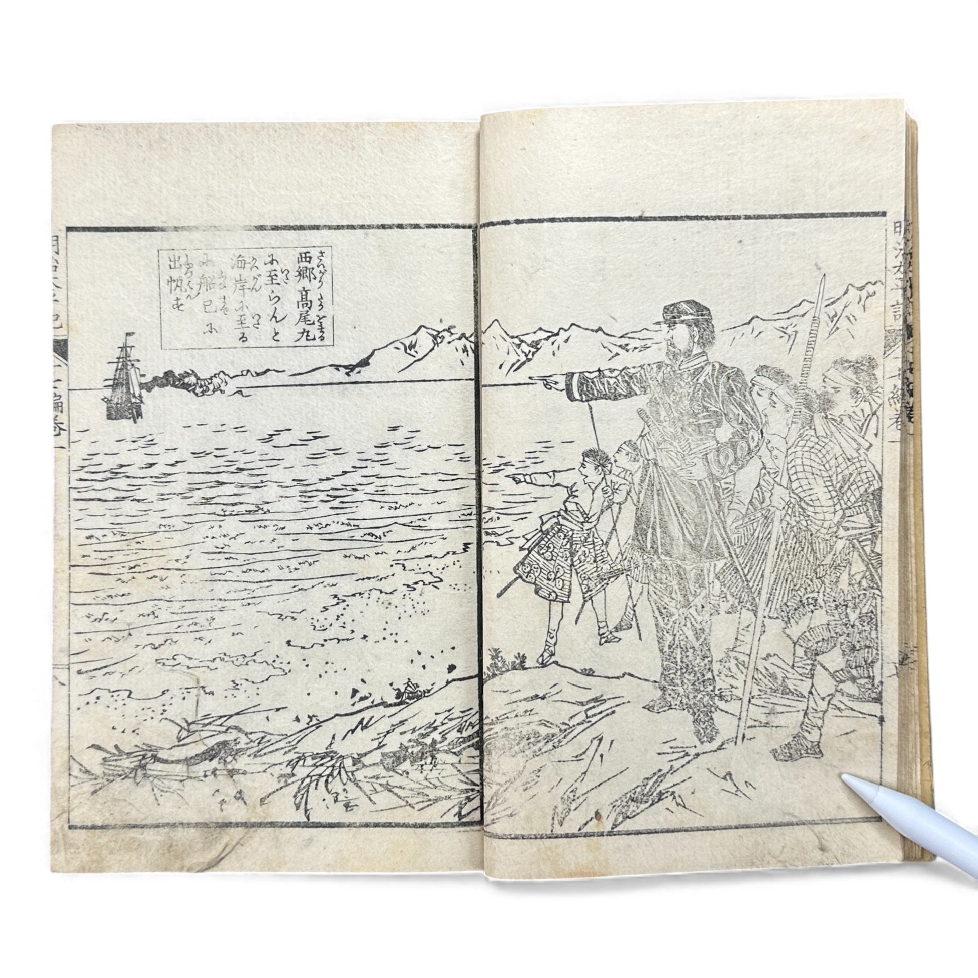 Immerse yourself in the dramatic history of Japan’s Meiji Restoration with this original woodblock-printed volume of Meiji Taiheiki (明治太平記), compiled by Murai Gensai (村井弦齋) and illustrated by Sensai Eitaku (鮮齋永濯) — two of the most prominent cultural figures of the early Meiji period.