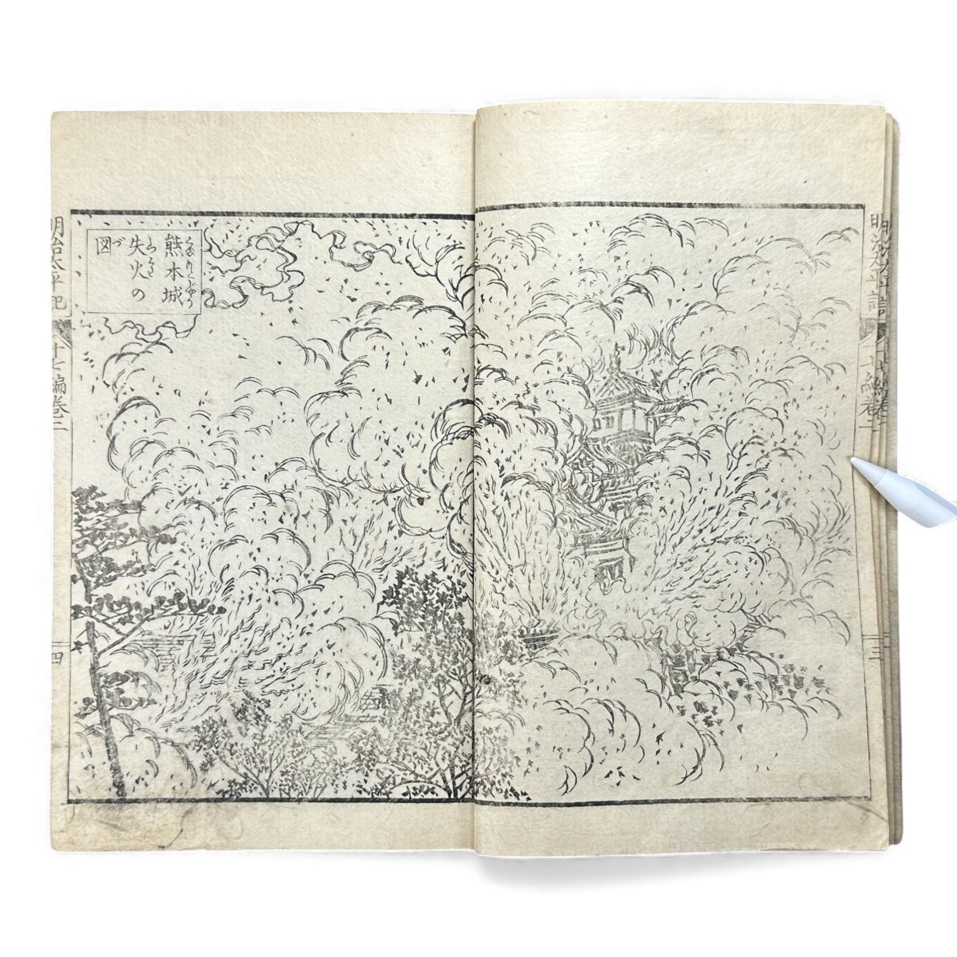 Within these pages are detailed woodblock-printed illustrations depicting the burning of Kumamoto Castle (熊本城焼失の図) and naval warfare scenes, rendered in the emerging Meiji pictorial journalism style that bridged traditional ukiyo-e and modern illustration. The text, printed in kanbun (classical Japanese prose), recounts the bravery, tragedy, and ideological clash that marked the end of Japan’s feudal era.