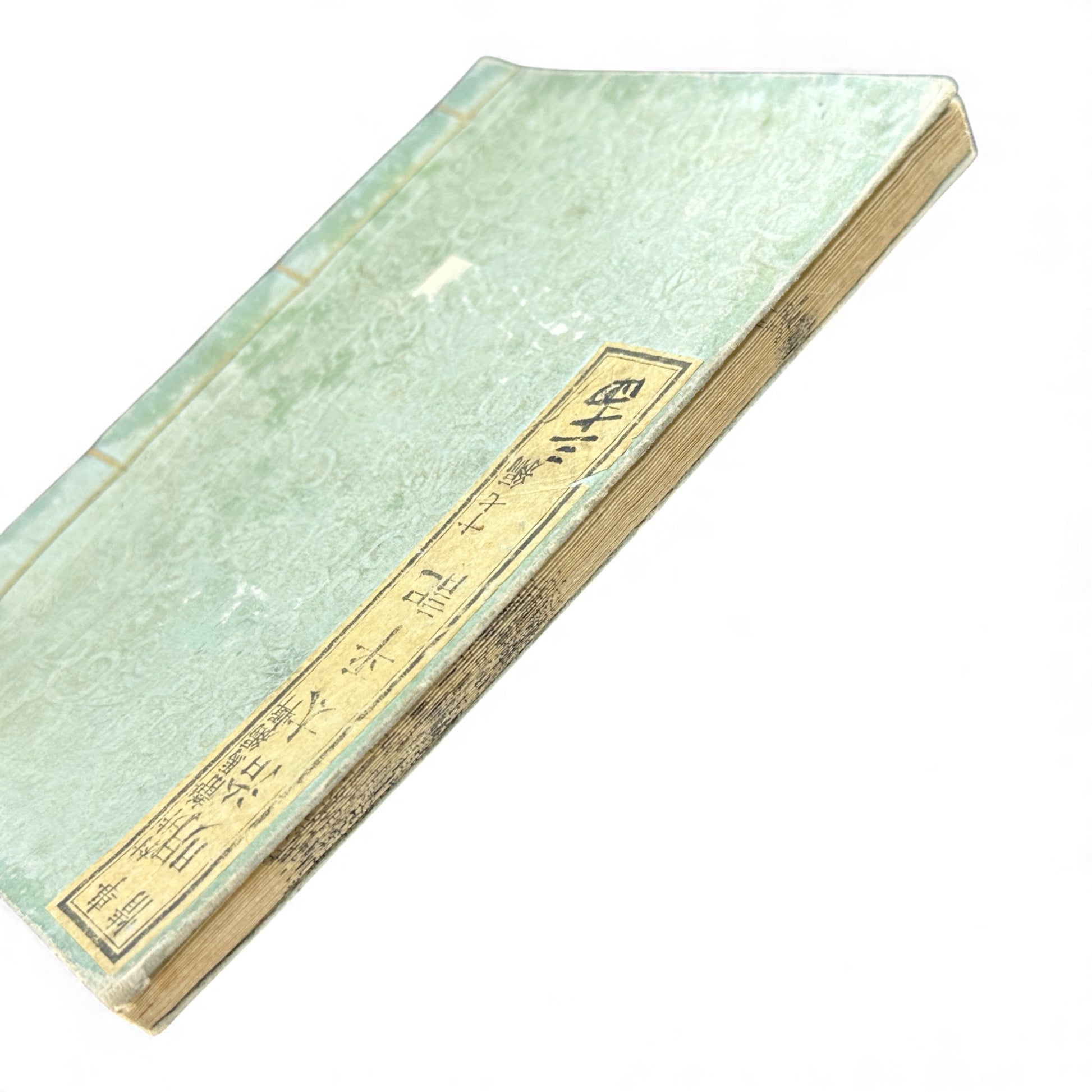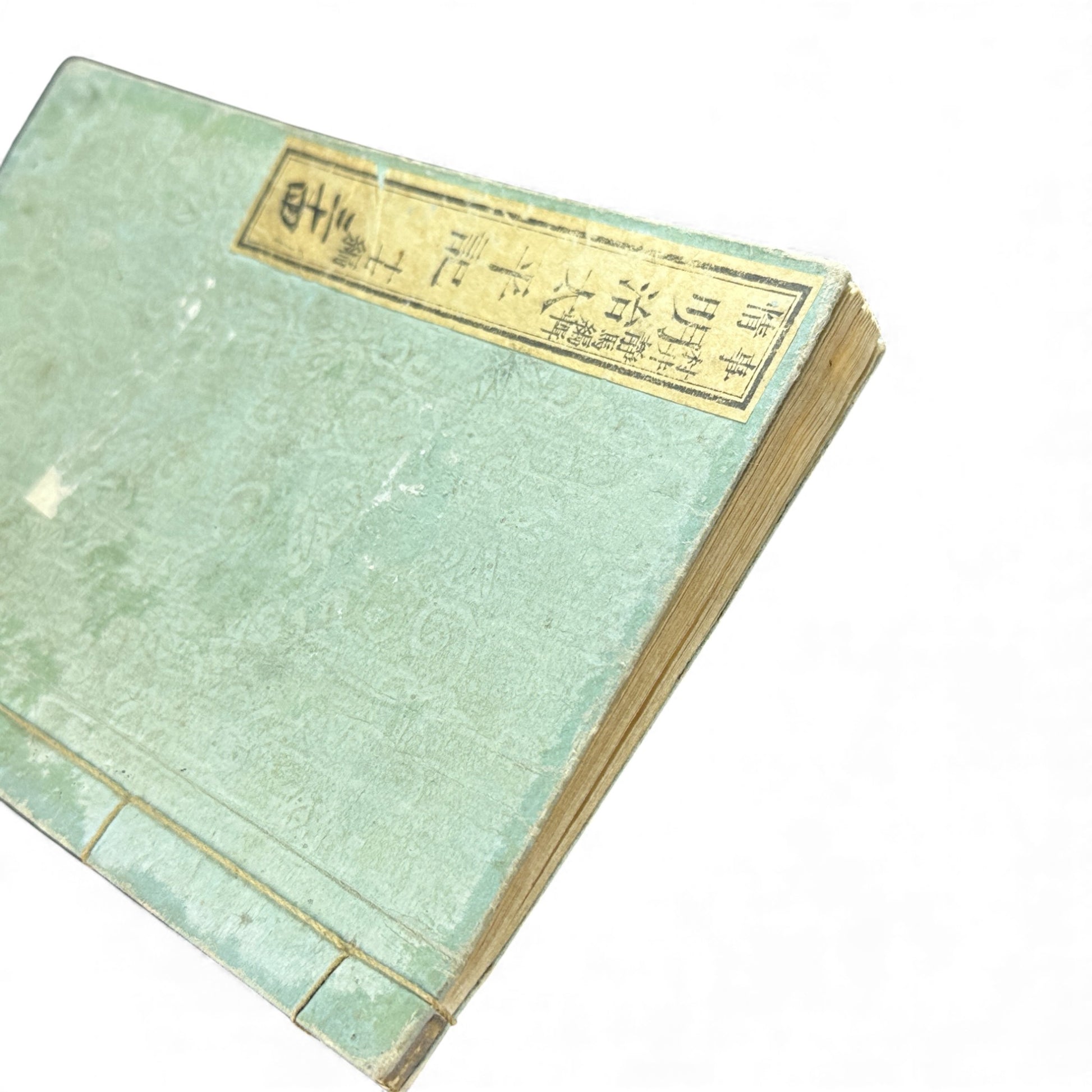 Each page is printed on handmade washi paper and bound in the traditional fukuro-toji (stab binding) style with the original green embossed cover intact. The printing quality and condition of the paper are remarkably well-preserved for its age, with only light wear consistent with 19th-century production.