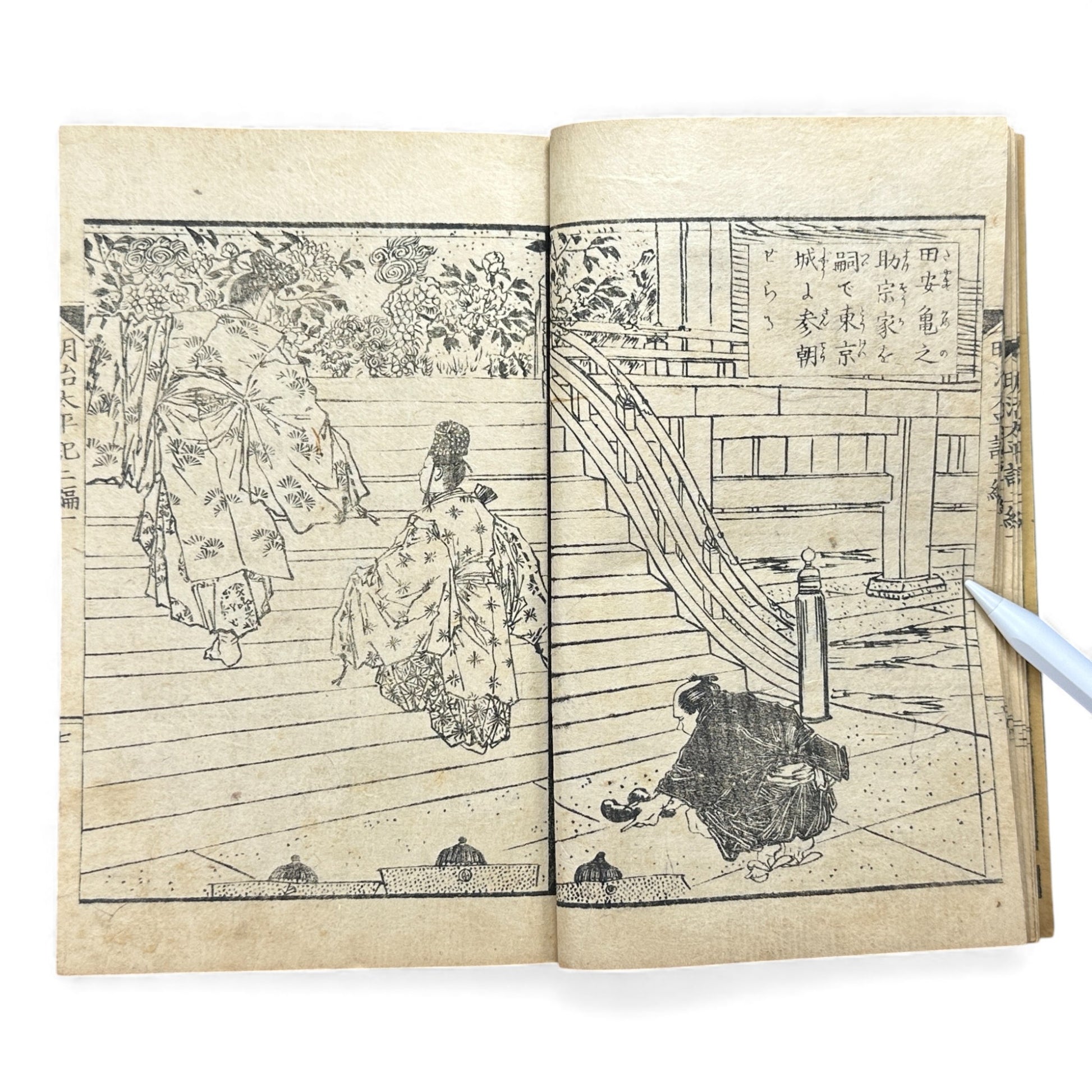 A rare Meiji 8 (1875) illustrated woodblock-printed book from the official series Meiji Taiheiki (明治太平記), written by Murai Gensai (村井弦齋) and illustrated by Sensai Eitaku (鮮齋永濯), published by Enjudō (延壽堂) in Tokyo.