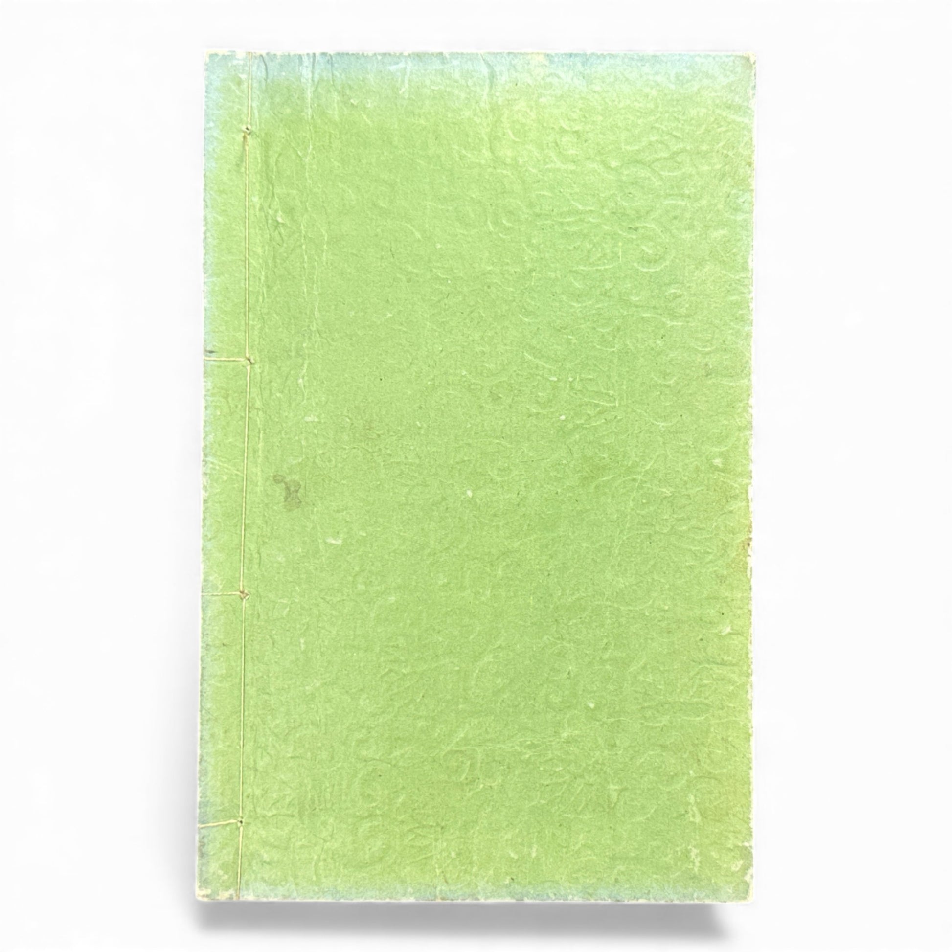 The text is beautifully printed in vertical woodblock format on handmade washi paper, with the original green embossed cover and stab binding (fukurotoji) intact. The paper’s texture and preservation quality highlight the refined printing standards of early Meiji publishing.