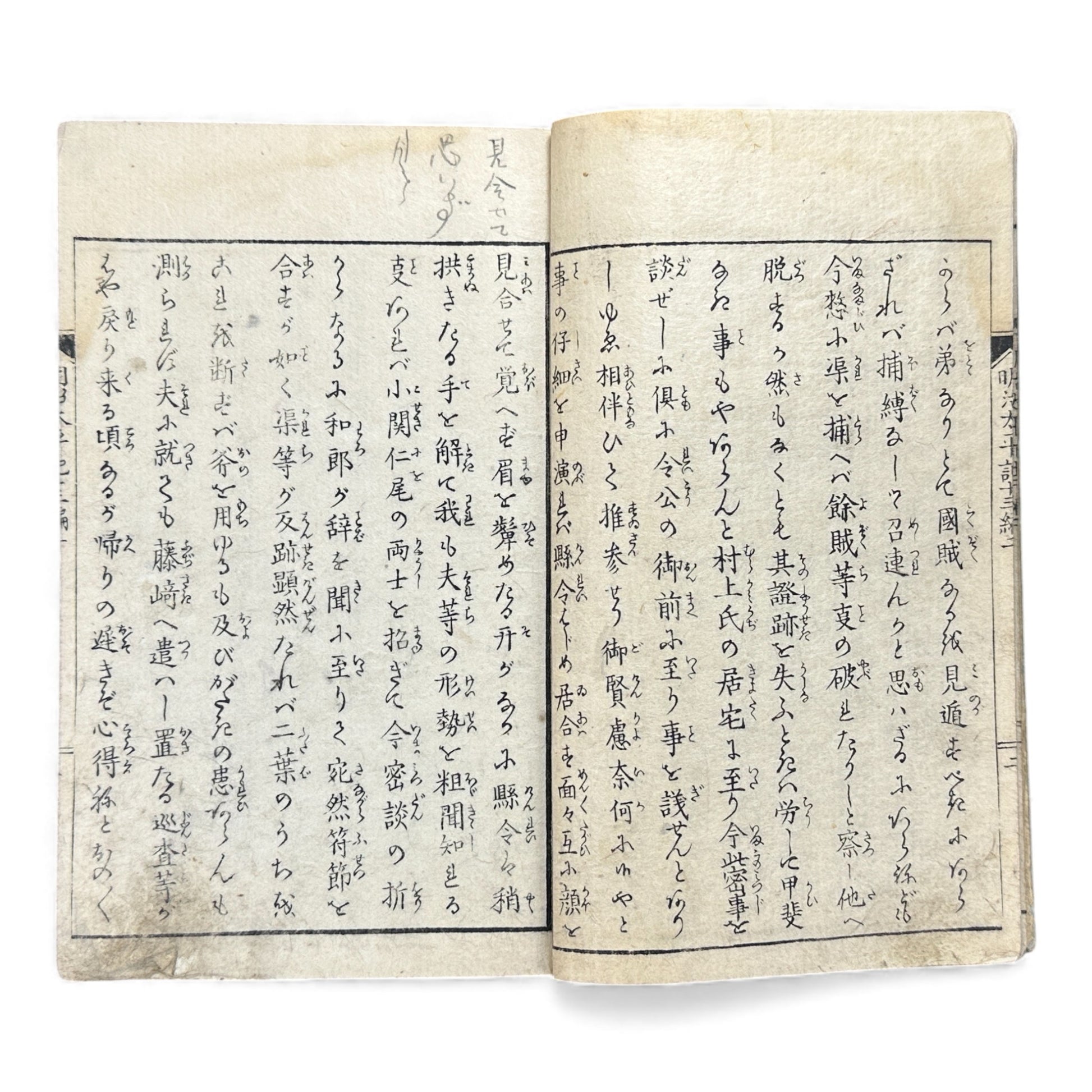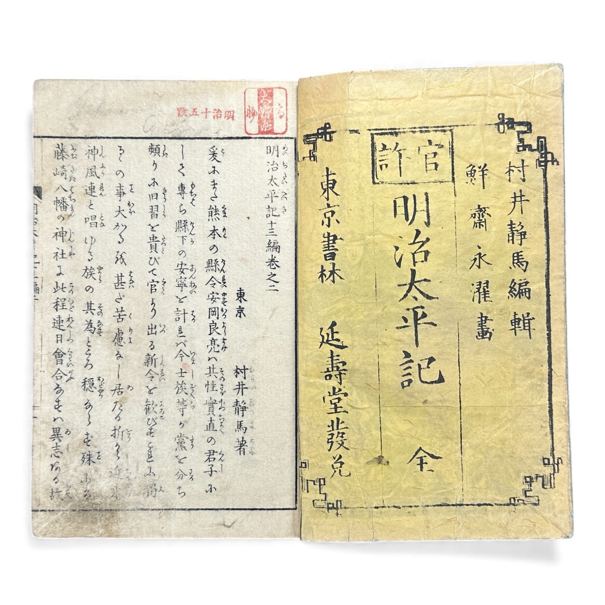 Issued under official permission (“官許”) during a period of strict publication control, Meiji Taiheiki reflects how the new government sought to shape public memory of the Restoration. Today, complete surviving volumes from the 1870s are exceptionally scarce, especially those with intact illustrations and clear text.