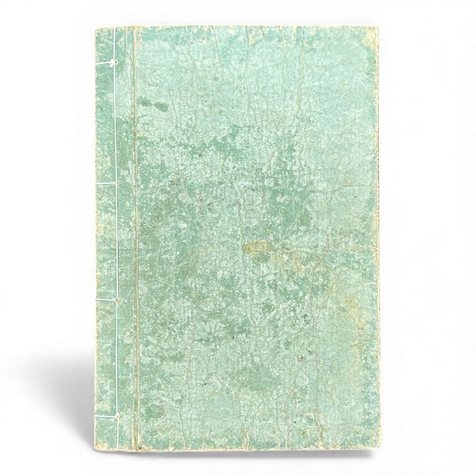 The volume’s woodblock illustrations depict samurai confrontations, espionage, and duels, rendered in expressive linework that merges traditional ukiyo-e aesthetics with the emerging realism of the Meiji era. Each page is printed on handmade washi paper in vertical script and bound in the classic fukuro-toji (stab-bound) format, retaining its original green embossed cover.